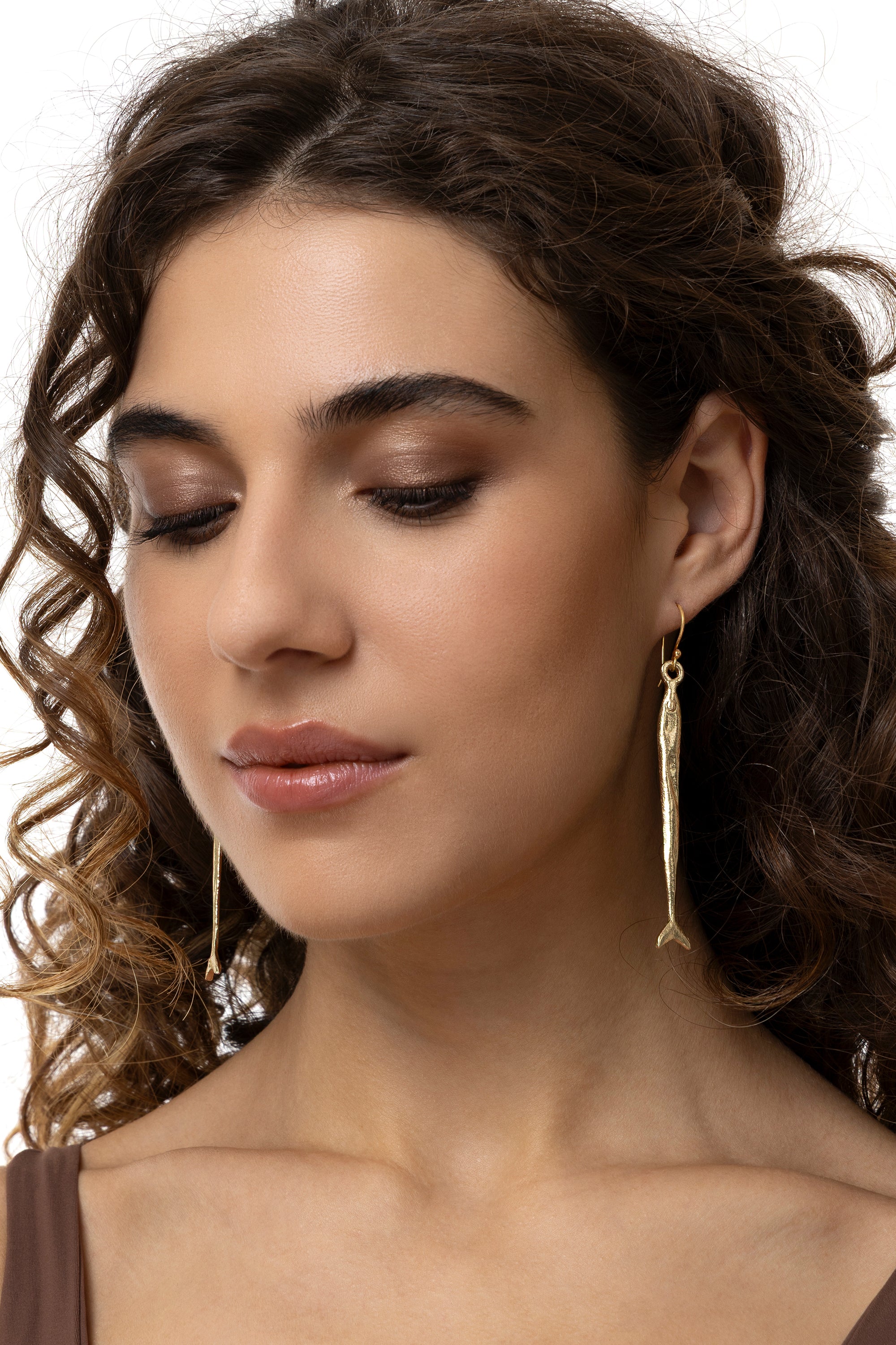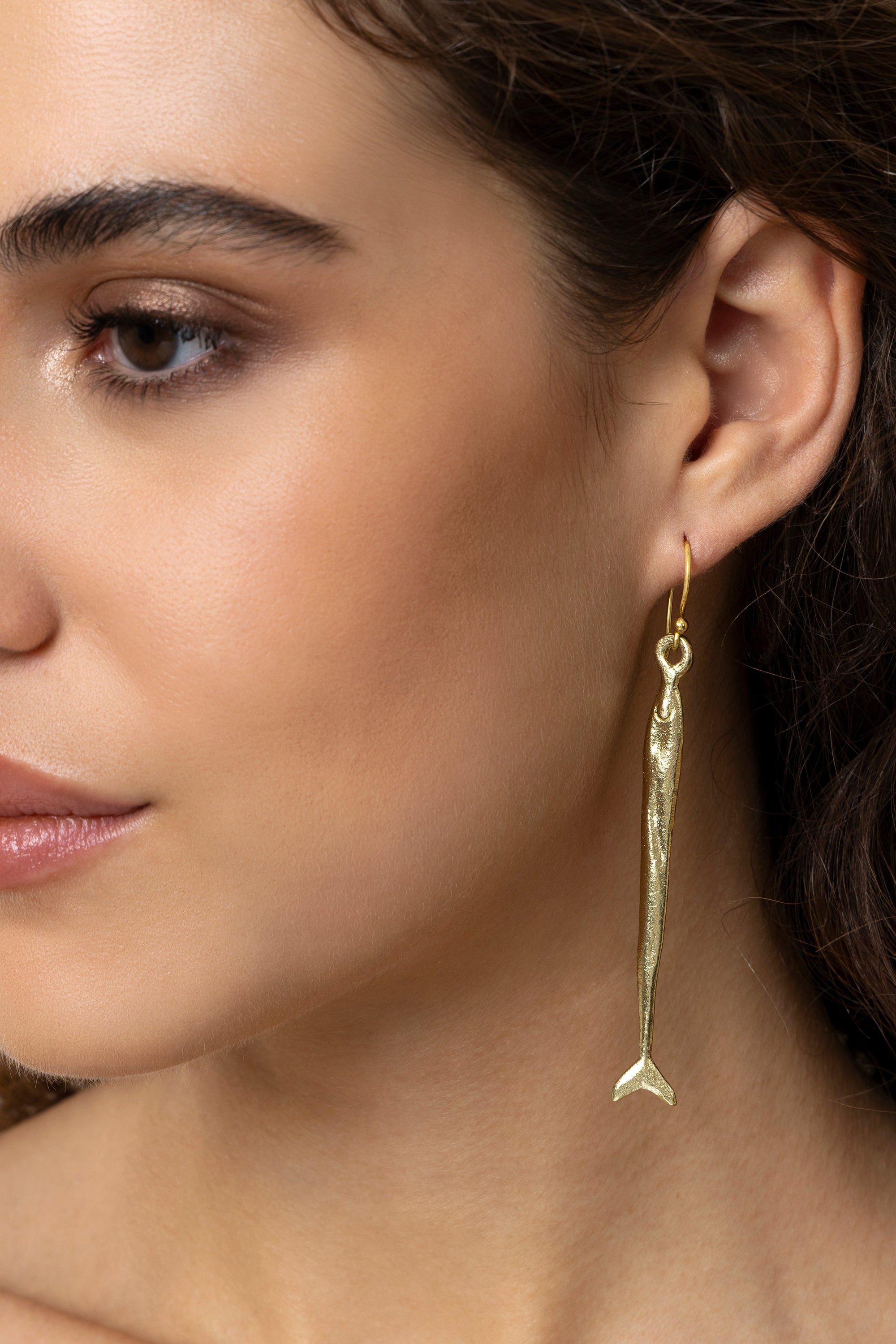 These fish-shaped drop earrings have a tapered design and satin finish, reminiscent of a sardine. The slim line ensures comfort and movement, discreetly reflecting the golden light. Wear them with the matching ?Fish Necklace?. Length 7.5 cm. Hook fastening. Handmade. Nickel tested.
