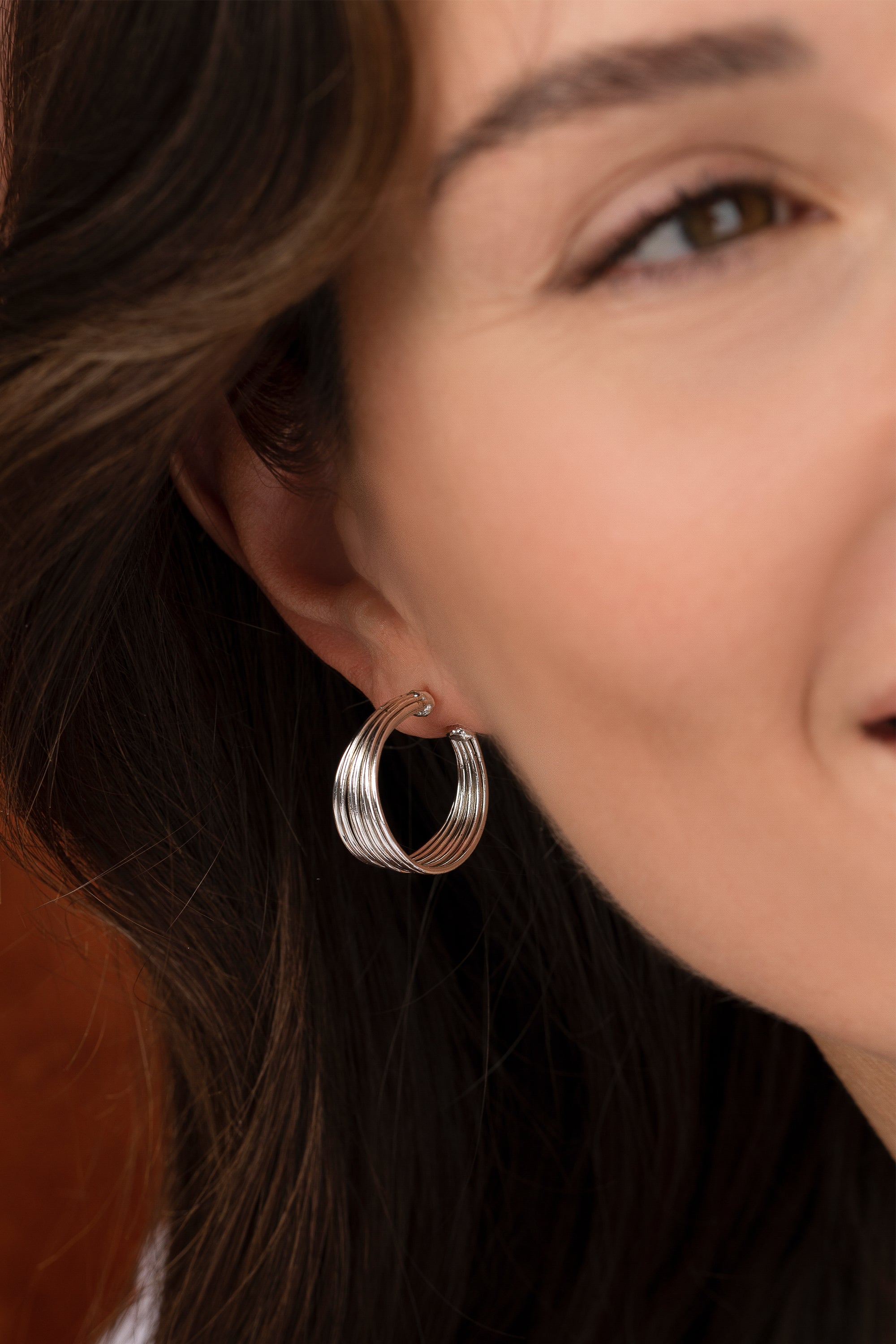 Clean and contemporary design: c-hoops built from layered polished wires. Ideal with blazers and shirts; perfect day-to-night. Butterfly back closure. Material: 100% handcrafted silver plating. Nickel tested. Handmade, unique, handcrafted jewelry perfect for all your looks or as a gift idea.