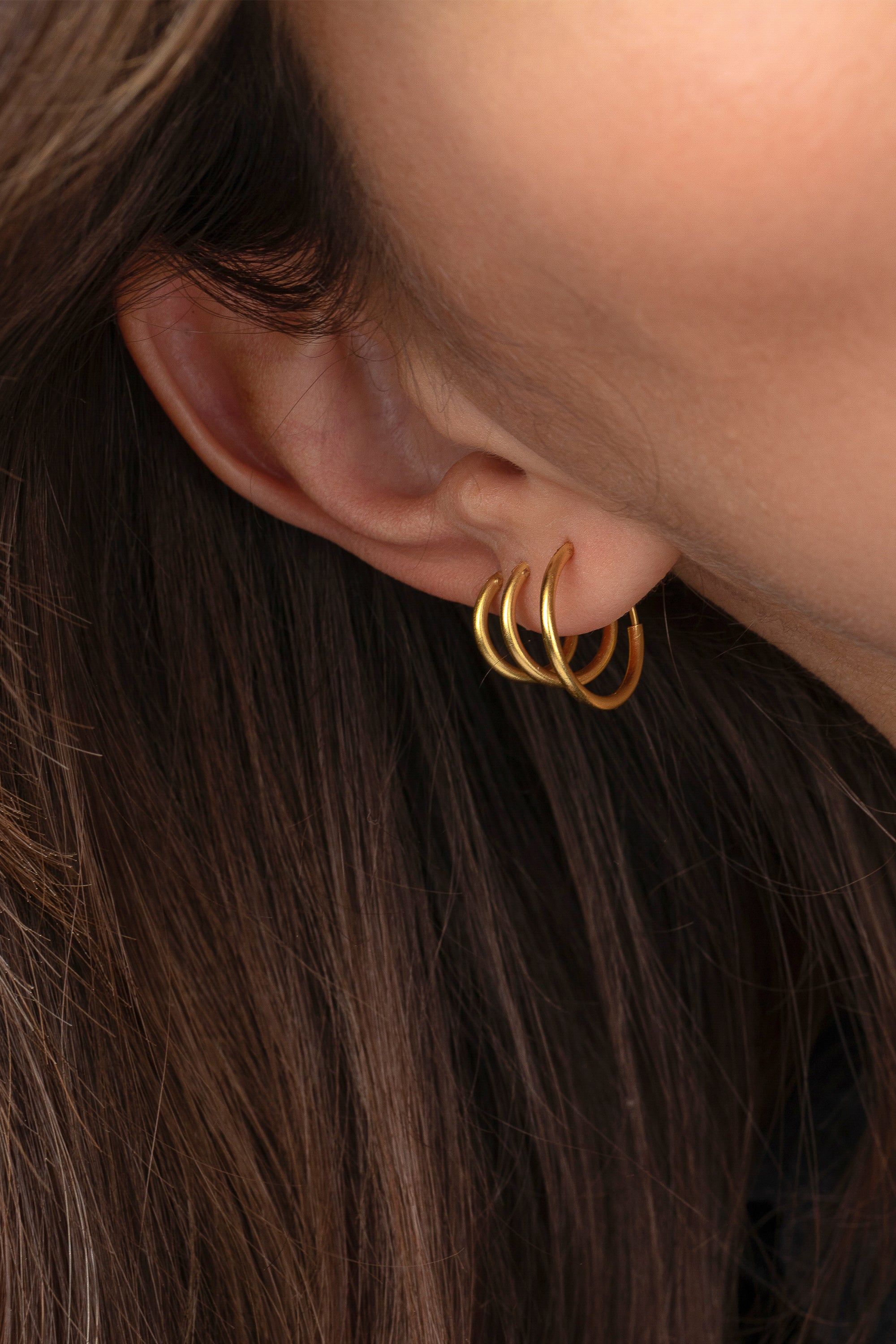 Minimal hoop earring set (1.2 cm, 1.4 cm, 1.7 cm), made to mix across lobes and second piercings. An on-trend design to build your favorite ear stacks: play with volumes and sizes for a look that’s uniquely yours. Hidden-hinge closure for a seamless finish. Handmade in recycled brass. Nickel tested. Handmade, unique, handcrafted jewelry perfect for all your looks or as a gift idea.