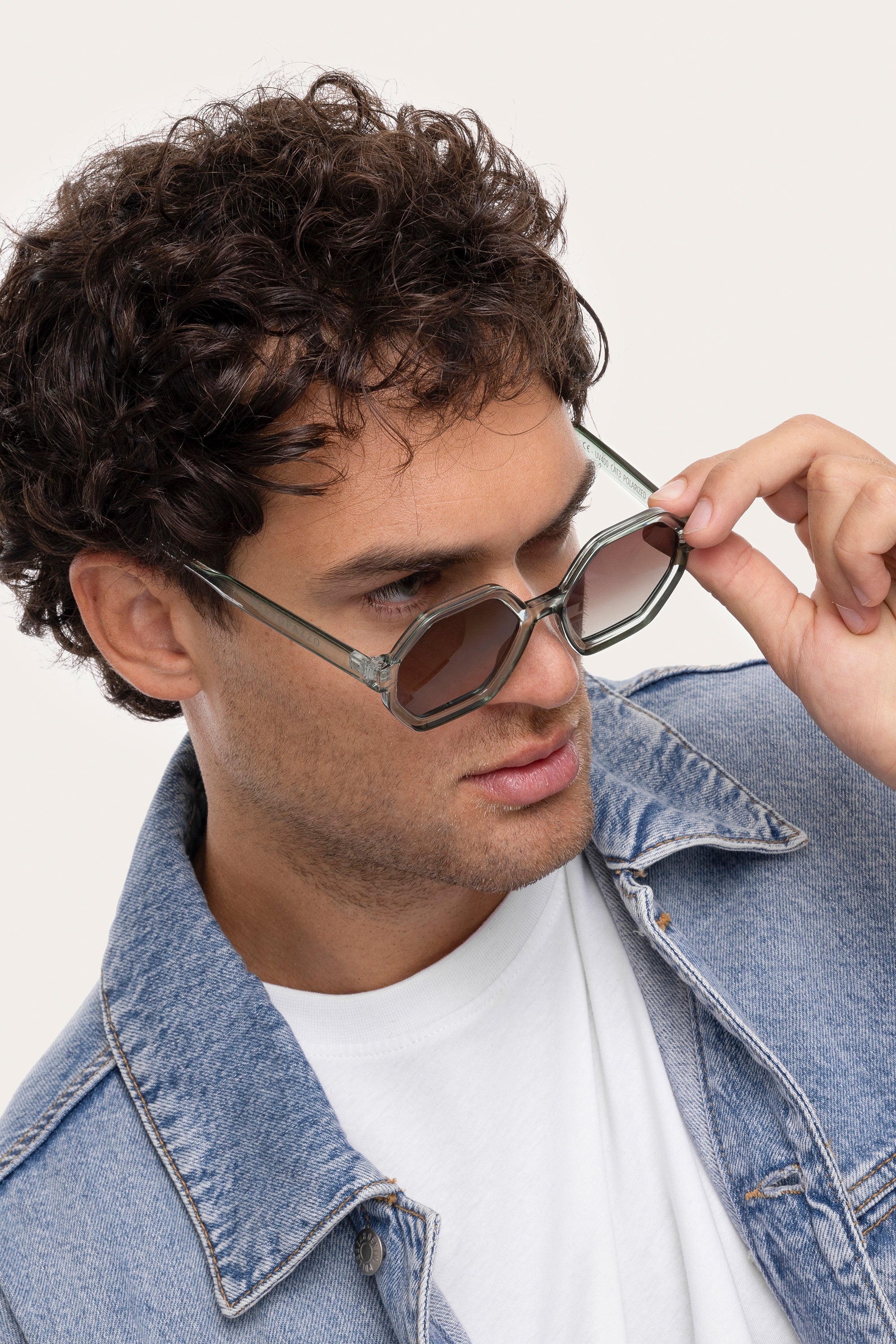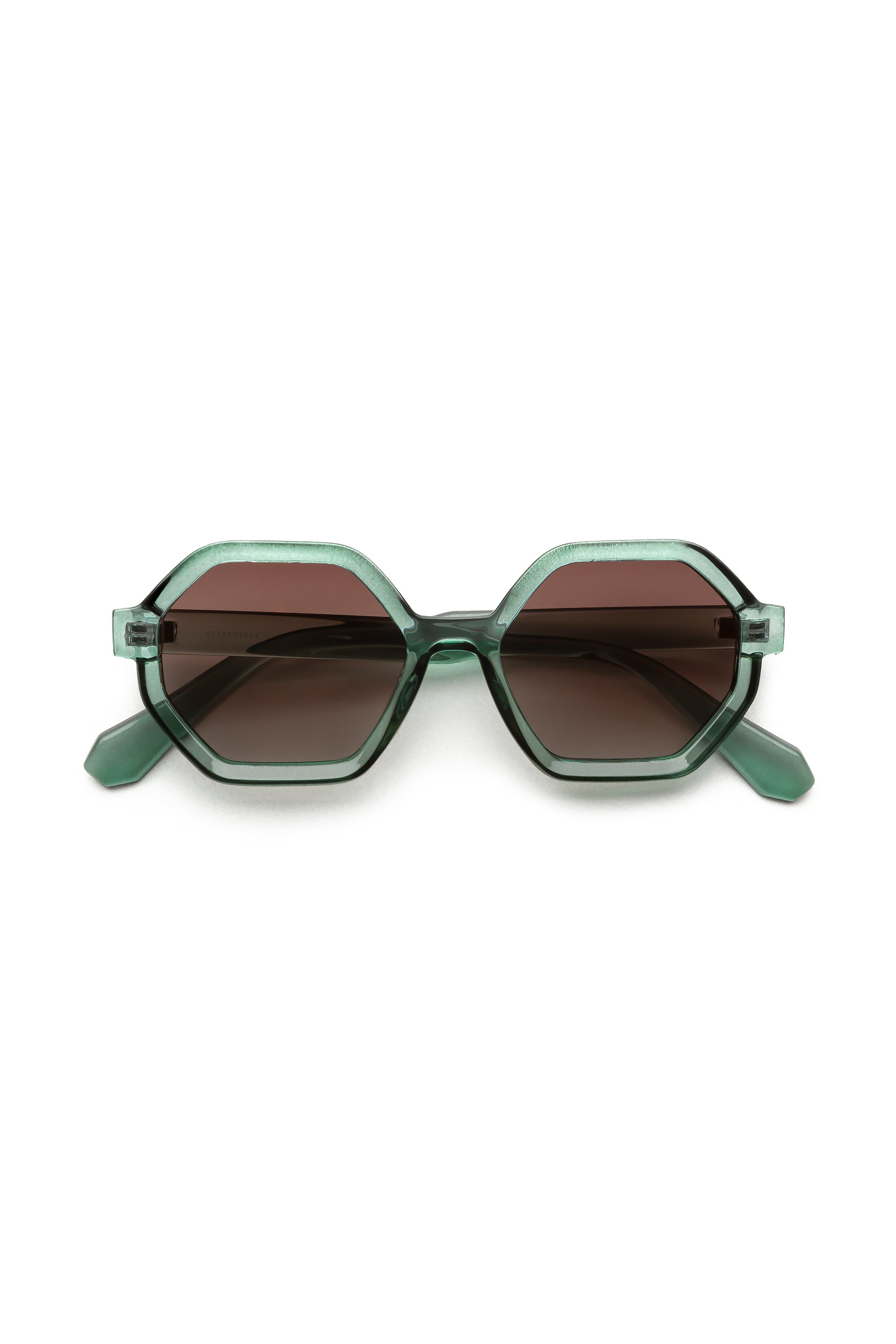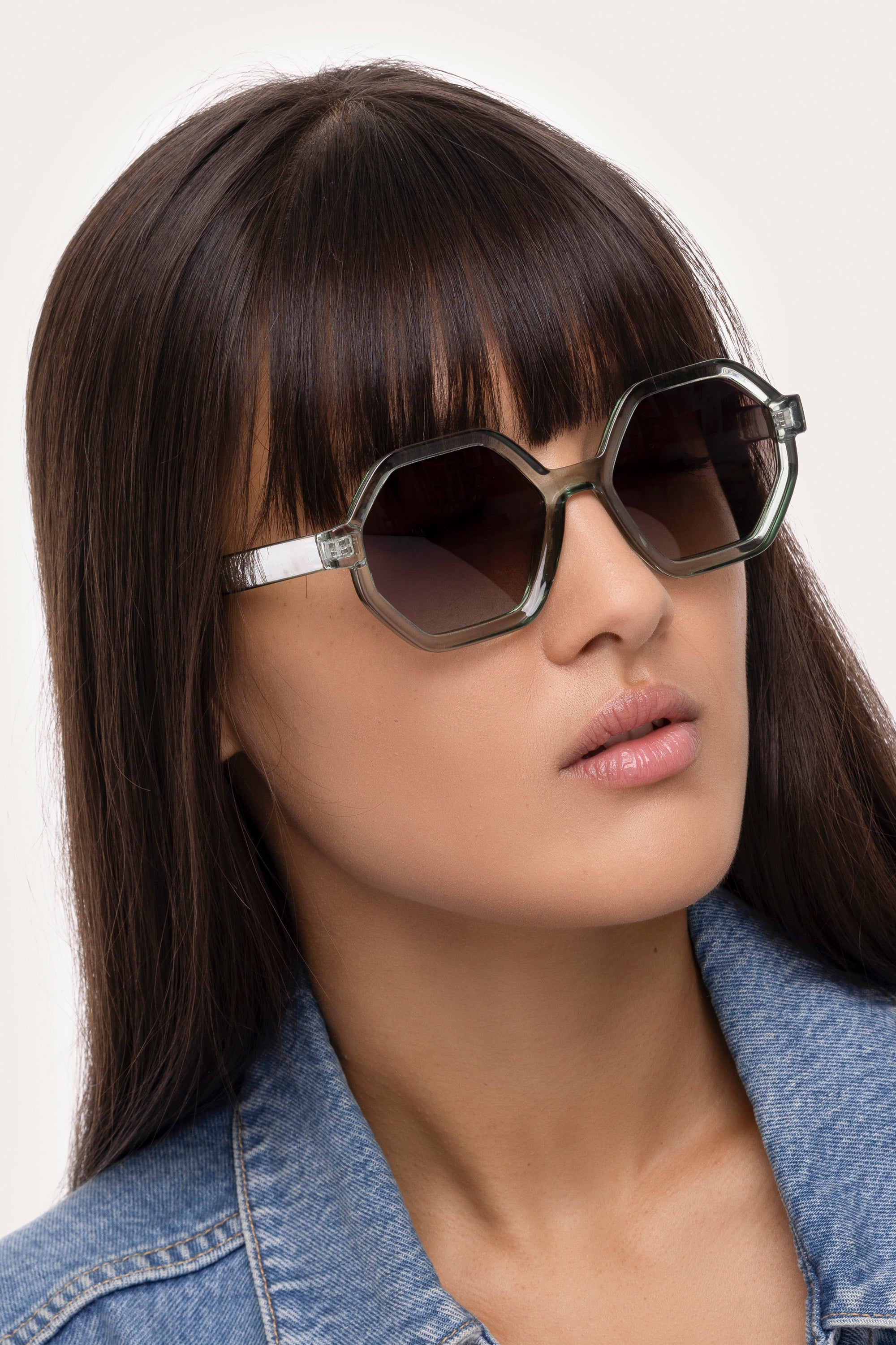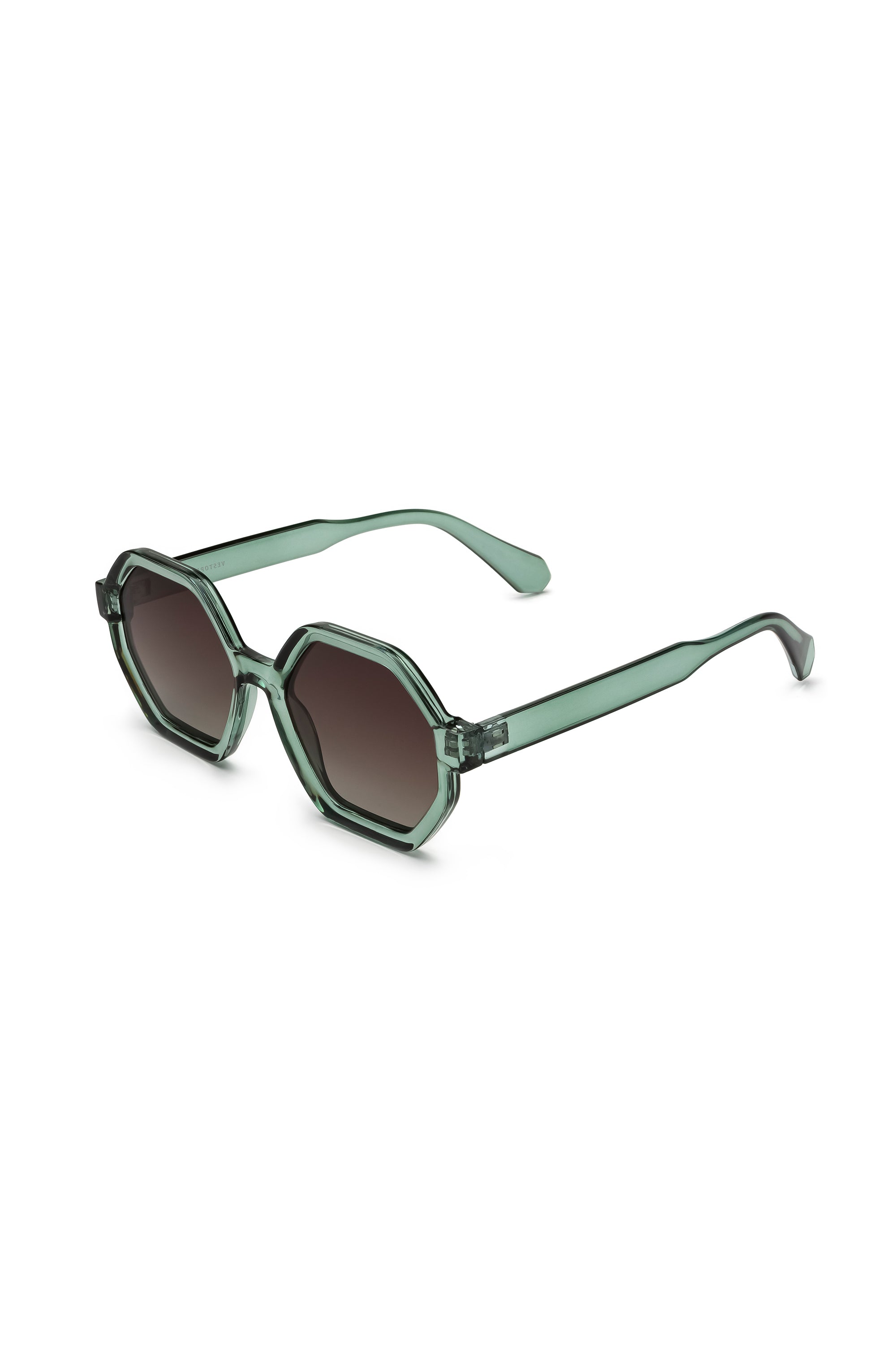 Gafas de sol London hexagonales. Montura transparente de color verde, de material reciclado y lentes polarizadas. Incluye una funda blanda y un paño para limpiar el producto. Filtro de categoría 3. Combina las gafas de sol con tus joyas preferidas y llévalas siempre contigo. Ligeras, prácticas y cómodas de usar, son las compañeras de viaje perfectas para tus aventuras cotidianas.