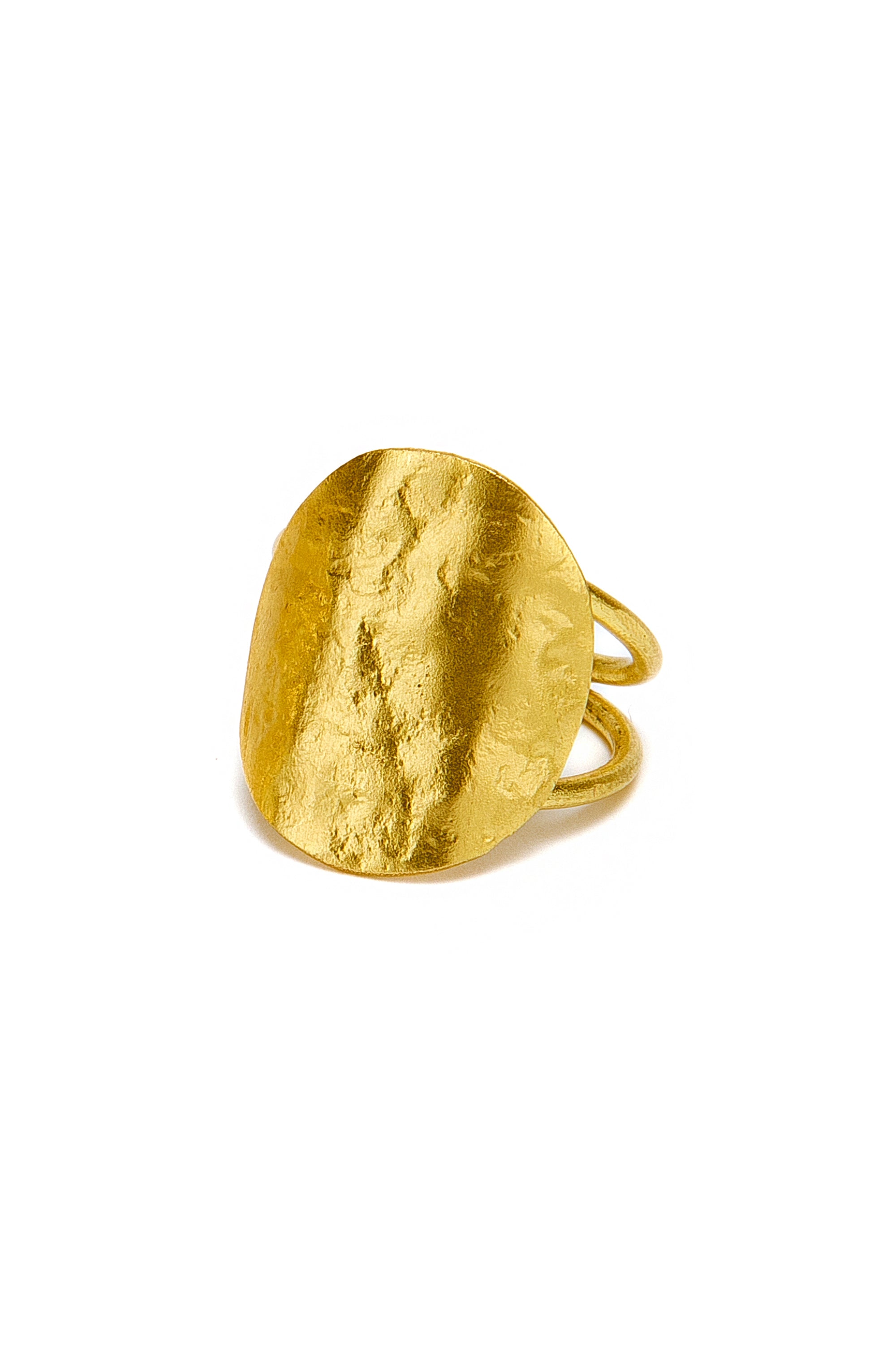 Anillo banda con maxi placa martillada de brillo irregular: un óvalo escultórico que se vuelve protagonista, ligero pero de impacto. Modelo ajustable. Realizado a mano en latón reciclado. Nickel tested. Elaboración artesanal. Joyas hechas a mano, únicas y artesanales, perfectas para todos tus looks o como idea de regalo.