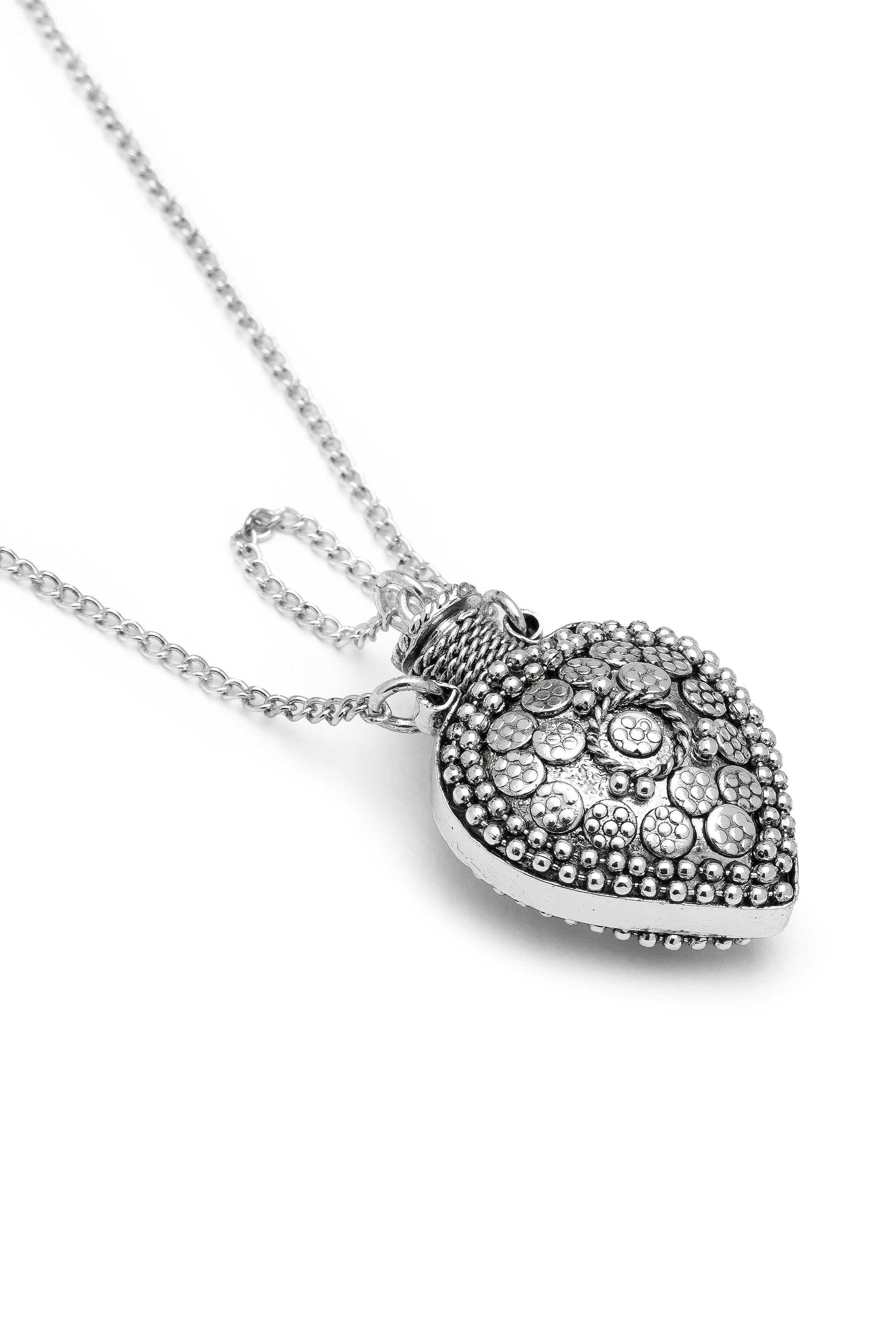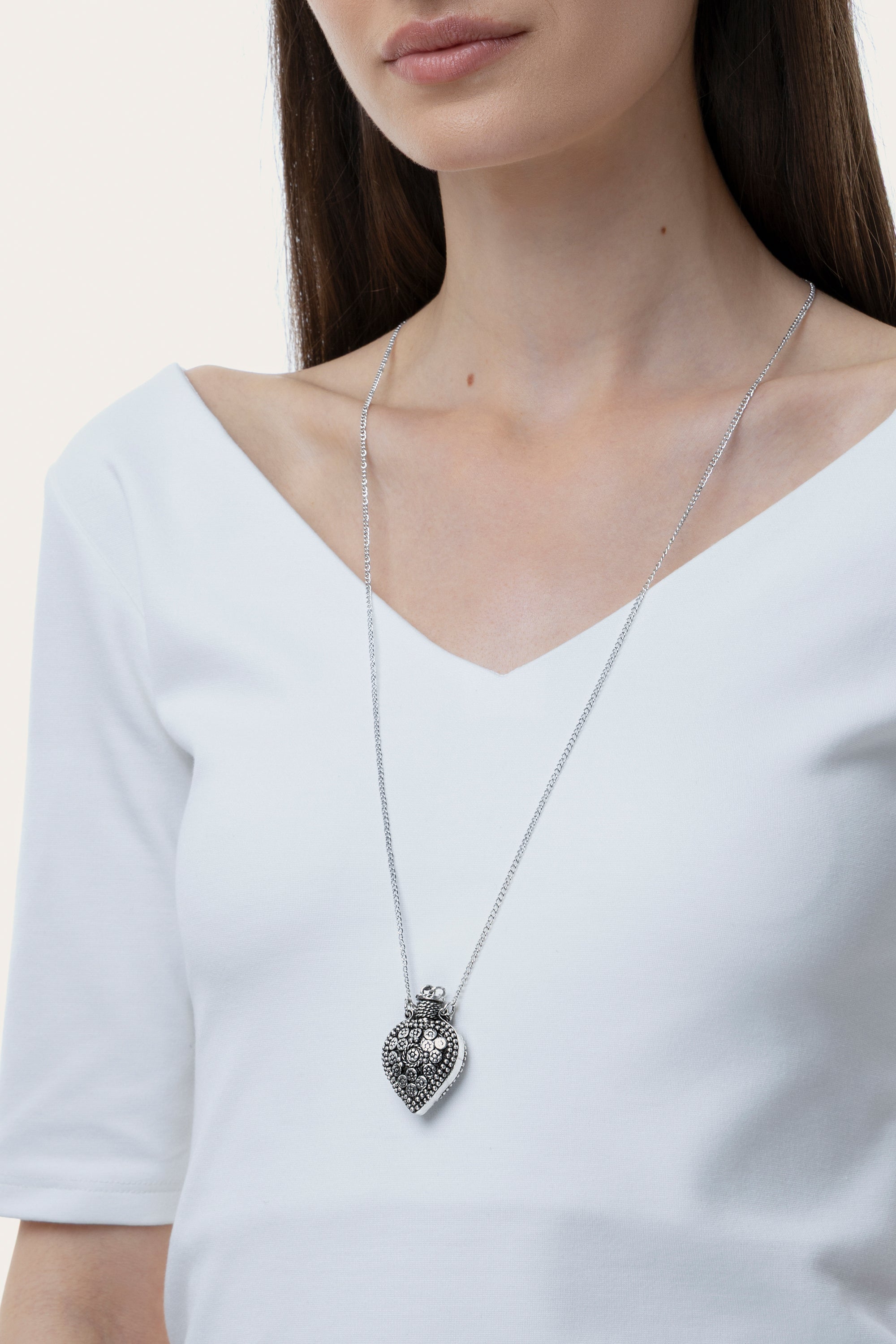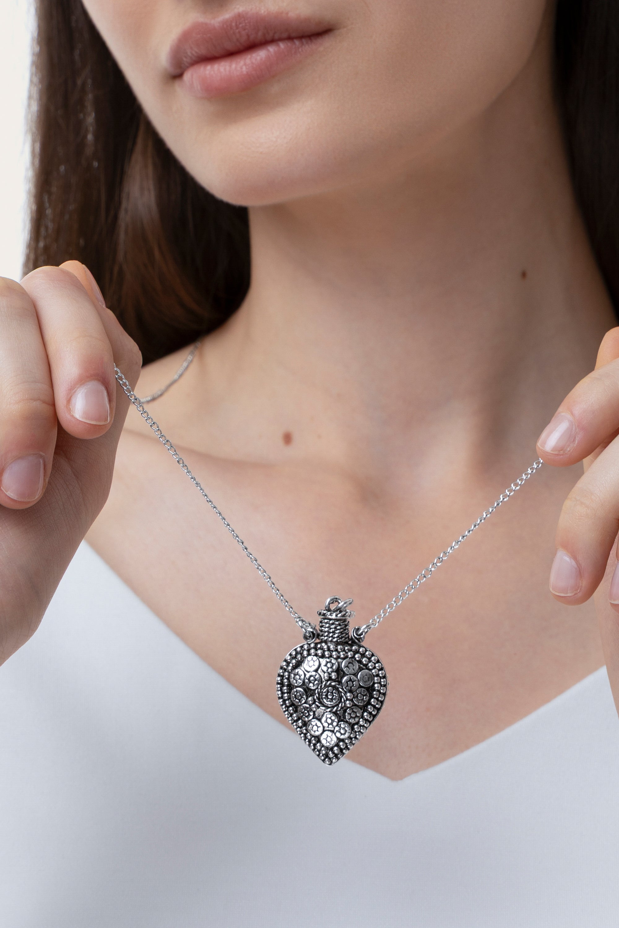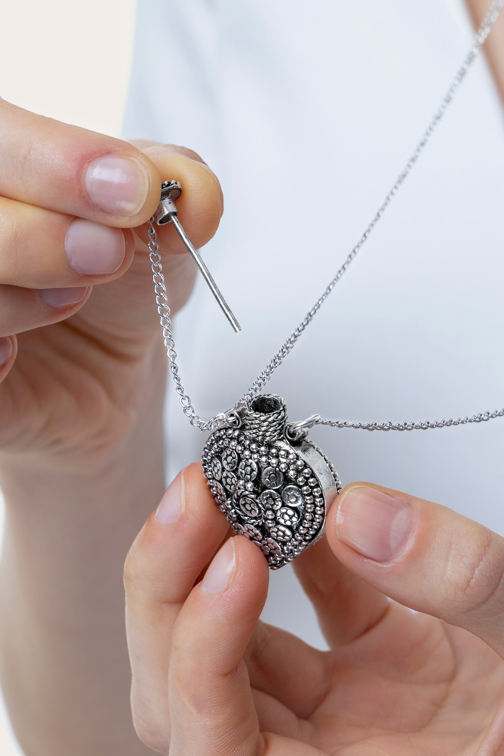 Lleva siempre un recuerdo contigo gracias al colgante abrible en forma de corazón. Esta joya se caracteriza por un colgante con apertura central, que permite guardar pequeños secretos o mensajes. Ideal para un regalo especial o para un toque personal de estilo boho glam. Perfecta para combinar con otros collares tipo gargantilla para crear superposiciones personalizadas. Cierre regulable con mosquetón. Longitud del collar 38 cm por lado. Longitud de cadena extra 6,5 cm. Material: chapado en plata 100% artesanal. Níquel testado. Elaboración artesanal. Joyas hechas a mano, únicas y artesanales, perfectas para todos tus looks o como idea de regalo.
