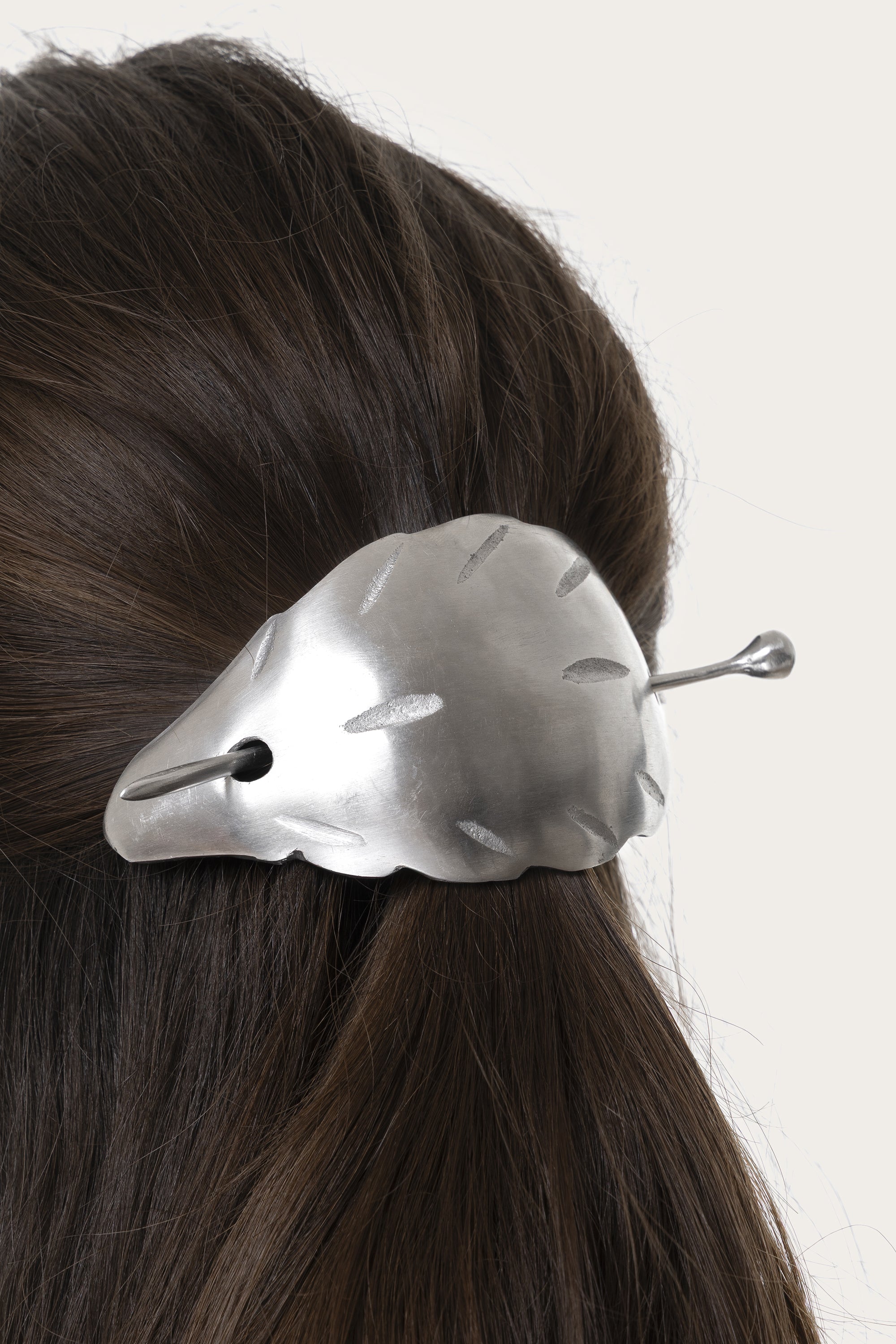 Inspirado en la delicadeza de las formas naturales, este pasador para el cabello en aluminio 100% reciclado envuelve el pelo con una elegancia escultórica. La superficie trabajada a mano y los grabados ligeros crean juegos de luz únicos, transformando cualquier recogido en un detalle de estilo. Nickel tested. Elaboración artesanal. Joyas hechas a mano, únicas y artesanales, perfectas para todos tus looks o como idea de regalo.