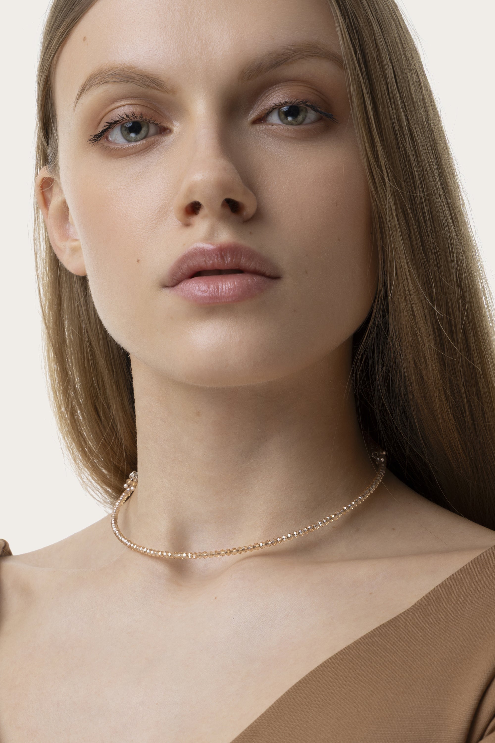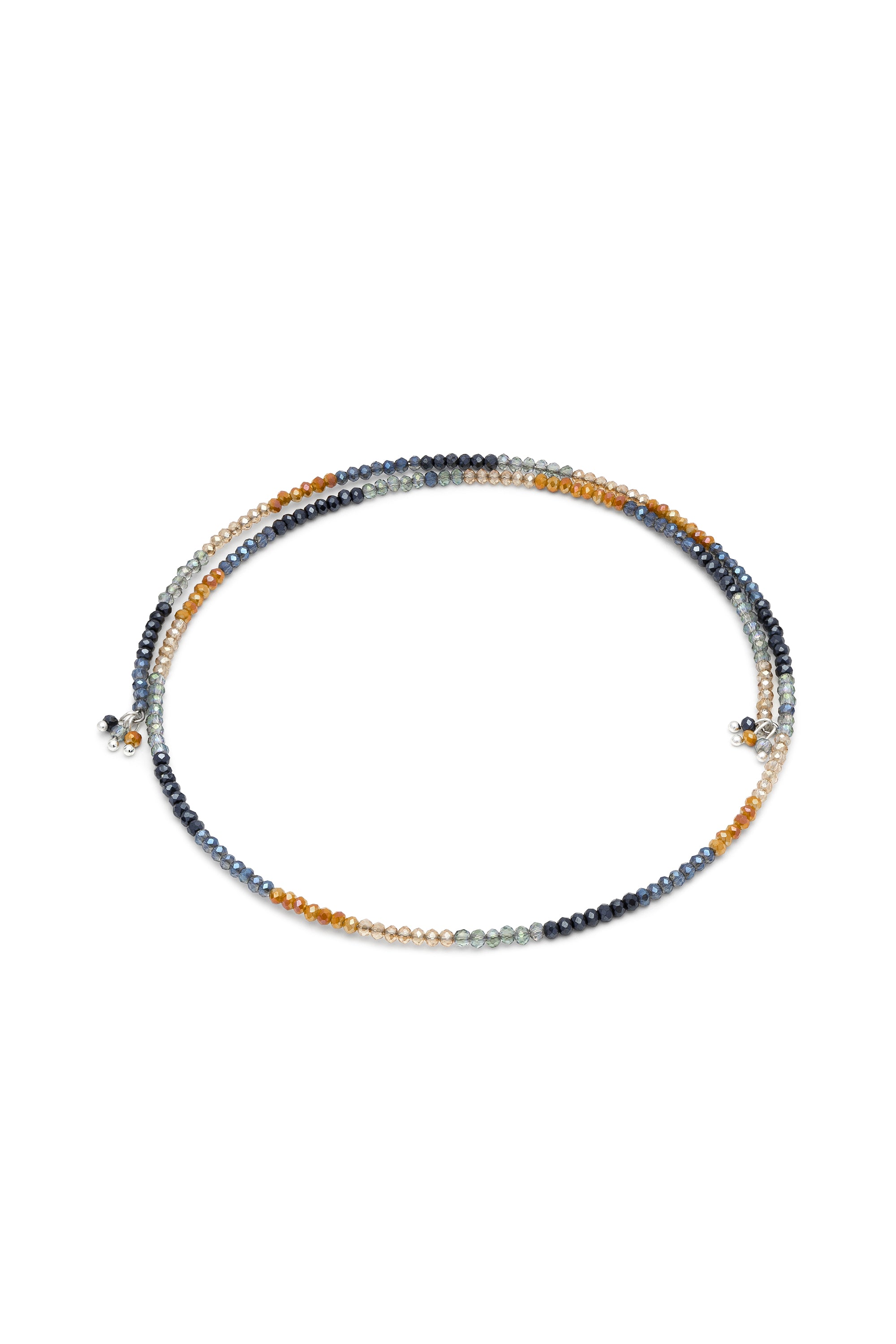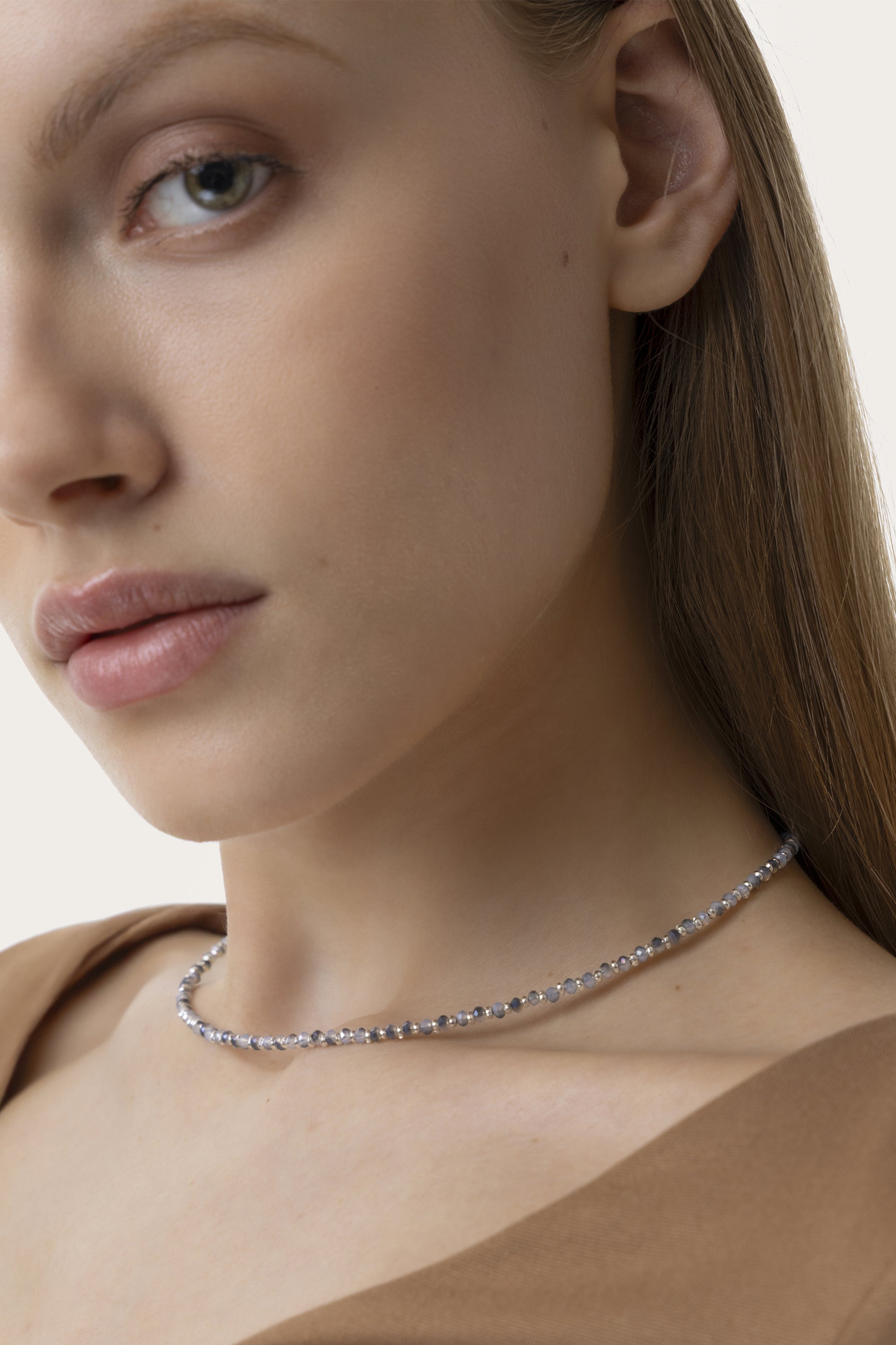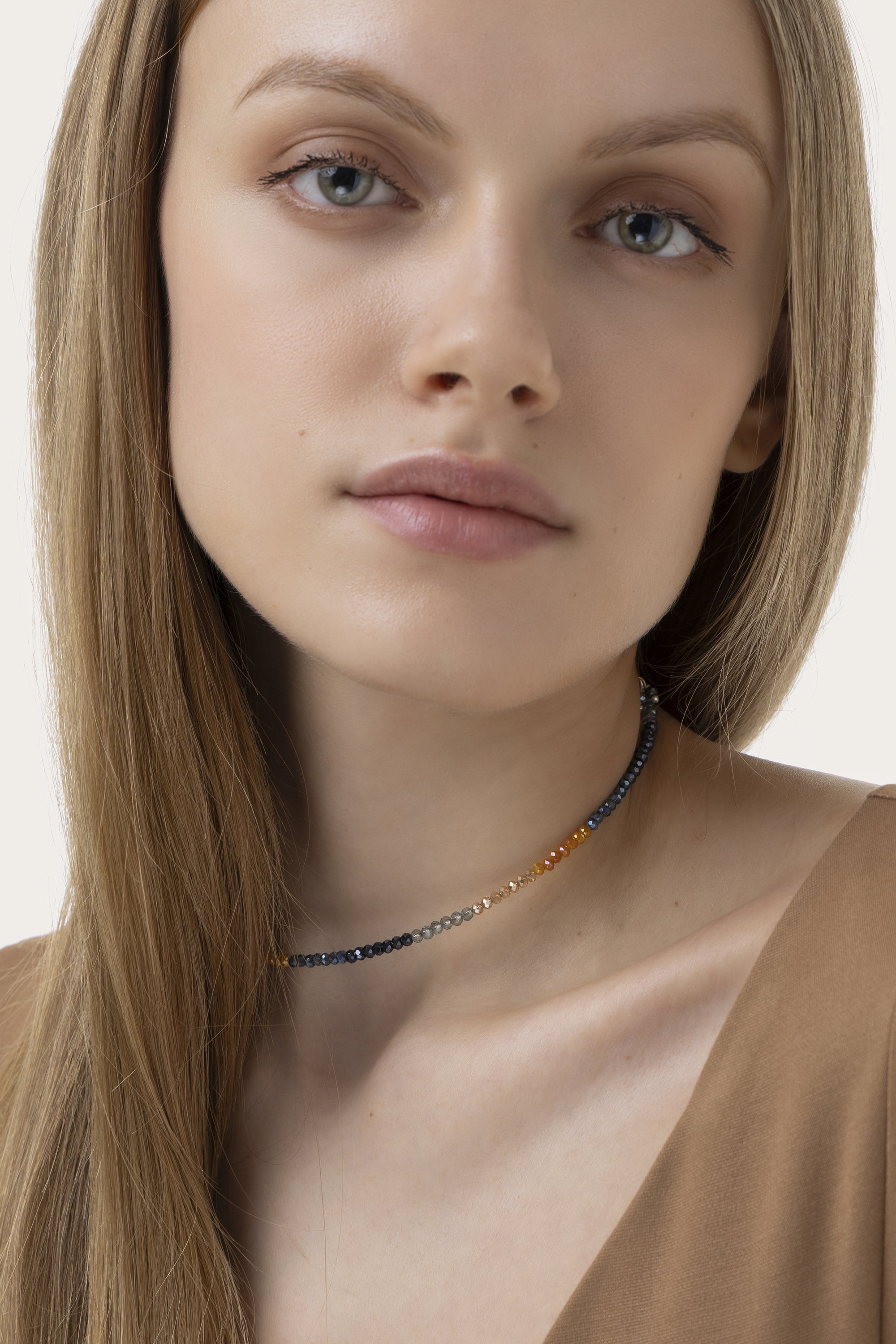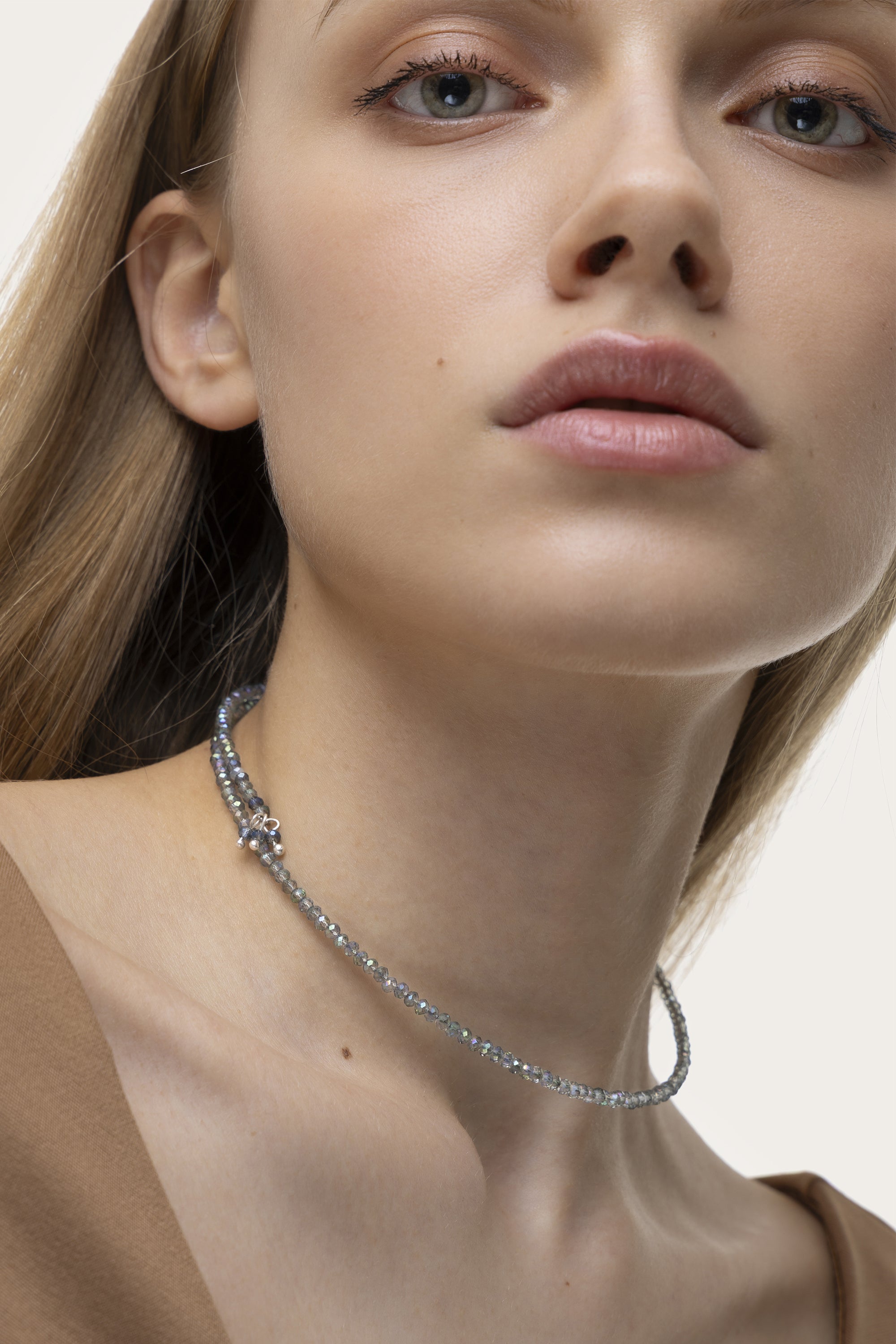 Collar tipo gargantilla con doble hilera de cristales facetados en vidrio de color. Los reflejos tornasolados aportan luz al rostro y un toque elegante al look. Perfecta para llevar sola o combinada con otras joyas en un layering de tendencia. Cierre de muelle ajustable. Disponible en los colores: azul noche, gris perla, ámbar, champán y multicolor. Material: vidrio y chapado en plata. Nickel tested. Elaboración artesanal. Joyas hechas a mano, únicas y artesanales, perfectas para todos tus looks o como idea de regalo.