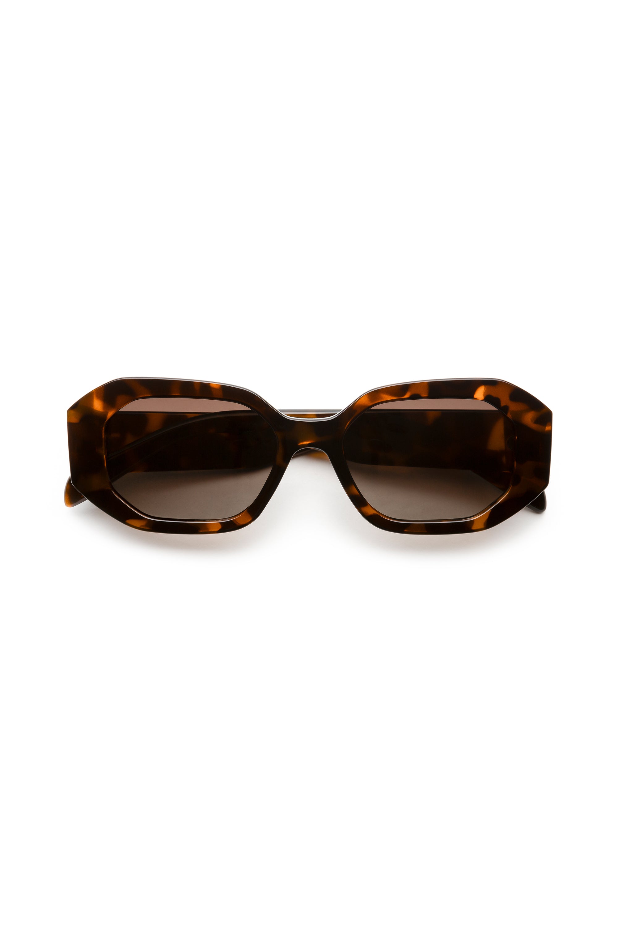 Gafas de sol San Francisco, modelo rectangular recortado. Montura transparente de color caramelo/carey, de material reciclado y lentes polarizadas. Incluye una funda blanda y un paño para limpiar el producto. Filtro de categoría 3. Combina las gafas de sol con tus joyas preferidas y llévalas siempre contigo. Ligeras, prácticas y cómodas de usar, son las compañeras de viaje perfectas para tus aventuras cotidianas.