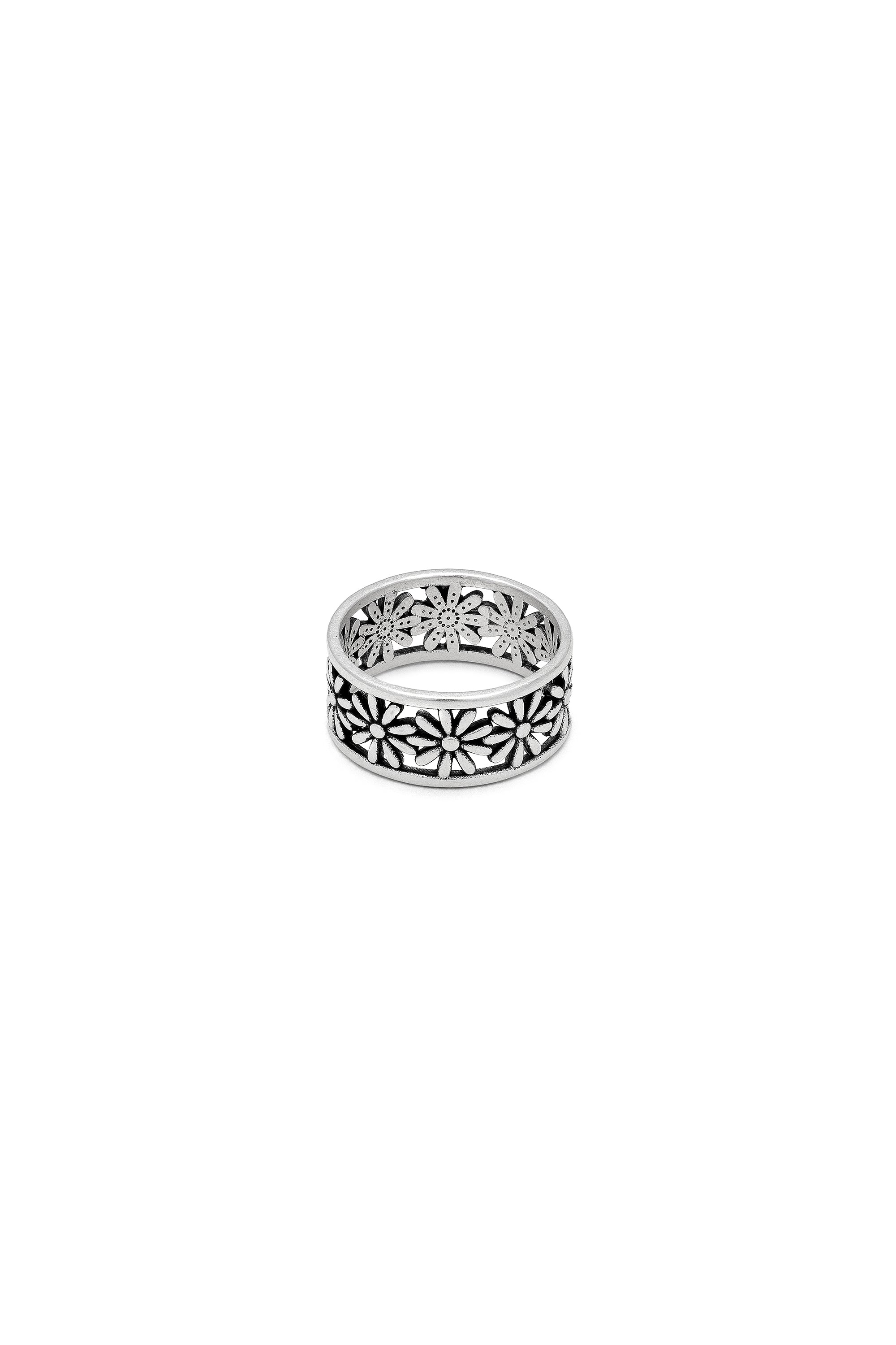 Una banda decorada con un entramado continuo de margaritas que evoca la delicadeza de la flor. Un anillo ideal para llevar como pieza ?nica para resaltar la mano o en combinaci?n con otros anillos de la misma colecci?n. Modelo ajustable. Chapado en plata. Nickel tested.