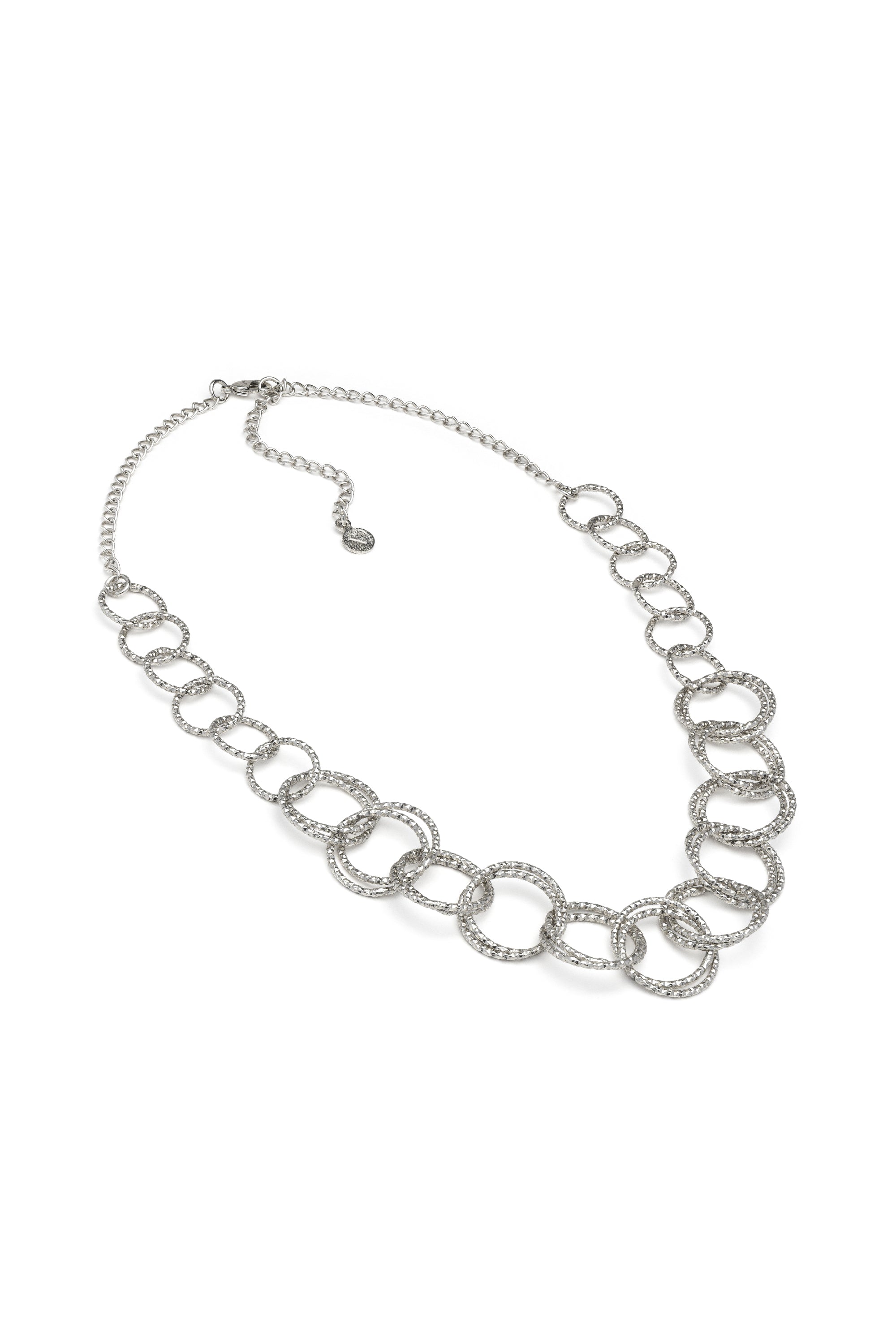Una secuencia de anillos entrelazados para este collar con c?rculos de acabado brillante. La superficie martillada a mano crea una textura t?ctil que captura la luz, realzando la tridimensionalidad de las formas geom?tricas. Un dise?o ligero e impactante, creado para definir el look. Ideal para combinar con el ?Anillo De Banda Mini Espiral? y los ?Pendientes Circulos Concentricos?. Longitud ajustable. Chapado en plata. Nickel tested.