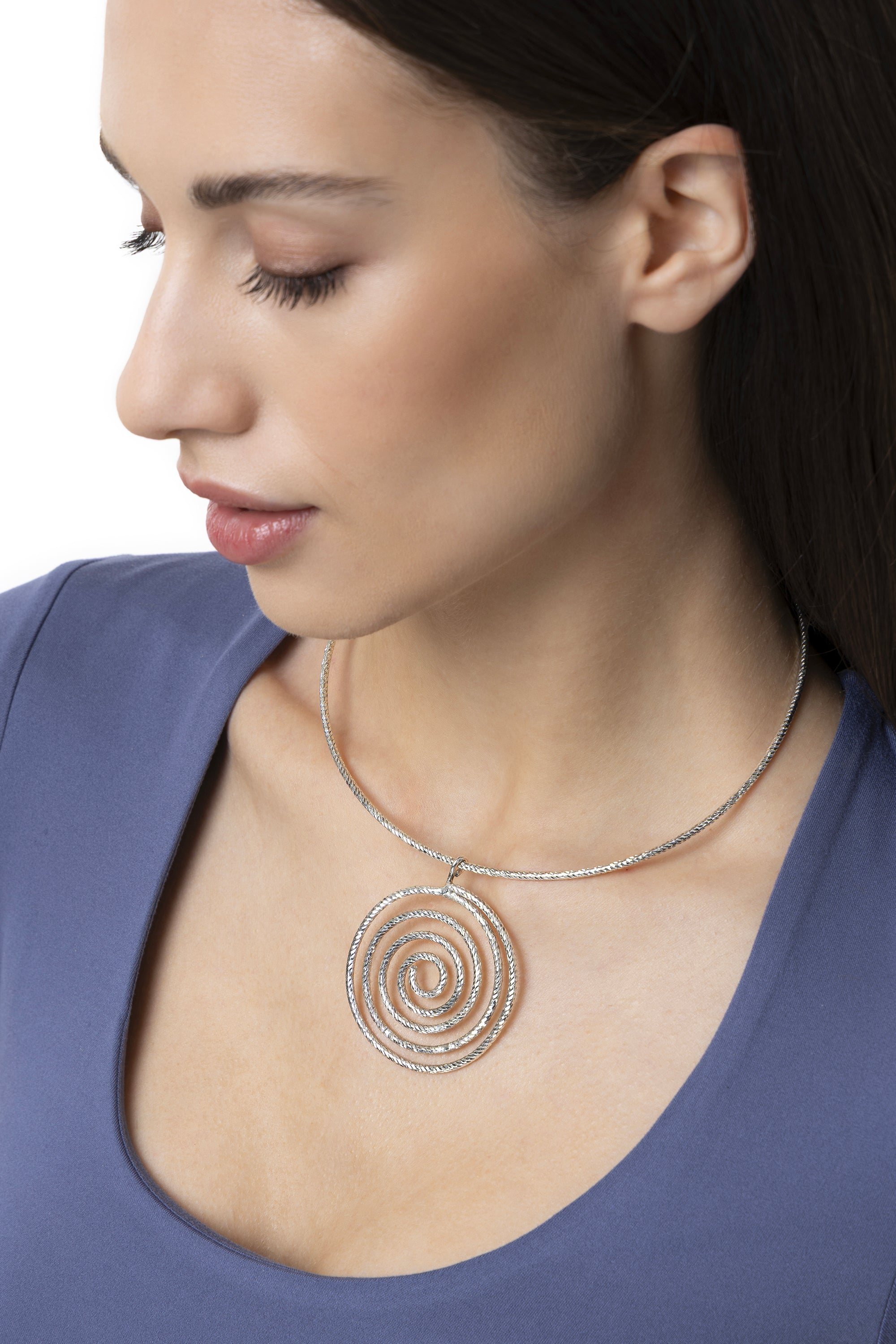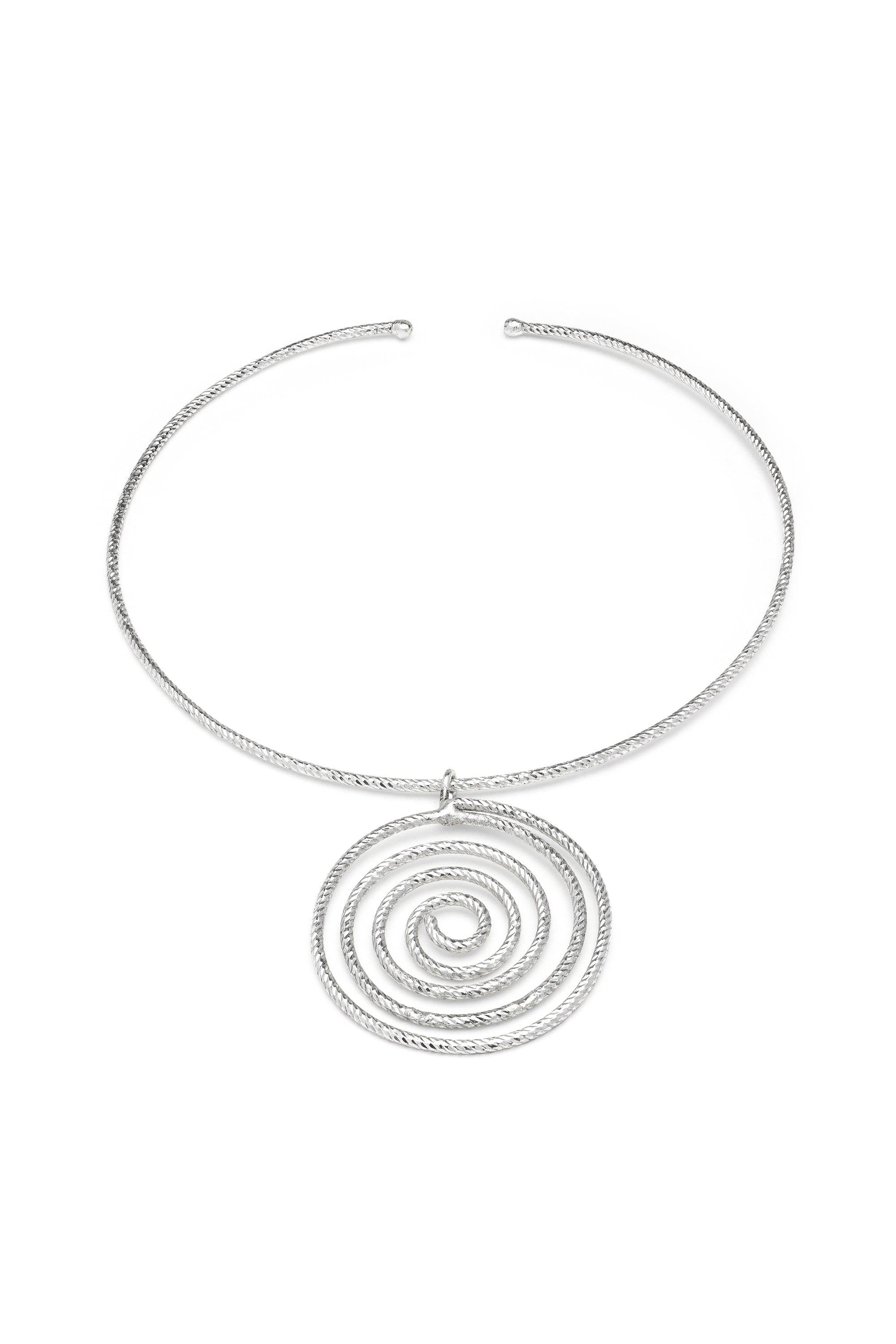 Collar semirr?gido de refinado encanto, caracterizado por un colgante en espiral. El dise?o limpio y la textura de los microelementos lo convierten en el accesorio perfecto para tus looks de noche. Una joya con car?cter, ideal para llevar sola como pieza destacada. Chapado en plata. Nickel tested.