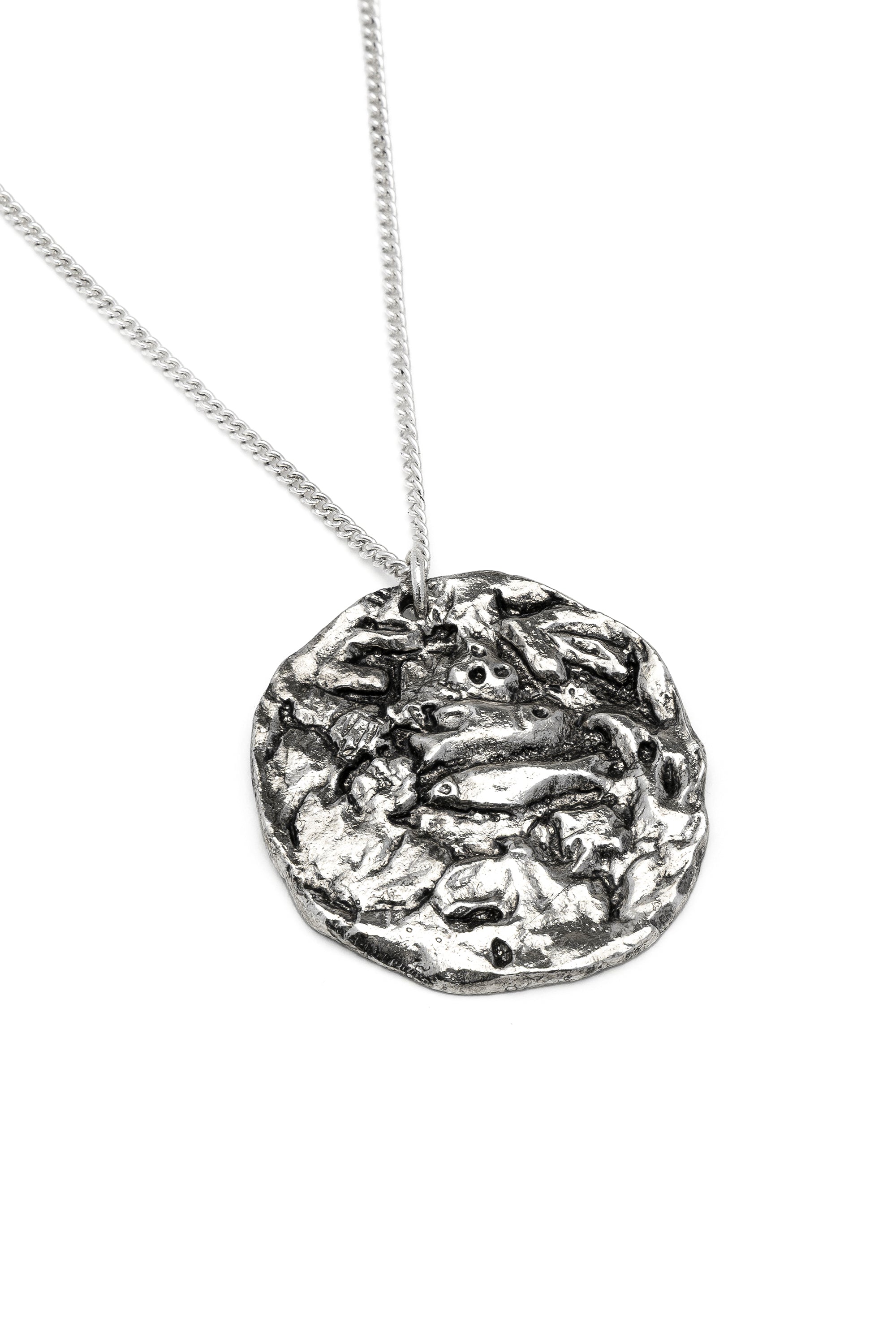 Textura rugosa y estilo contempor?neo. Este collar destaca por su colgante circular irregular, caracterizado por un intrincado grabado en relieve. El trabajo del colgante confiere a la joya un car?cter decidido, lo que la convierte en el accesorio perfecto para un look sofisticado. Ideal para llevar sola como pieza destacada. Longitud de la cadena: 80 cm, ajustable. Chapado en plata. Nickel tested.