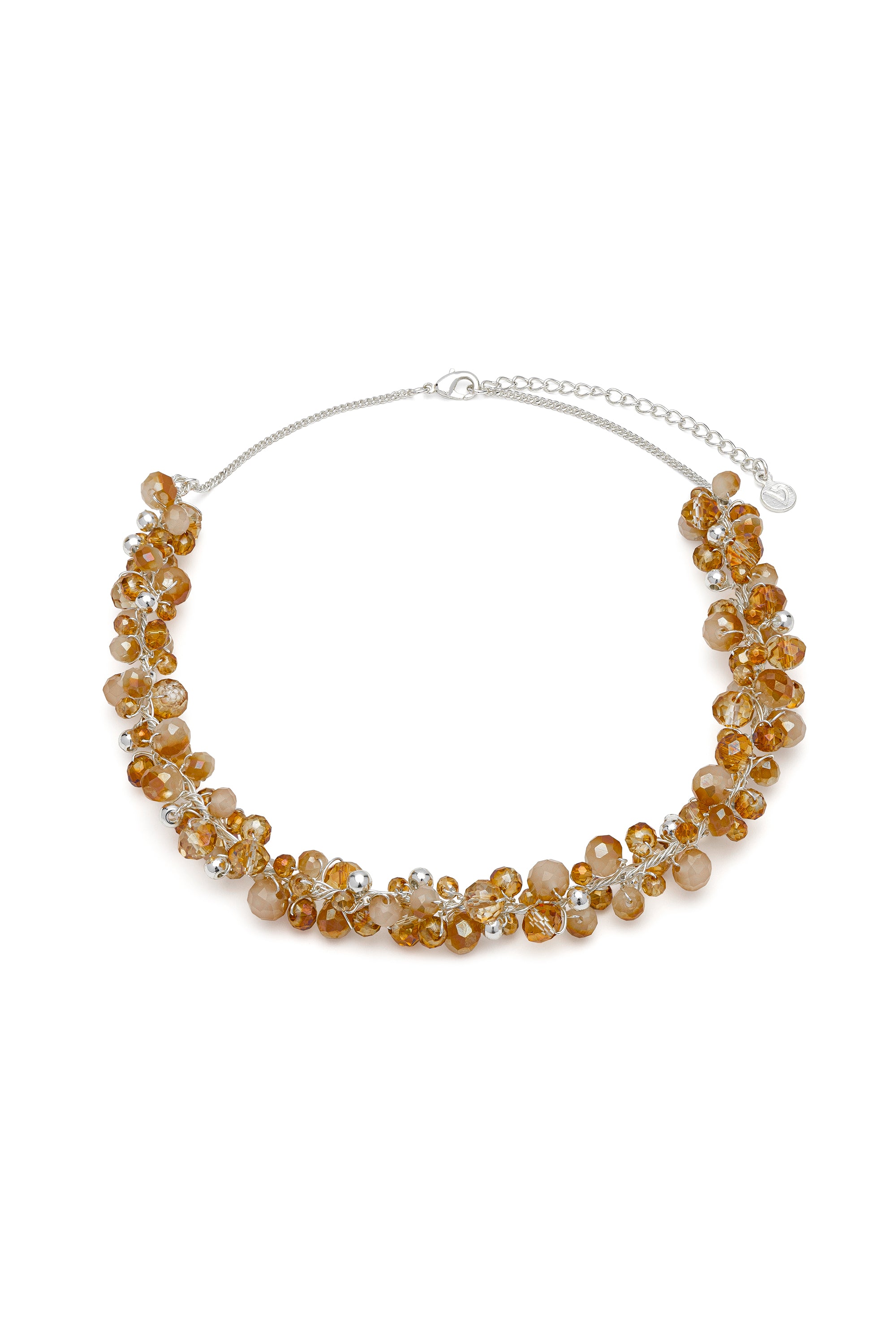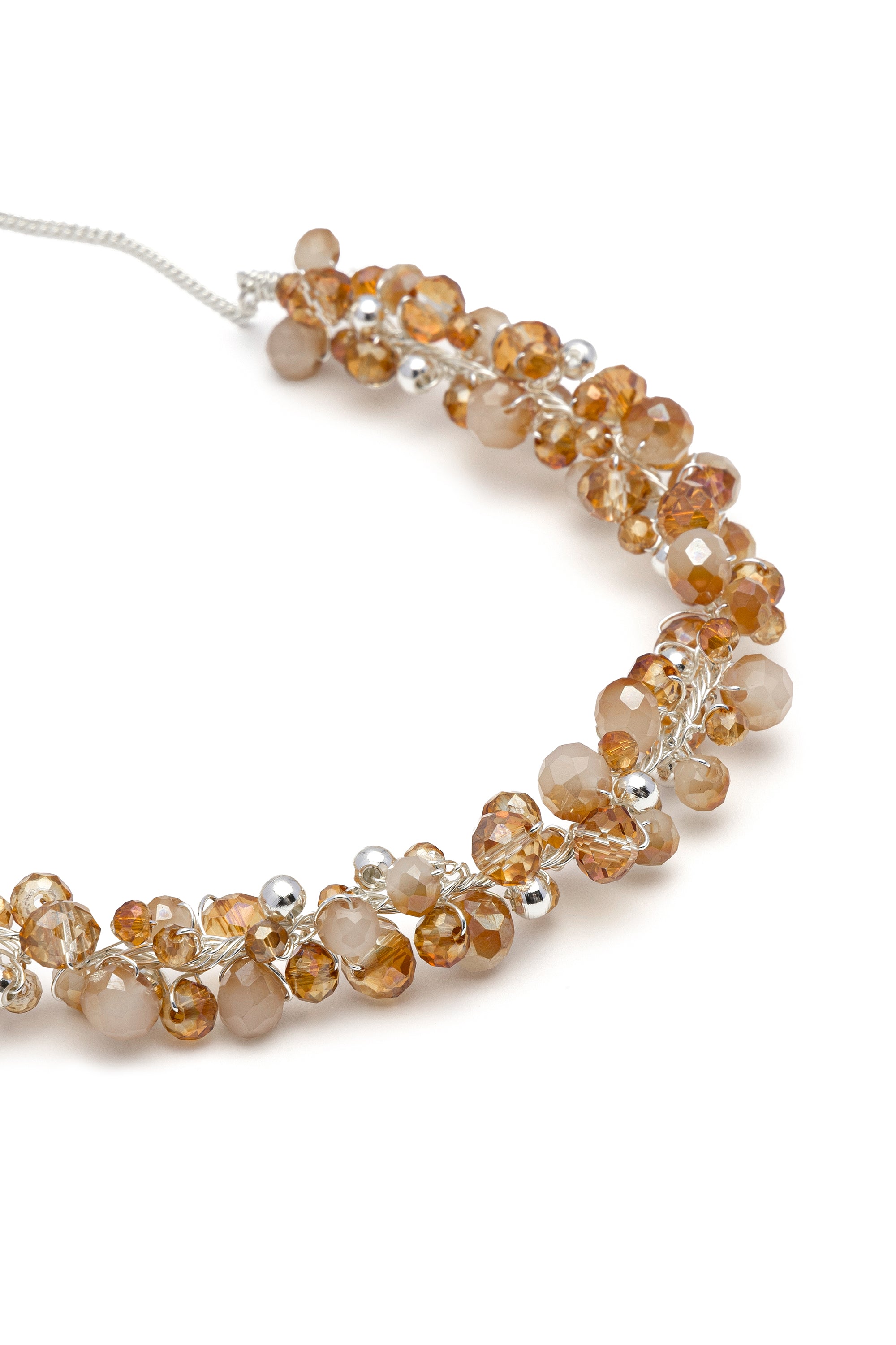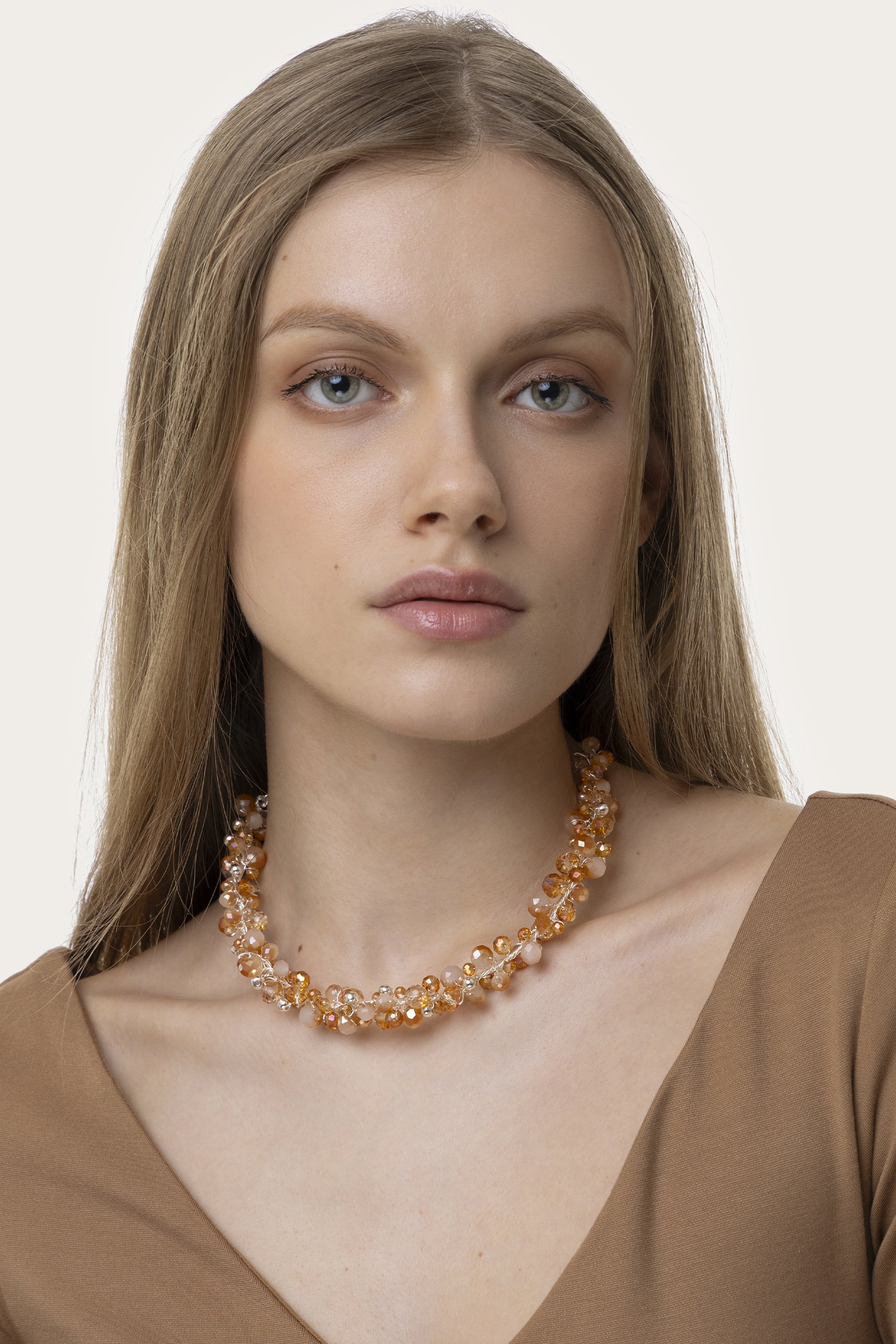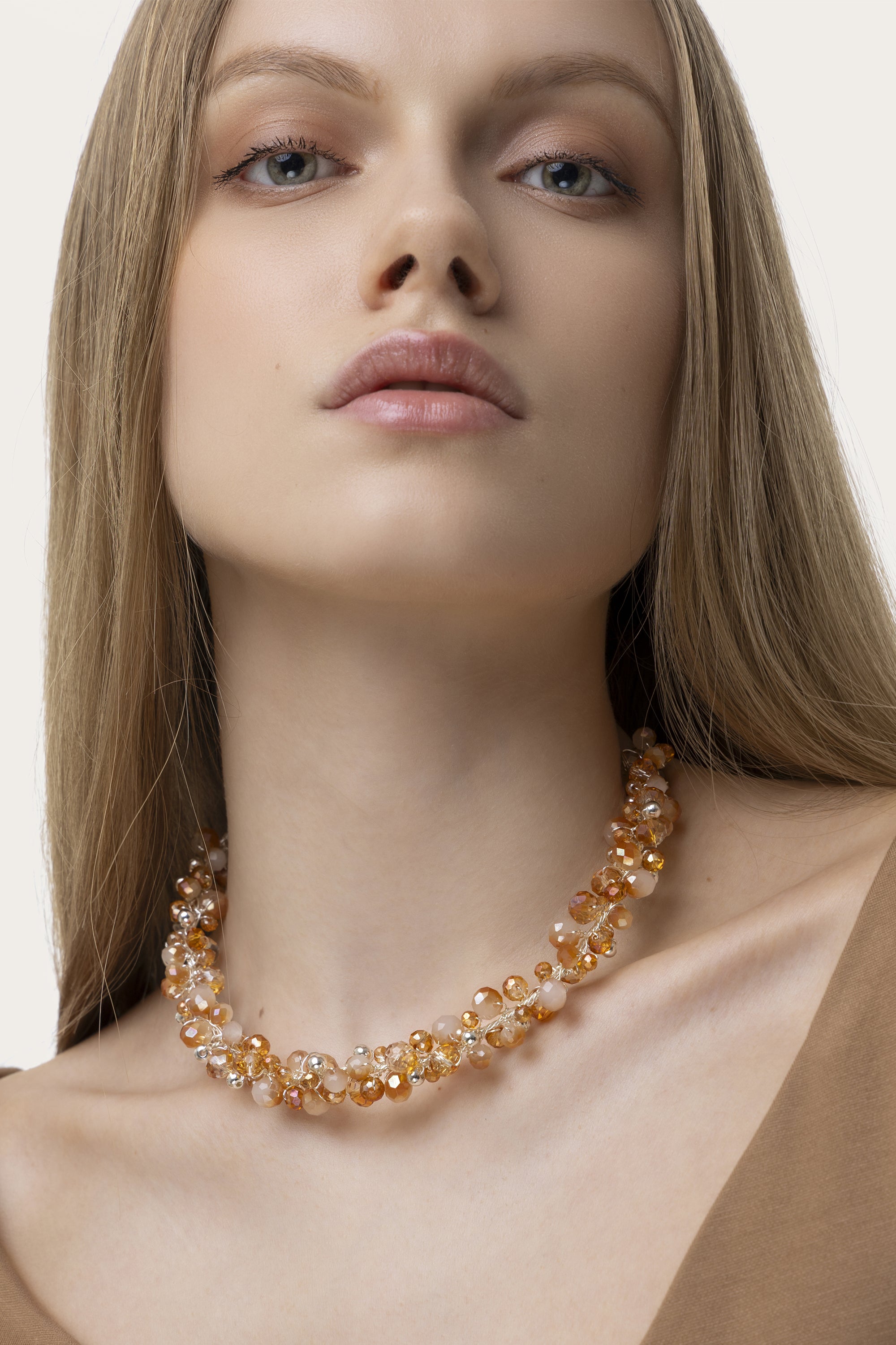 Luz y estilo en una sola pieza. Este collar se vuelve único gracias a los racimos de esferas en vidrio de color, aplicadas a mano trenzando la base de hilo. Las tonalidades ámbar aportan un efecto brillante y elegante a tus looks. Modelo ajustable. Material: vidrio y chapado en plata. Longitud del collar: 40 cm. Cadena de extensión: 6,5 cm. Nickel tested. Elaboración artesanal. Joyas hechas a mano, únicas y artesanales, perfectas para todos tus looks o como idea de regalo.