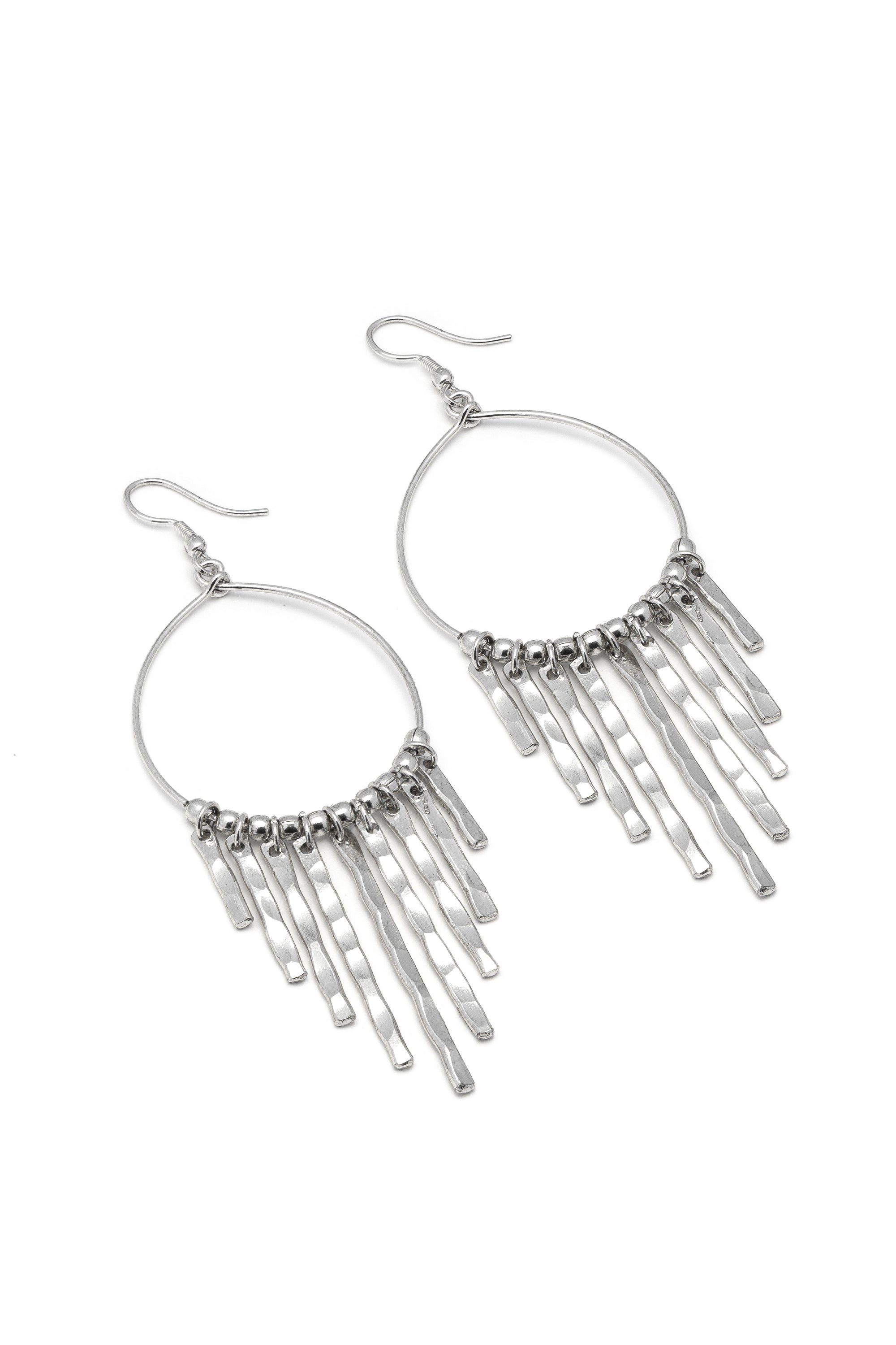 Pendientes de aro colgantes que destacan por su dise?o en cascada de barras lineales m?viles con acabado martillado. La estructura ligera y los elementos colgantes de diferentes longitudes crean un efecto ?atrapasue?os? moderno. Perfectos para regalar. Cierre de gancho. Di?metro del aro: 3,5 cm. Chapado en plata. Nickel tested.