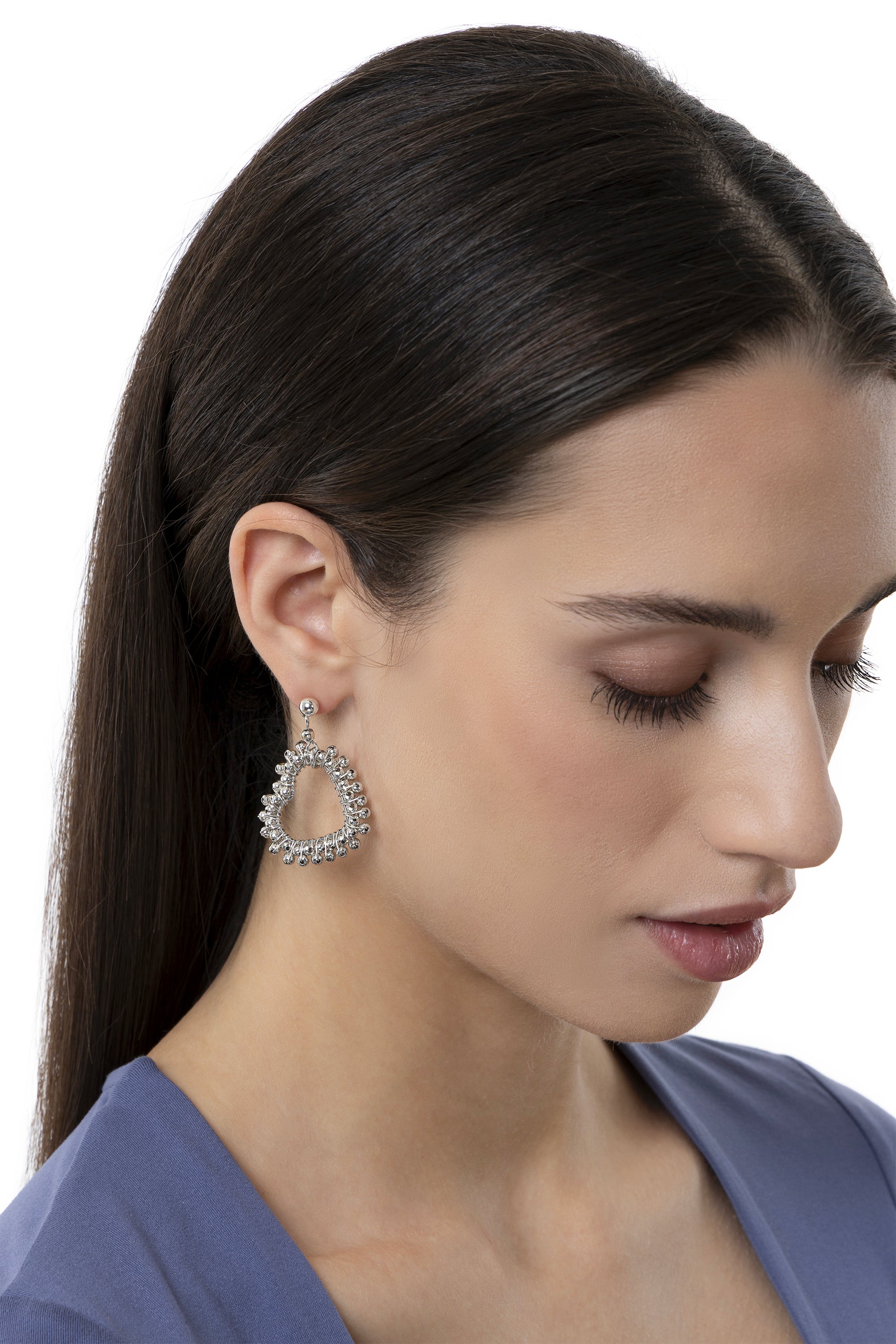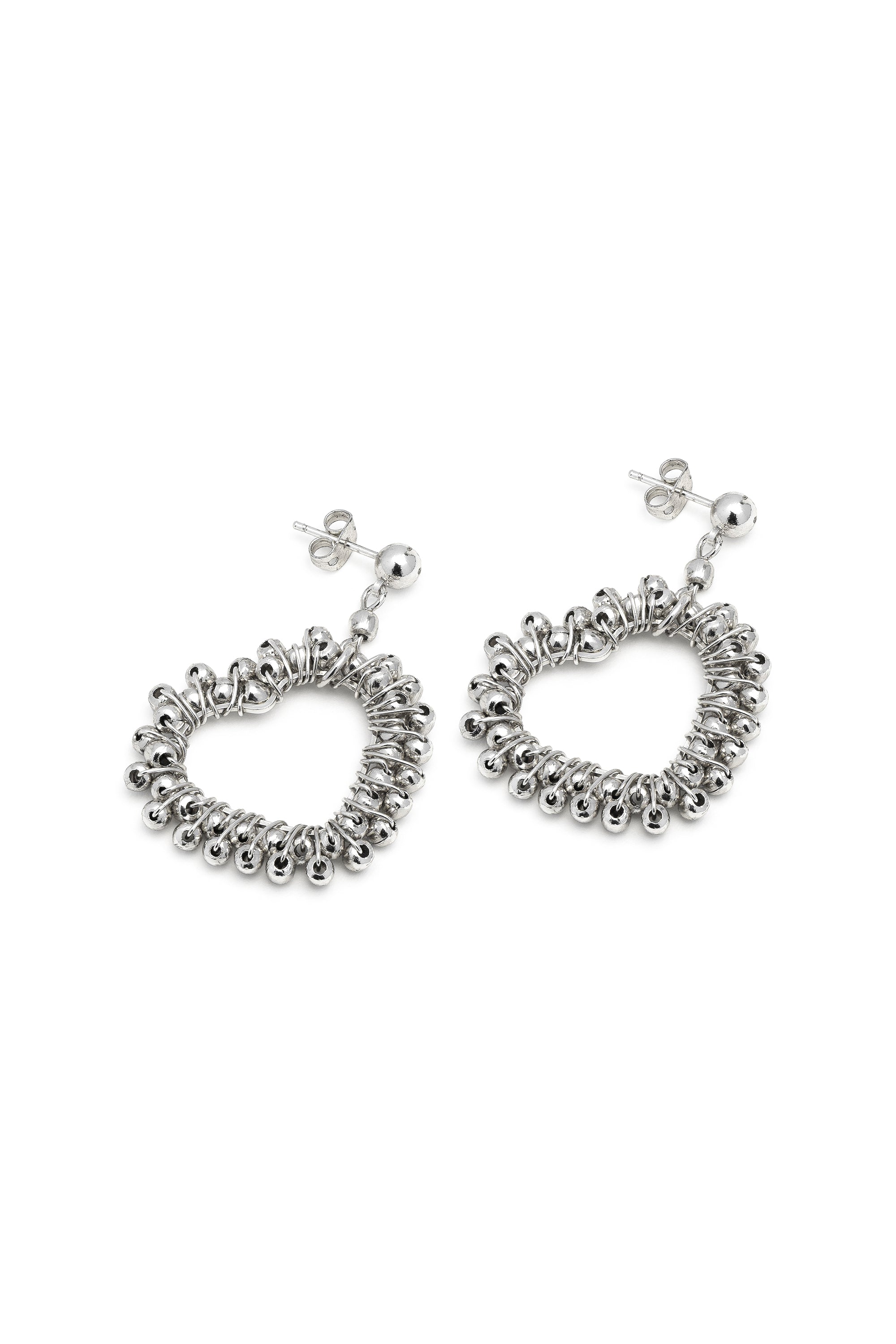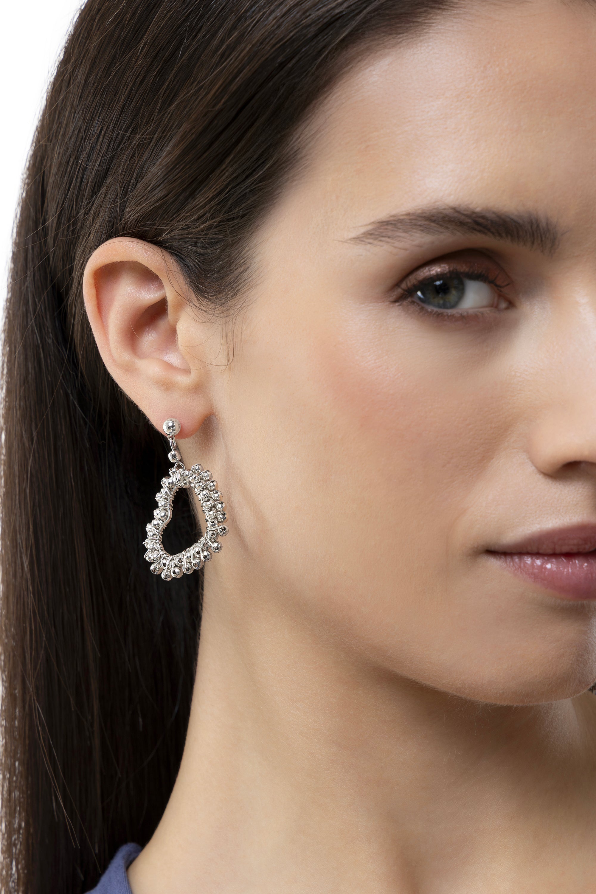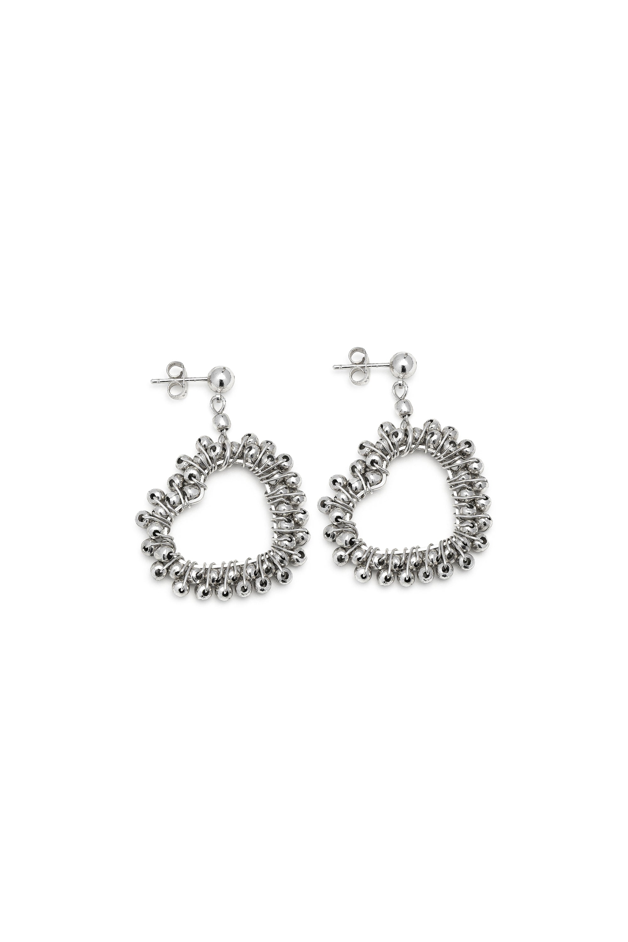 Detalles preciosos y estilo rom?ntico. Estos pendientes se distinguen por el colgante en forma de coraz?n, completamente perfilado por una densa sucesi?n de microesferas brillantes. La particular elaboraci?n crea un delicado juego de vol?menes y reflejos, lo que los convierte en el accesorio perfecto para a?adir un toque de luz y feminidad a tus looks diarios. Una joya con un encanto atemporal, ideal para quienes aman los detalles refinados. Ideales para combinar con el ?Collar De Microesferas?. Cierre de pasador con mariposa. Longitud total 4,5 cm. Chapado en plata. Nickel tested.