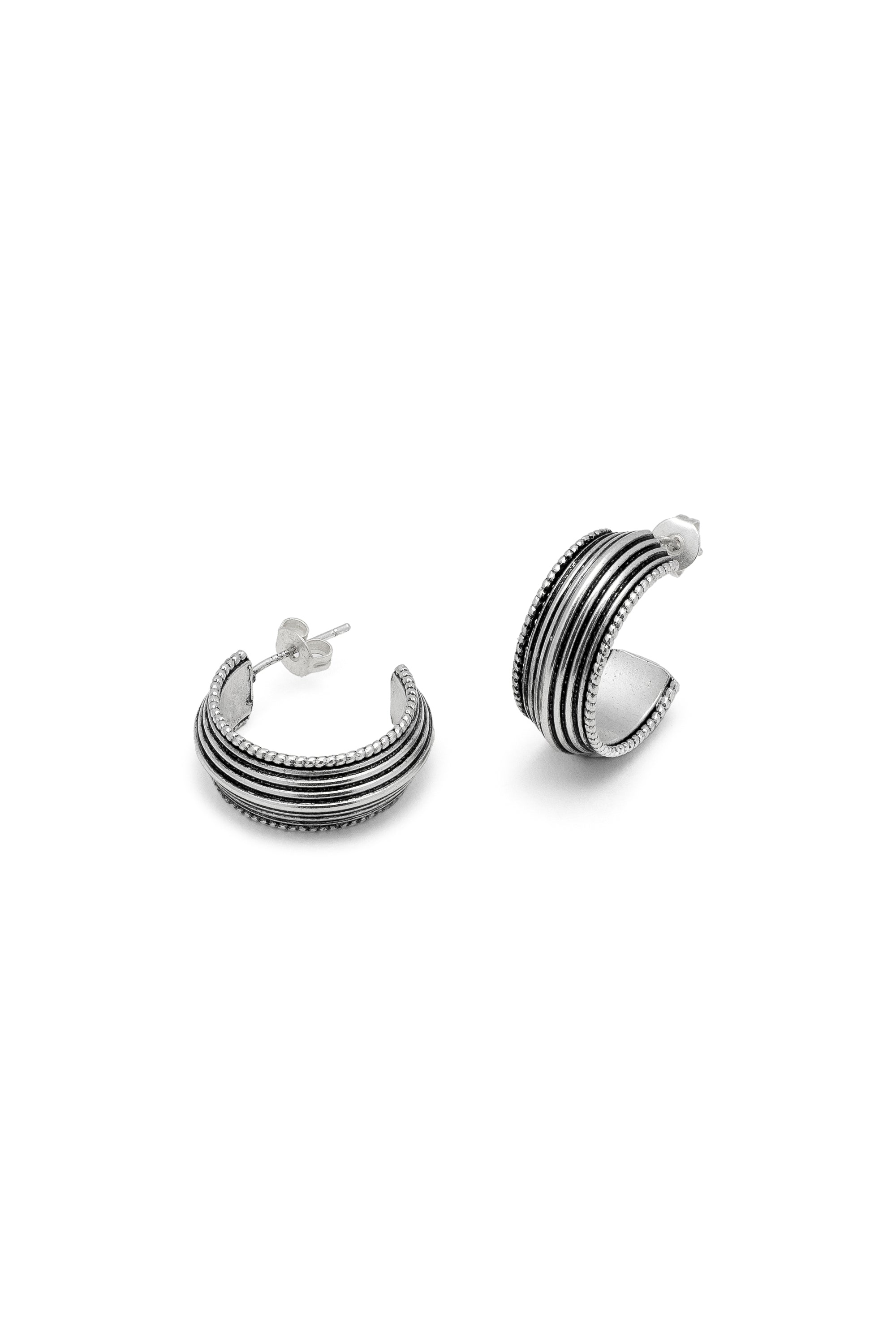 Peque?os pendientes semicirculares, ?nicos gracias a un trabajo que alterna finas l?neas y peque?os relieves con microesferas. Un cl?sico revisitado con un toque moderno, adecuado tanto para looks sencillos como para los m?s estructurados. Di?metro 1,5 cm. Cierre de pasador con mariposa. Chapado en plata. Nickel tested.