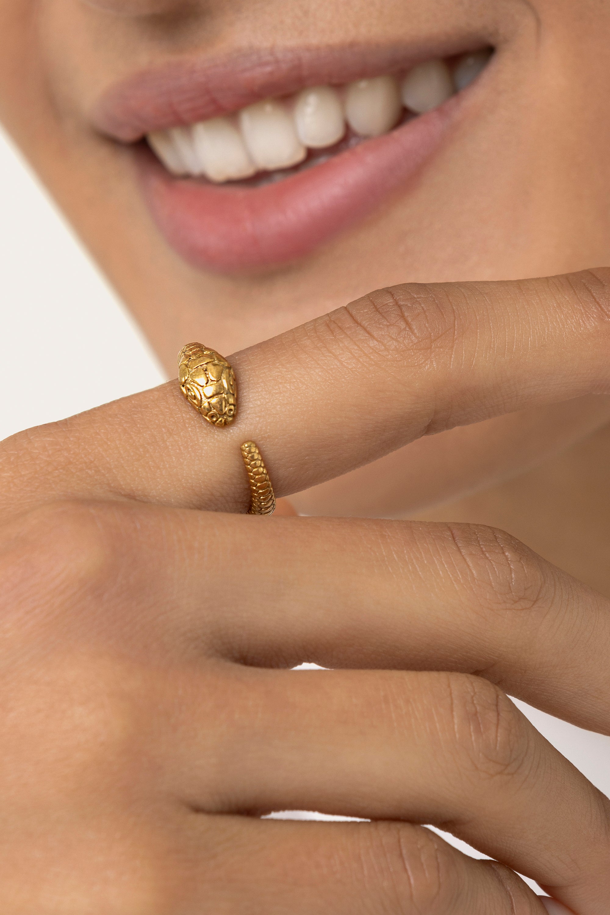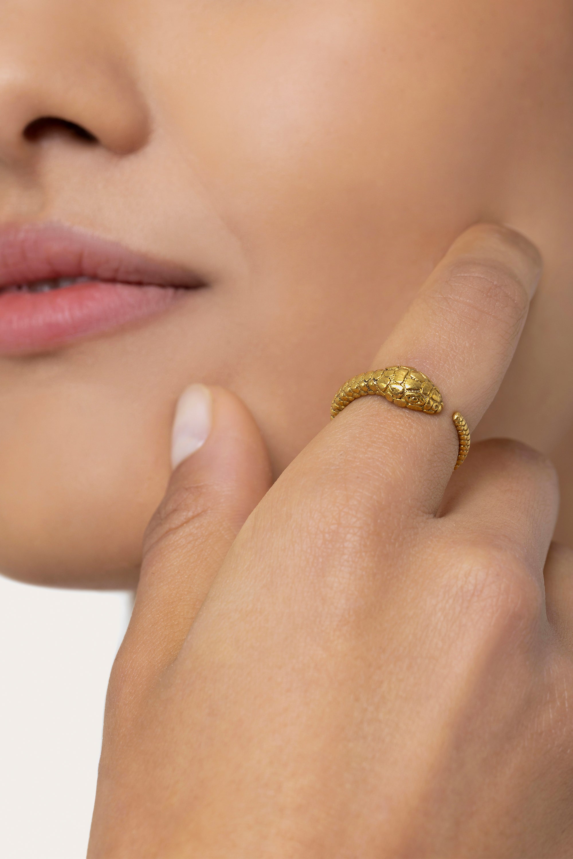 Anillo serpiente abierto y ajustable con textura grabada efecto snake-skin: la curva envolvente esculpe el dedo con un allure icónica —con garra pero refinada—, perfecto solo o en stack para el día a día. Realizado a mano en latón reciclado. Nickel tested. Elaboración artesanal. Joyas hechas a mano, únicas y artesanales, perfectas para todos tus looks o como idea de regalo.