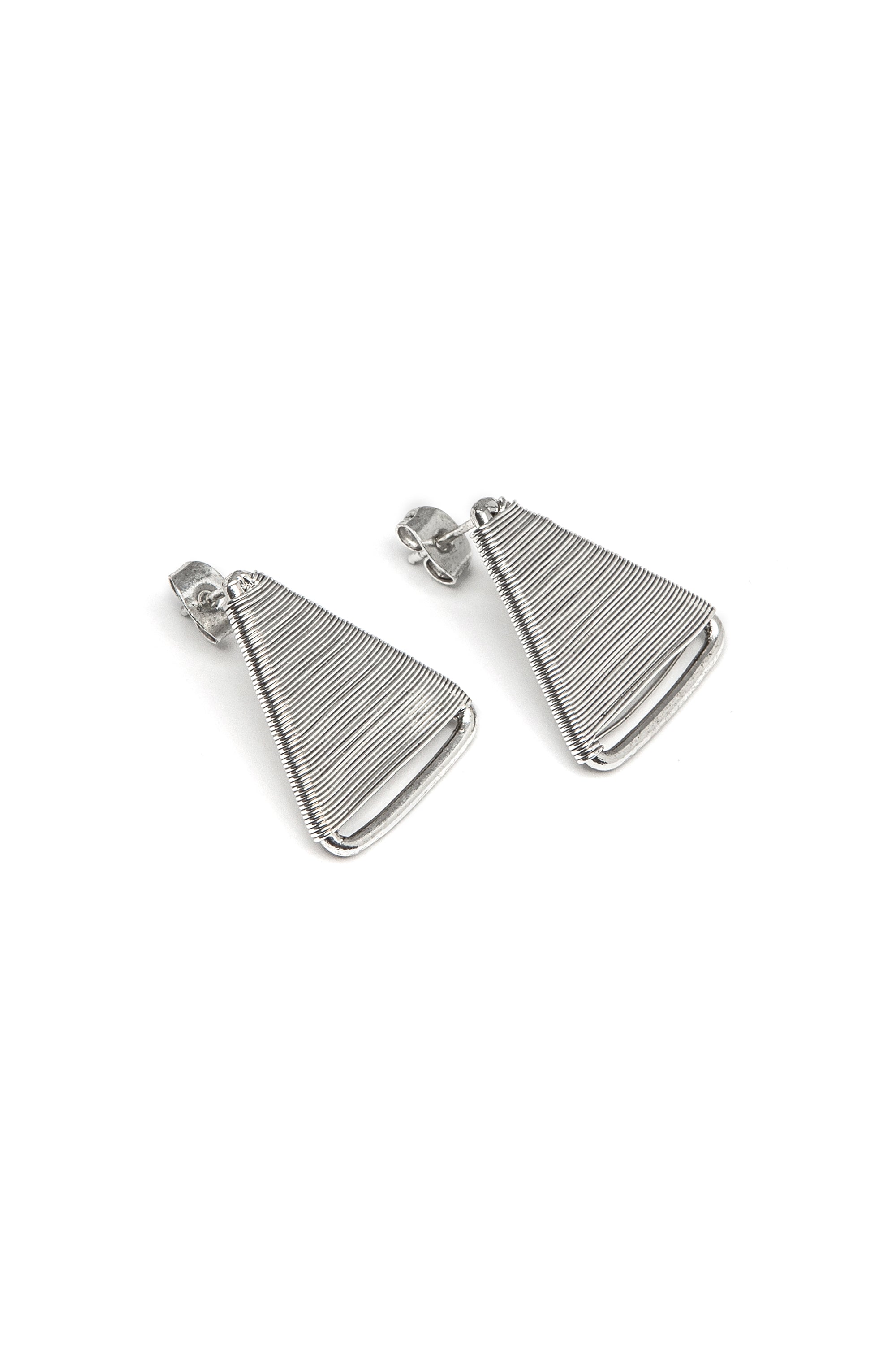 Pendientes triángulo con hilo fino trabajado a mano para un efecto elegante y compacto. Medida aprox. 2,5 cm. Cierre de mariposa. Bañado en plata. Nickel tested. Joyas hechas a mano, únicas y artesanales, perfectas para todos tus looks o como idea de regalo.