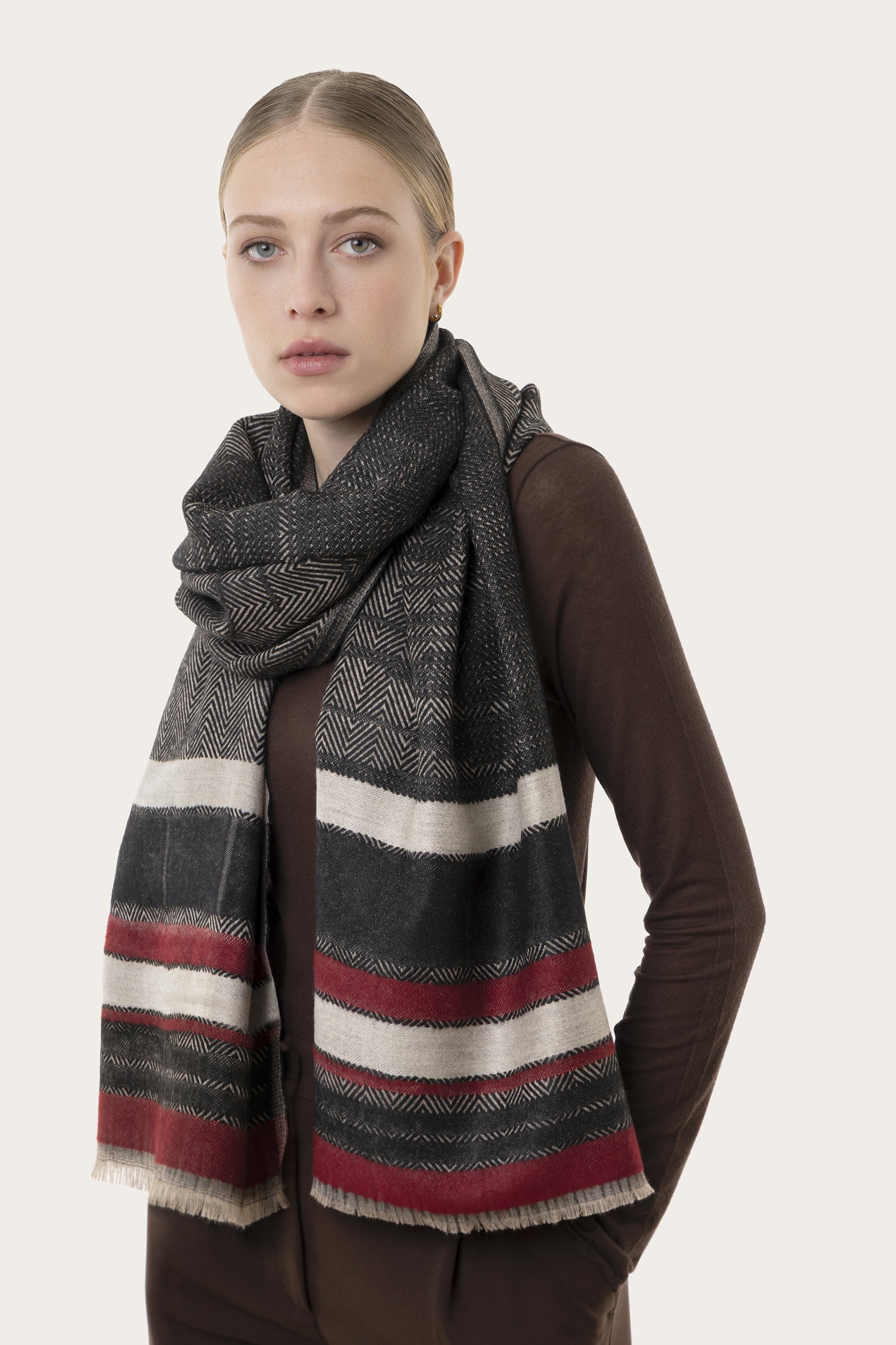 La bufanda Cefeo está confeccionada en mezcla de algodón y lana. Ligera, suave y envolvente, se caracteriza por un estampado geométrico minimal. Combínala con tus joyas y bolsos favoritos para completar tu look. Medida: 70x180 cm. Acabado artesanal.