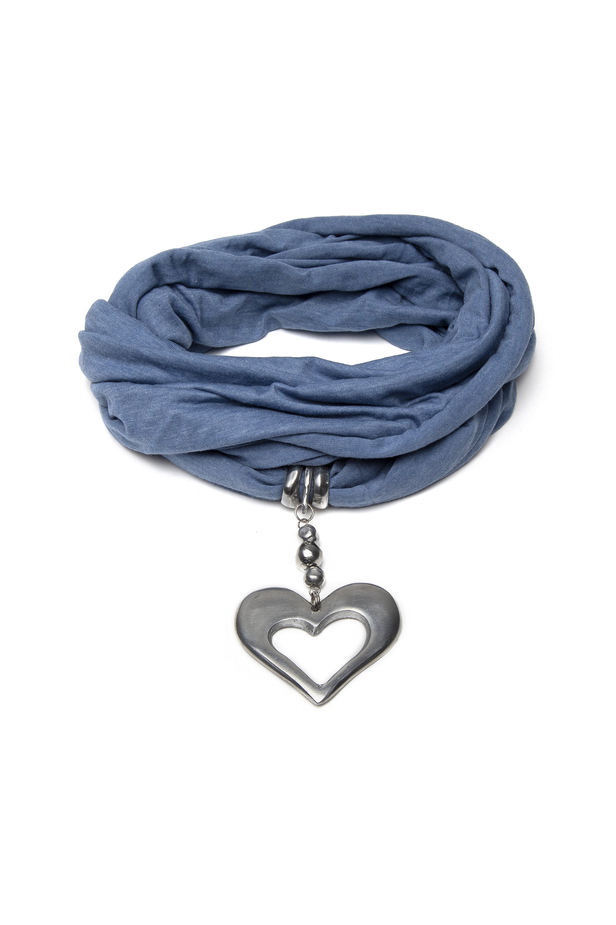 Un accesorio de estilo casual chic, pensado para acompañarte en cada momento del día. Confeccionada en suave jersey y realzada con un colgante en forma de corazón calado en aluminio 100% reciclado, esta bufanda aúna confort, estilo y versatilidad. Perfecta para llevar siempre en el bolso, añádela a tus looks como toque final day&night. Color vaquero. Nickel tested. Elaboración artesanal. Joyas hechas a mano, únicas y artesanales, perfectas para todos tus looks o como idea de regalo.