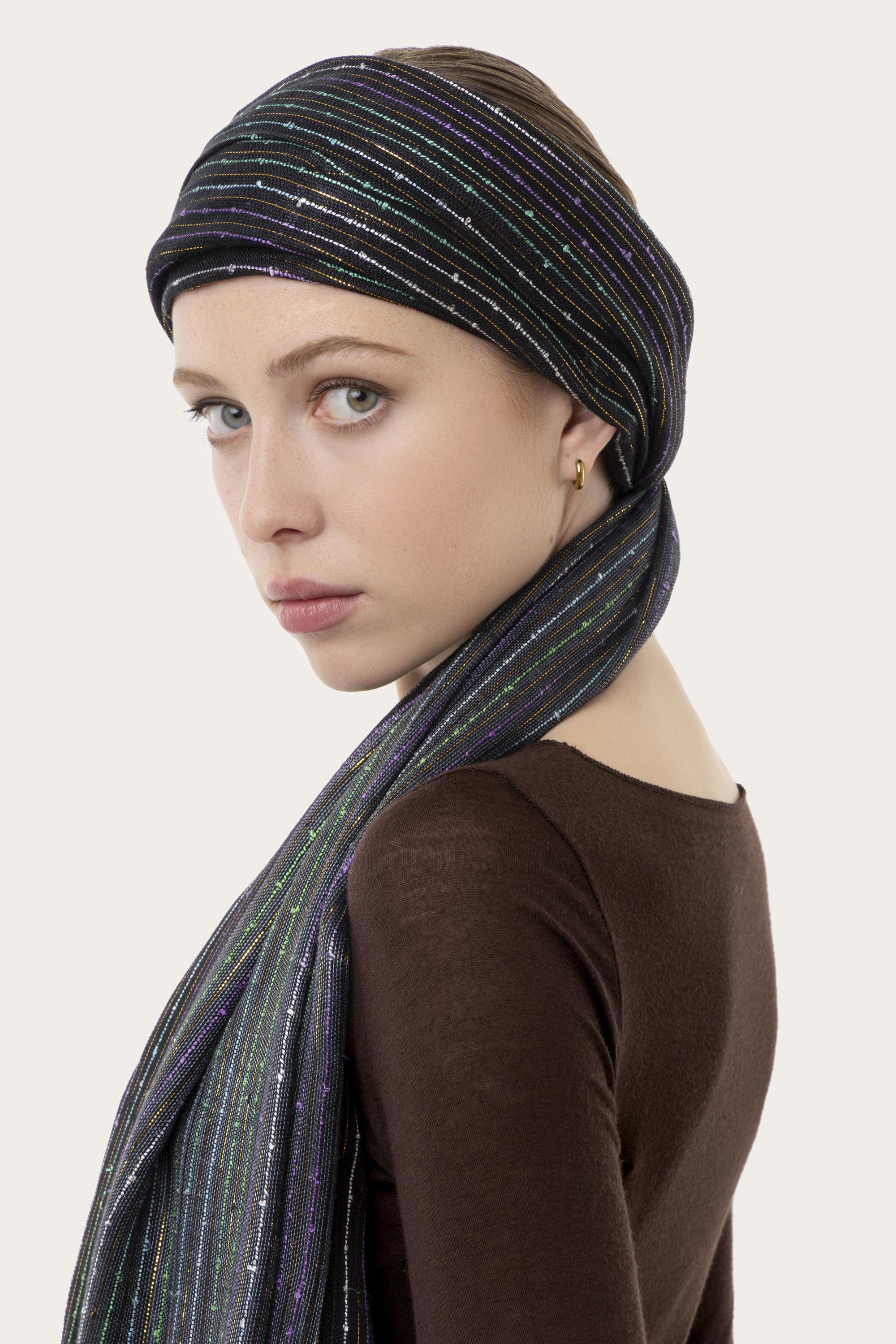 La bufanda Orión está confeccionada en 100% rayón. Ligera, suave y envolvente, se caracteriza por una textura de rayas vibrante y brillante, disponible en dos colores. Combínala con tus joyas y bolsos favoritos para completar tu look. Medida: 100x180 cm. Acabado artesanal.