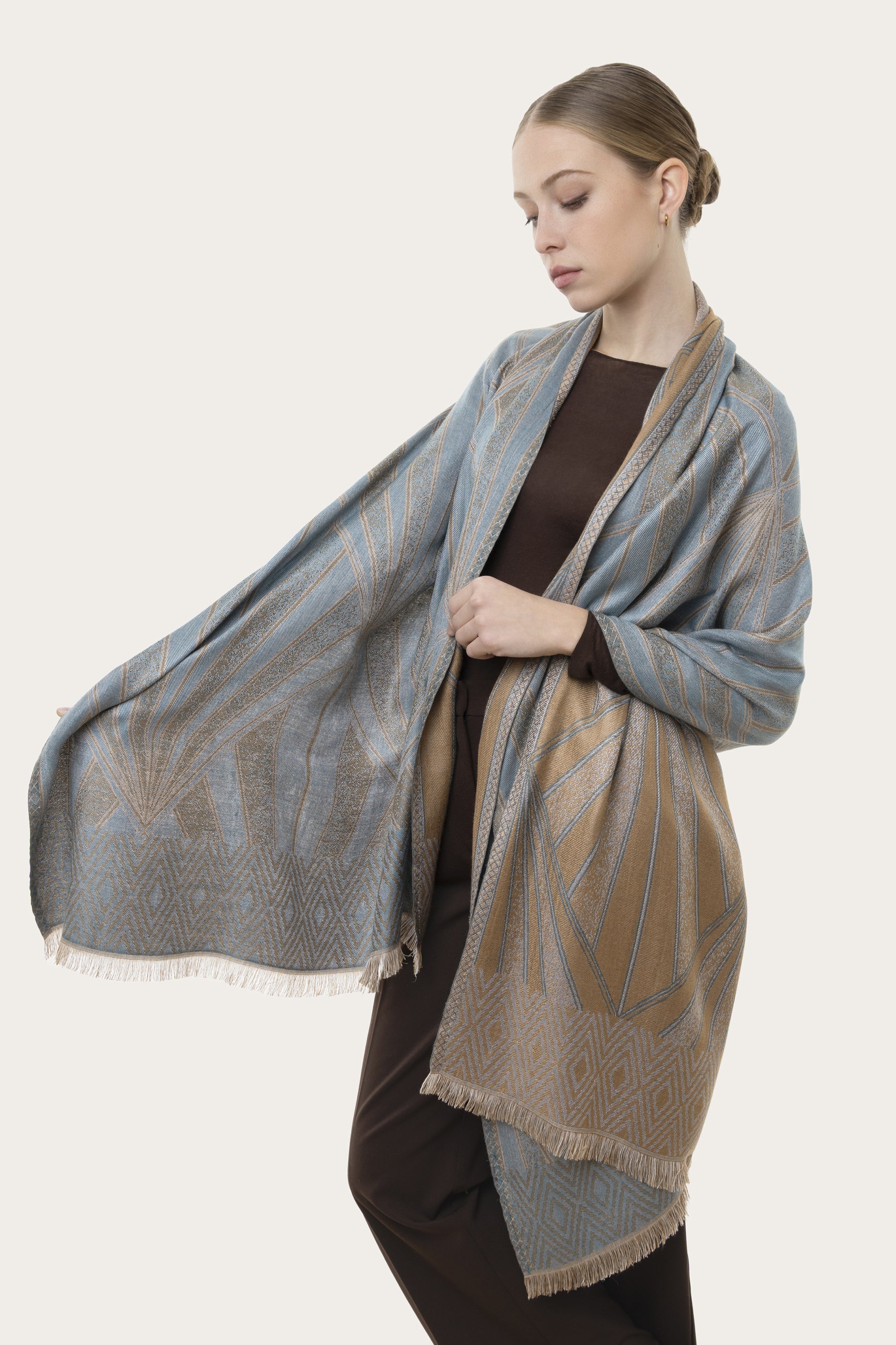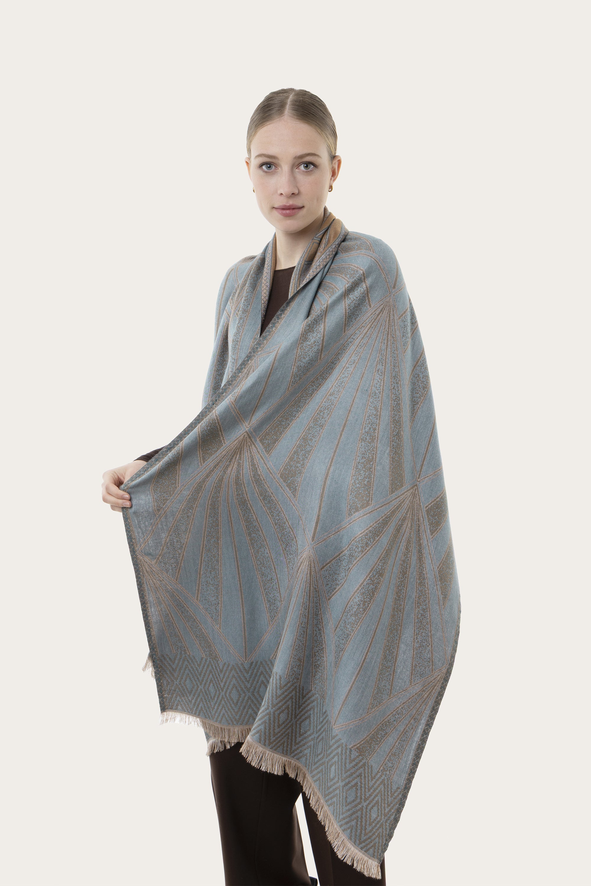 La bufanda Saturno está confeccionada en 100% viscosa. Ligera, suave y envolvente, se caracteriza por un estampado geométrico elegante y minimal. Modelo reversible. Combínala con tus joyas y bolsos favoritos para completar tu look. Medida: 70x180 cm. Acabado artesanal.