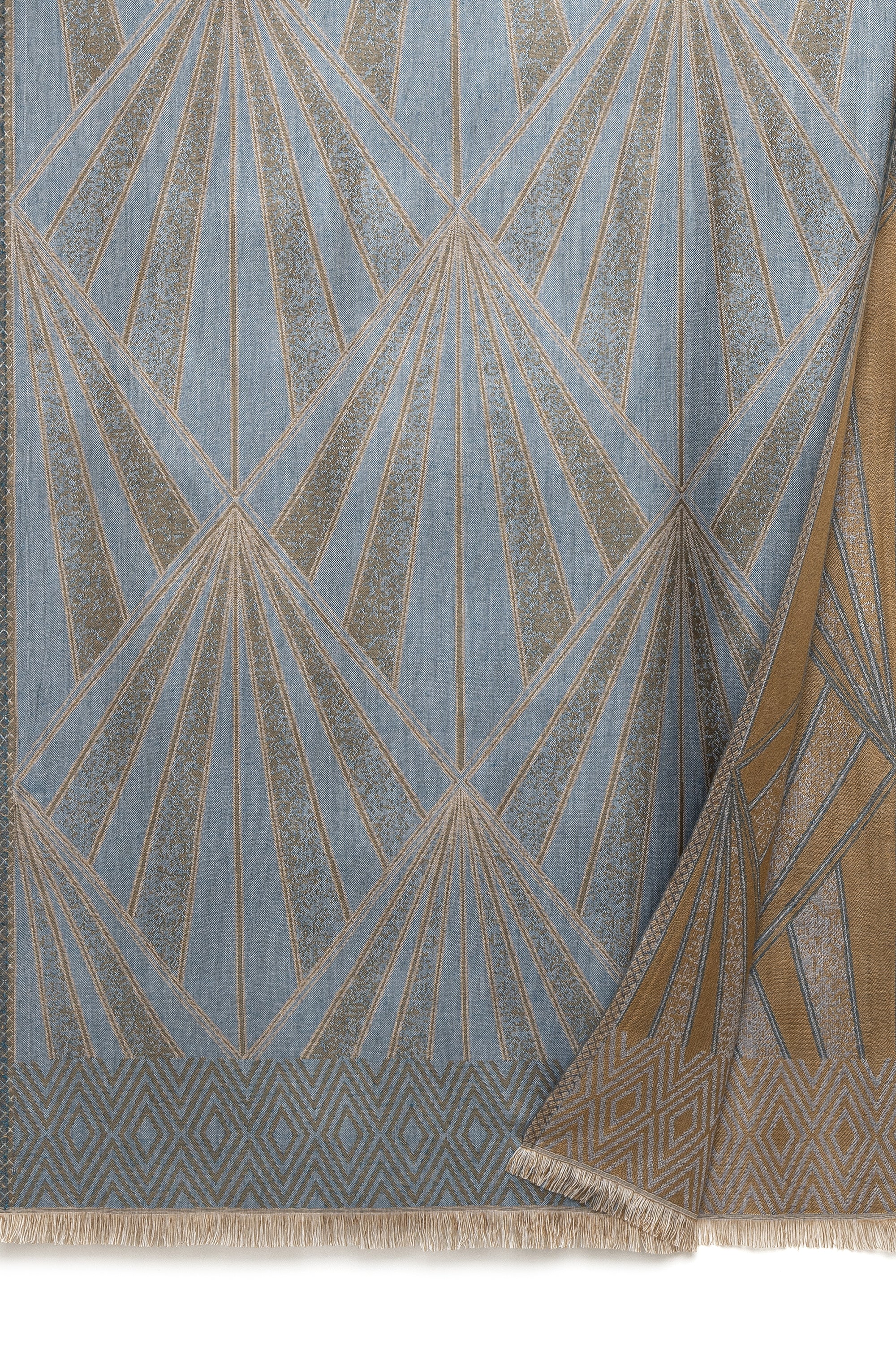 La lavorazione è curata nei dettagli: tessiture double face e ricami a mano creano eleganti contrasti, mentre i fili di lurex aggiungono riflessi traslucidi. I trattamenti stonewashed donano un effetto “vissuto” e il foil print—stampa a caldo con sottile lamina metallizzata—illumina le superfici. Completano il tutto il filo tinto e la lamina dorata a caldo per un tocco prezioso.