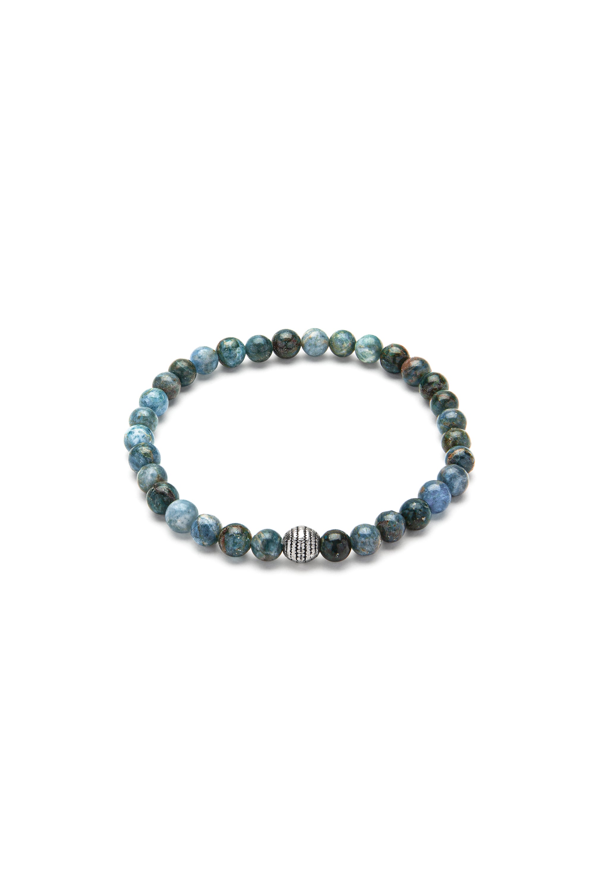 Pulsera elástica con piedras de apatita azul y aplicaciones chapadas en plata. Fabricación artesanal. Producto sometido a pruebas de níquel. Joyas hechas a mano, únicas y artesanales, perfectas para todos tus looks o como idea para regalar para él.
