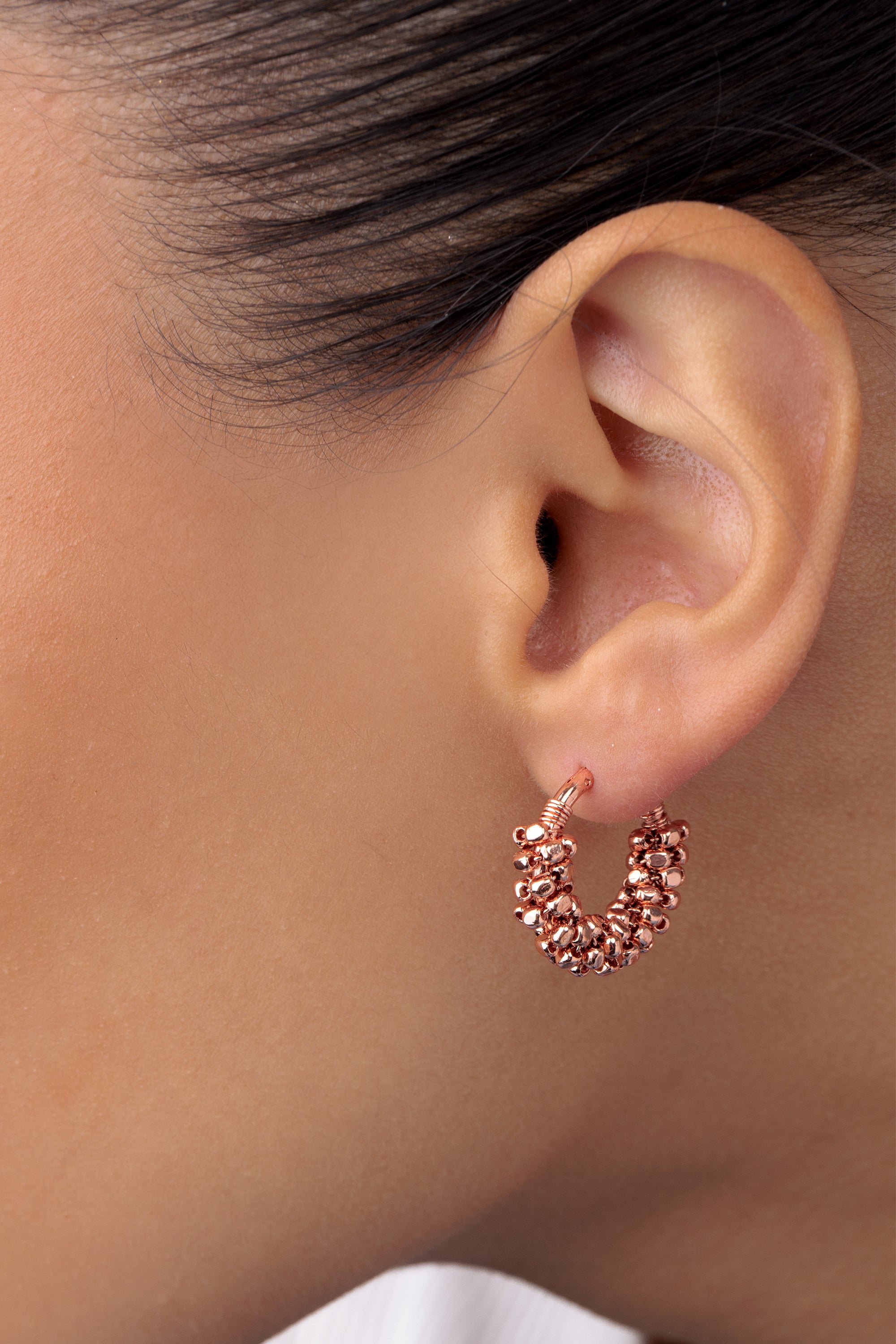Mini aros chapados en cobre con pepitas cobrizas de acabado pulido. Compactos y versátiles—el toque chic de día que funciona también de noche. Cierre: aro con clic (bisagra). Testado al níquel. Artesanal. Hechos a mano. Piezas únicas, perfectas para cualquier look o como idea de regalo.