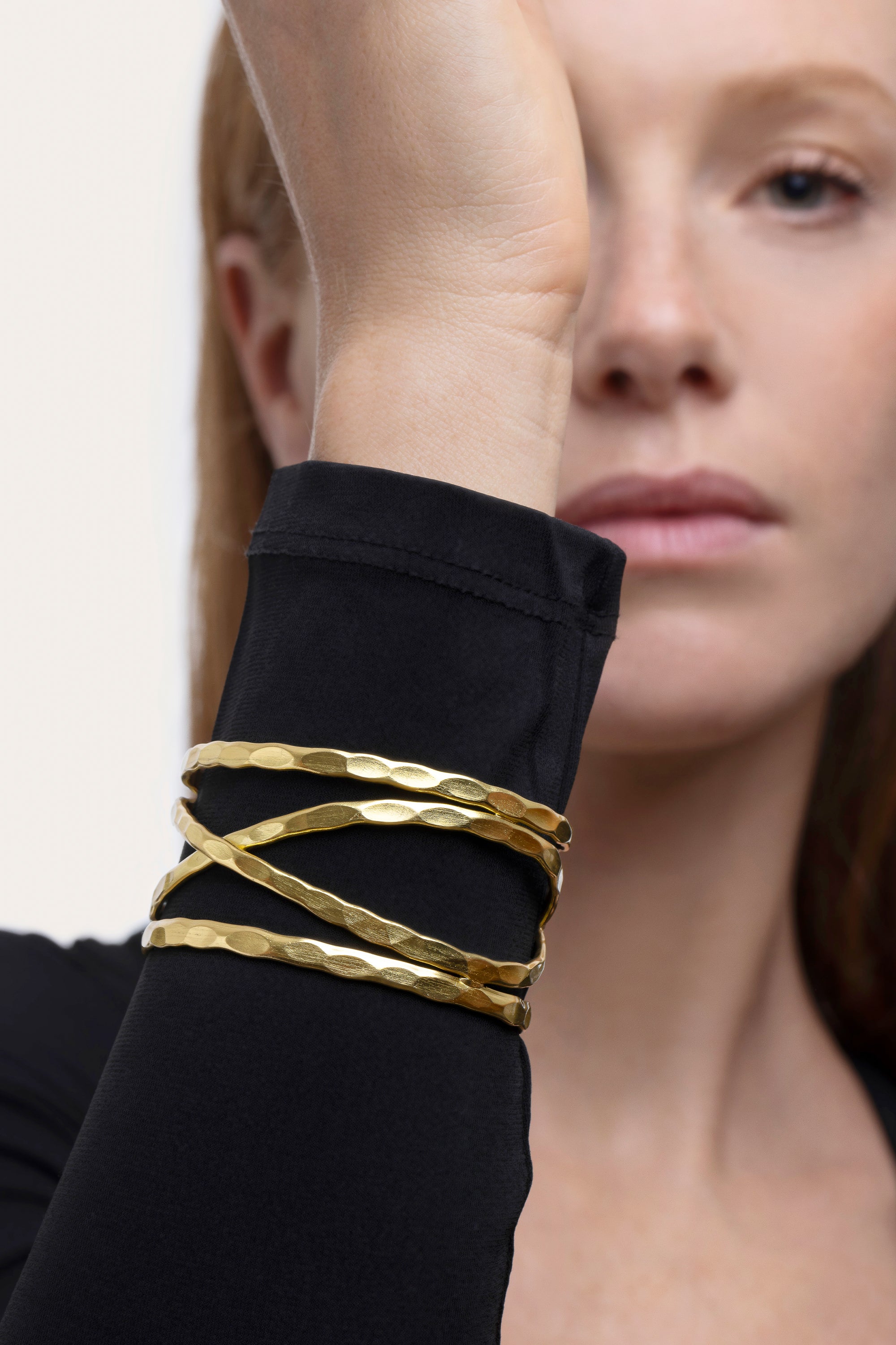 Pulsera de banda abierta con siluetas entrelazadas de latón. Modelo regulable. Crea tu propia mezcla de pulseras combinando diferentes modelos, ligeros y cómodos de llevar. Producto sometido a pruebas de níquel. Joyas hechas a mano, únicas y artesanales, perfectas para todos tus looks o como idea para regalar.