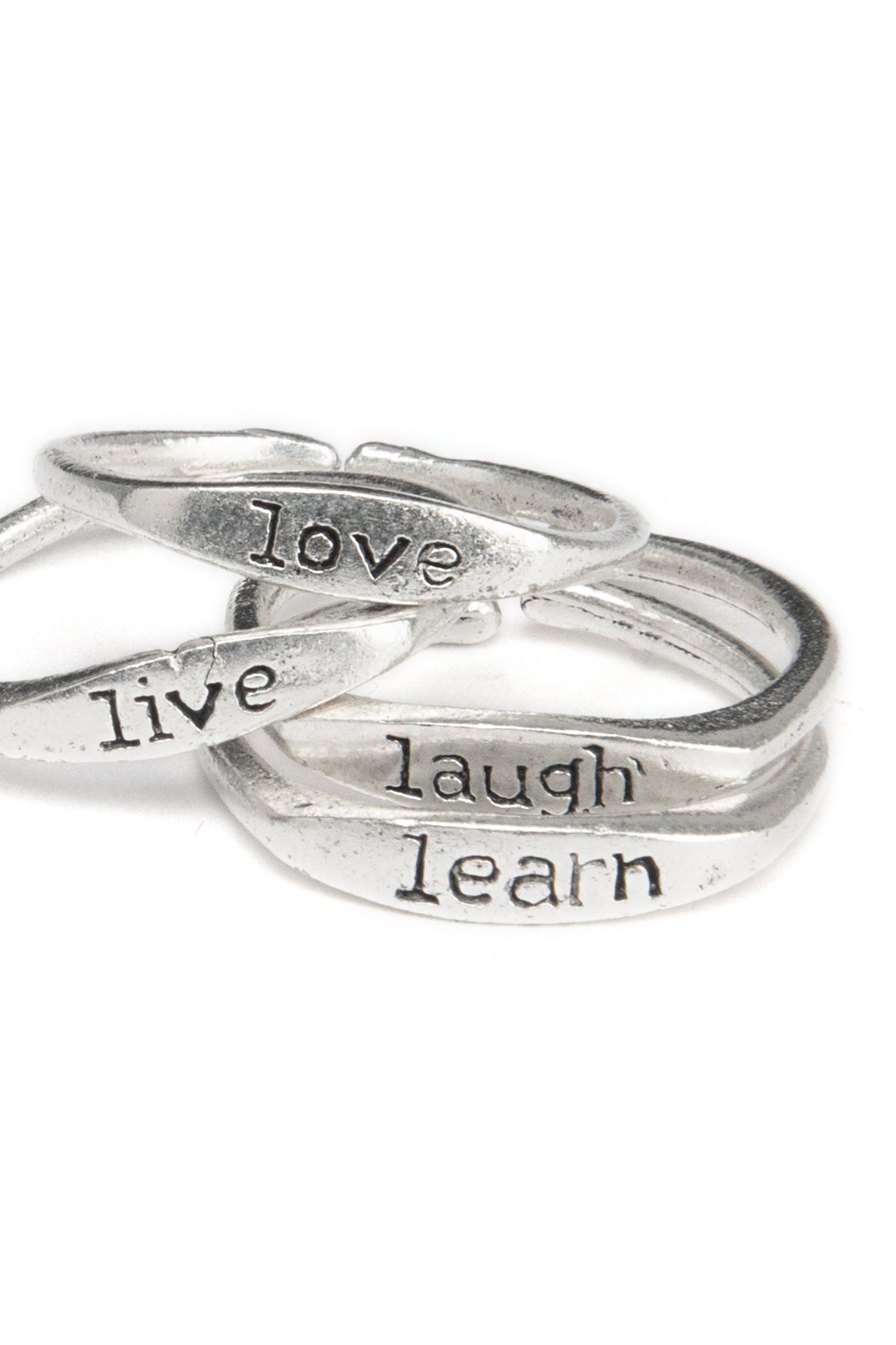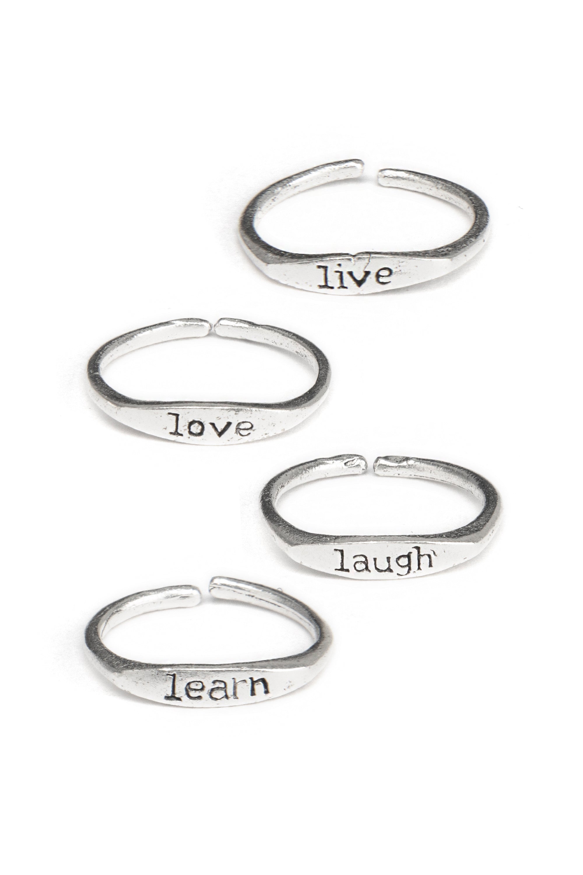 Set de anillos finos con palabras grabadas live/love/laugh/learn: pequeños mensajes para llevar y mezclar en los dedos. Ajustables, se adaptan con facilidad y combinan con manicuras y ring stacks. Baño de plata 100% artesanal. Nickel tested. Elaboración artesanal. Joyas hechas a mano, únicas y artesanales, perfectas para todos tus looks o como idea de regalo.