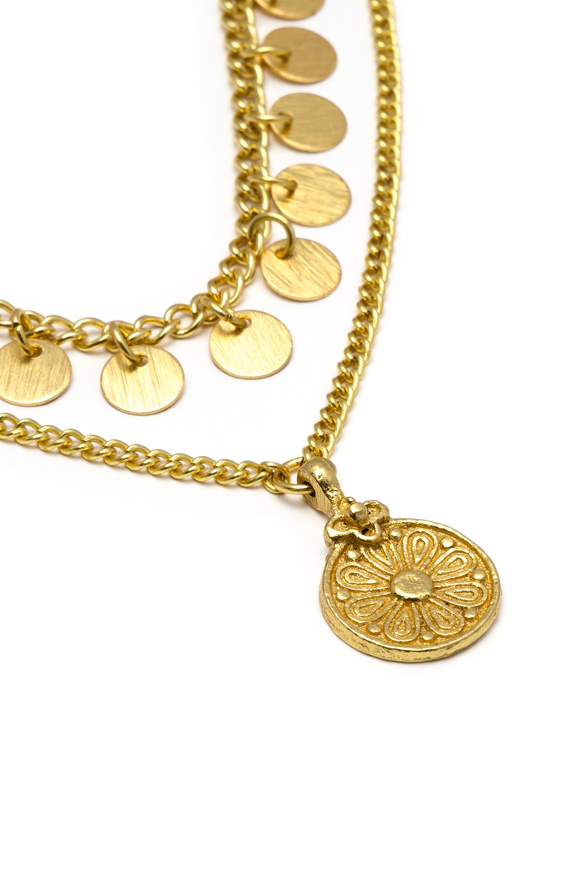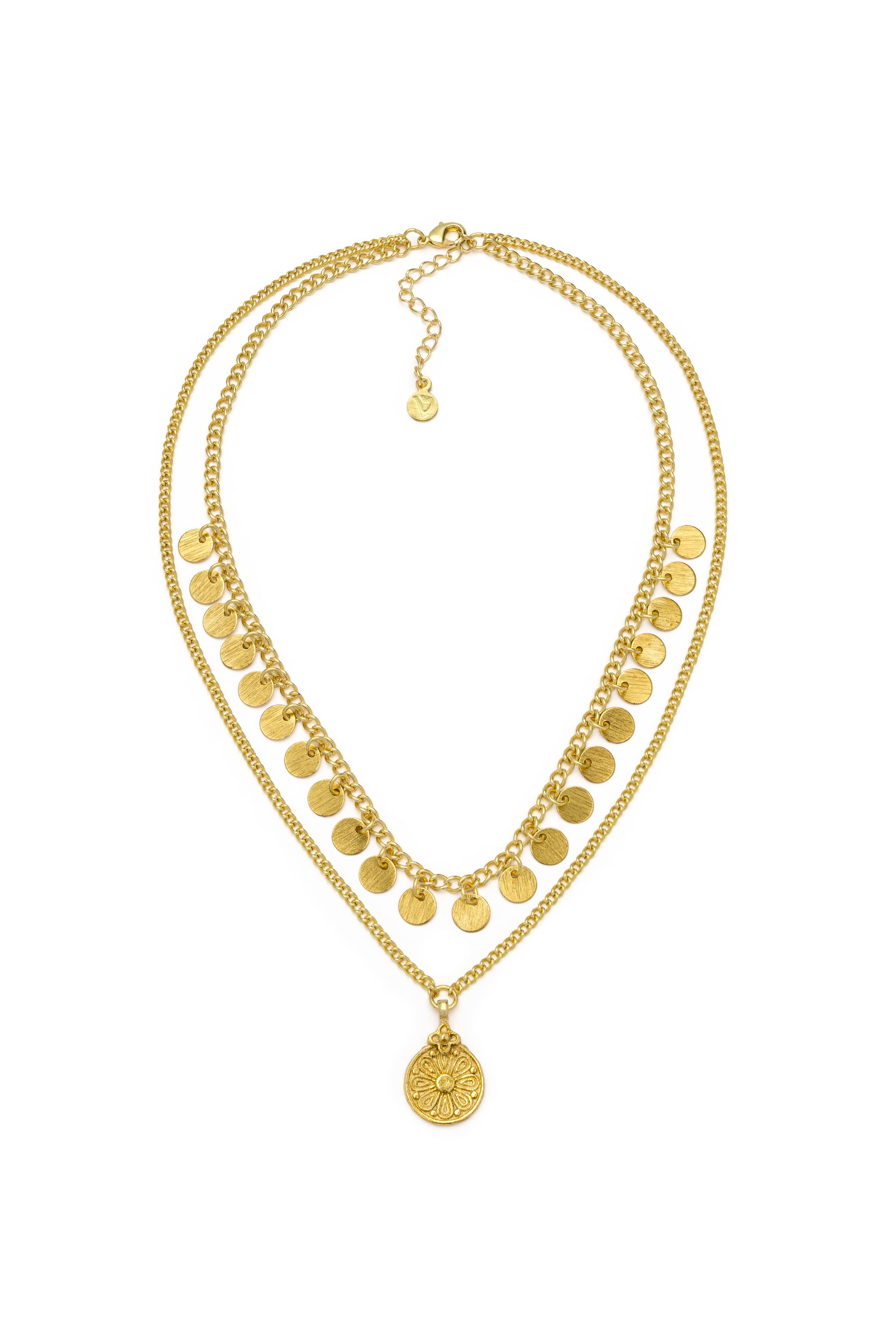 Collar de dos hilos en latón reciclado con colgantes de monedas. Longitud del collar: 445 cm. Cadena adicional de 6,5 cm. Cierre ajustable con mosquetón. Nickel testado. Artesanía hecha a mano. Joyas únicas y artesanales, ideales para complementar cualquier look o como un regalo especial.