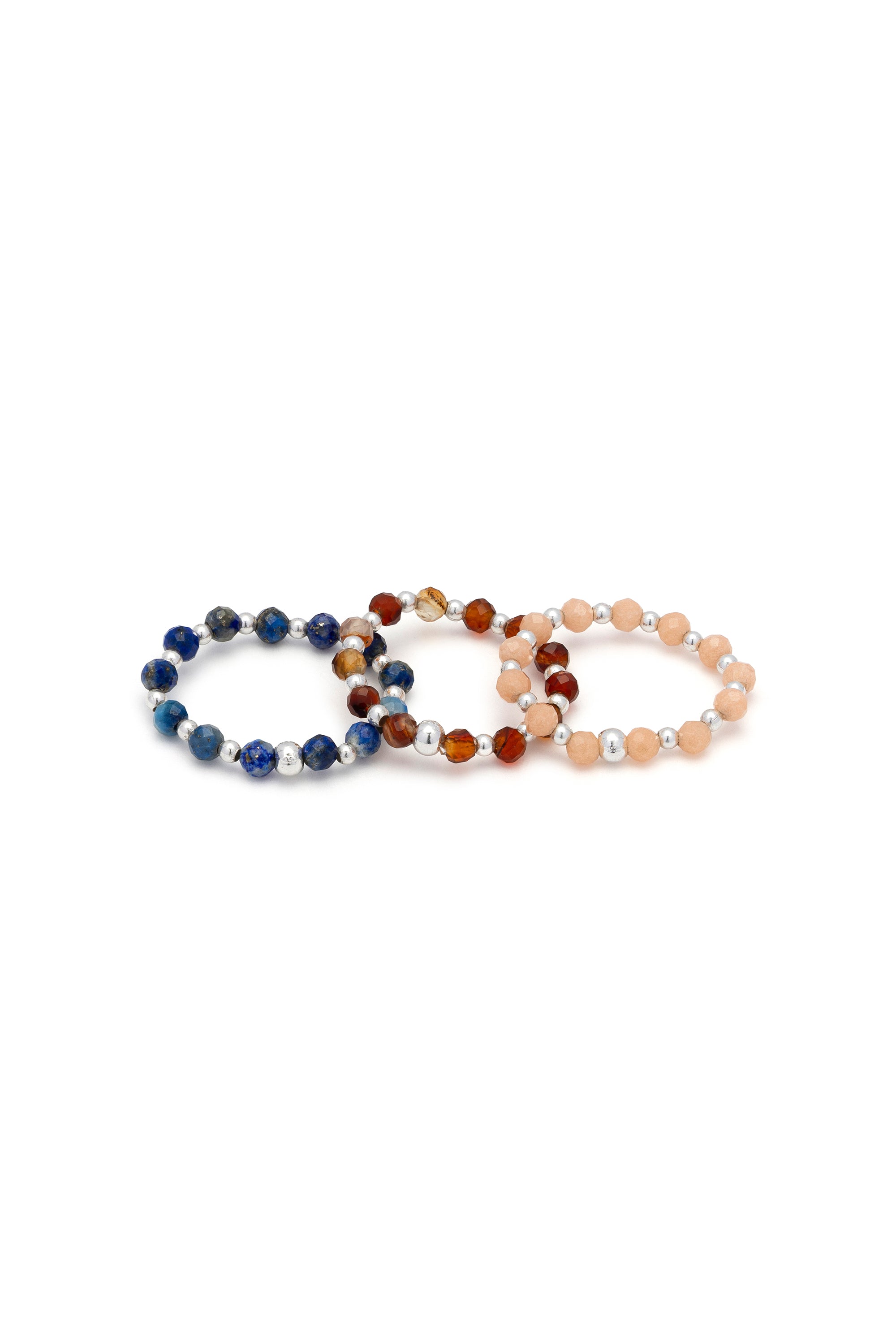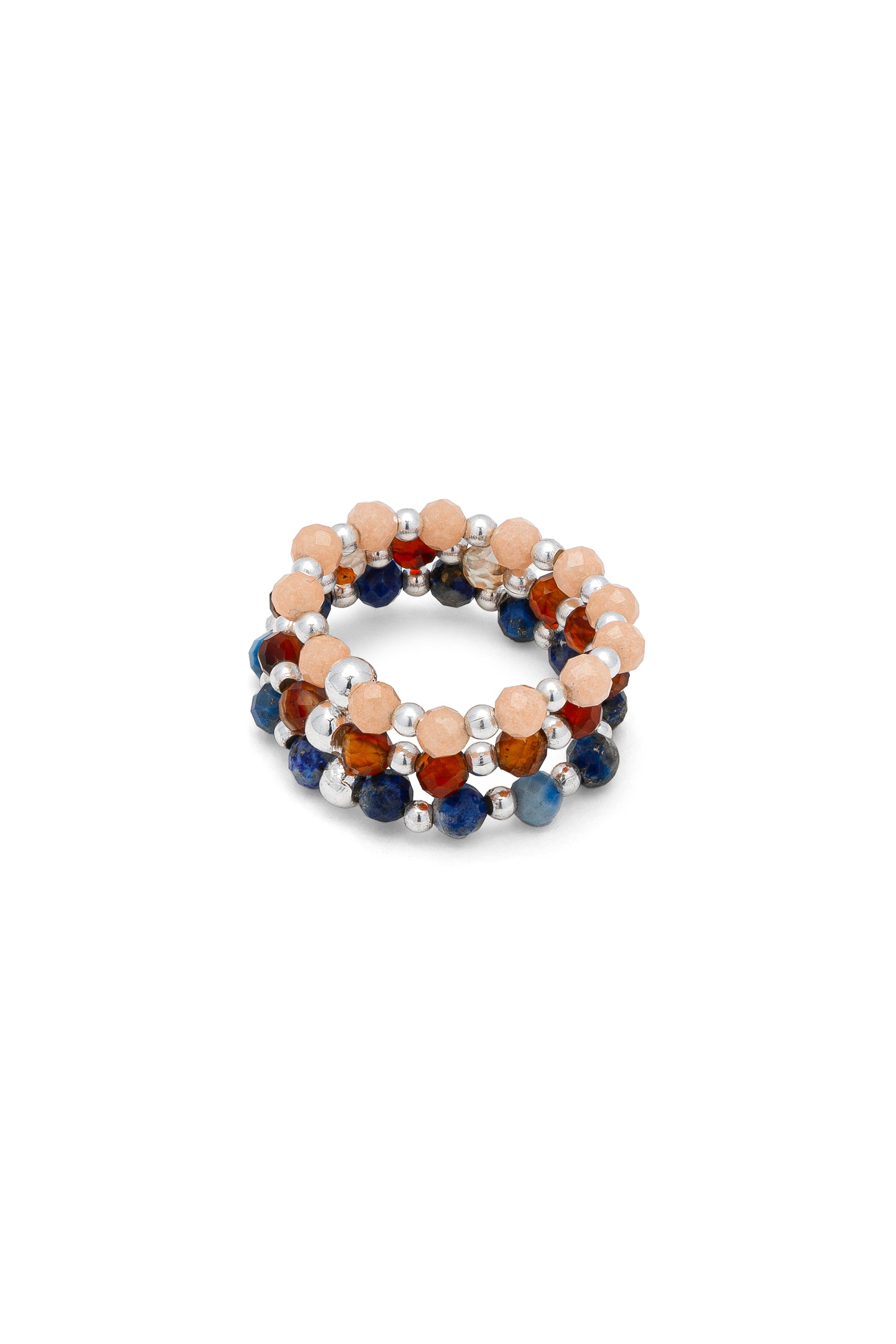 Un conjunto compuesto por tres anillos el?sticos realizados con peque?as piedras de colores, intercaladas con microesferas luminosas de plata. Vers?tiles y divertidos, est?n pensados para llevarse juntos o por separado, creando tu propia combinaci?n favorita. Modelo ajustable. Piedras aut?nticas y chapado en plata. Nickel tested.