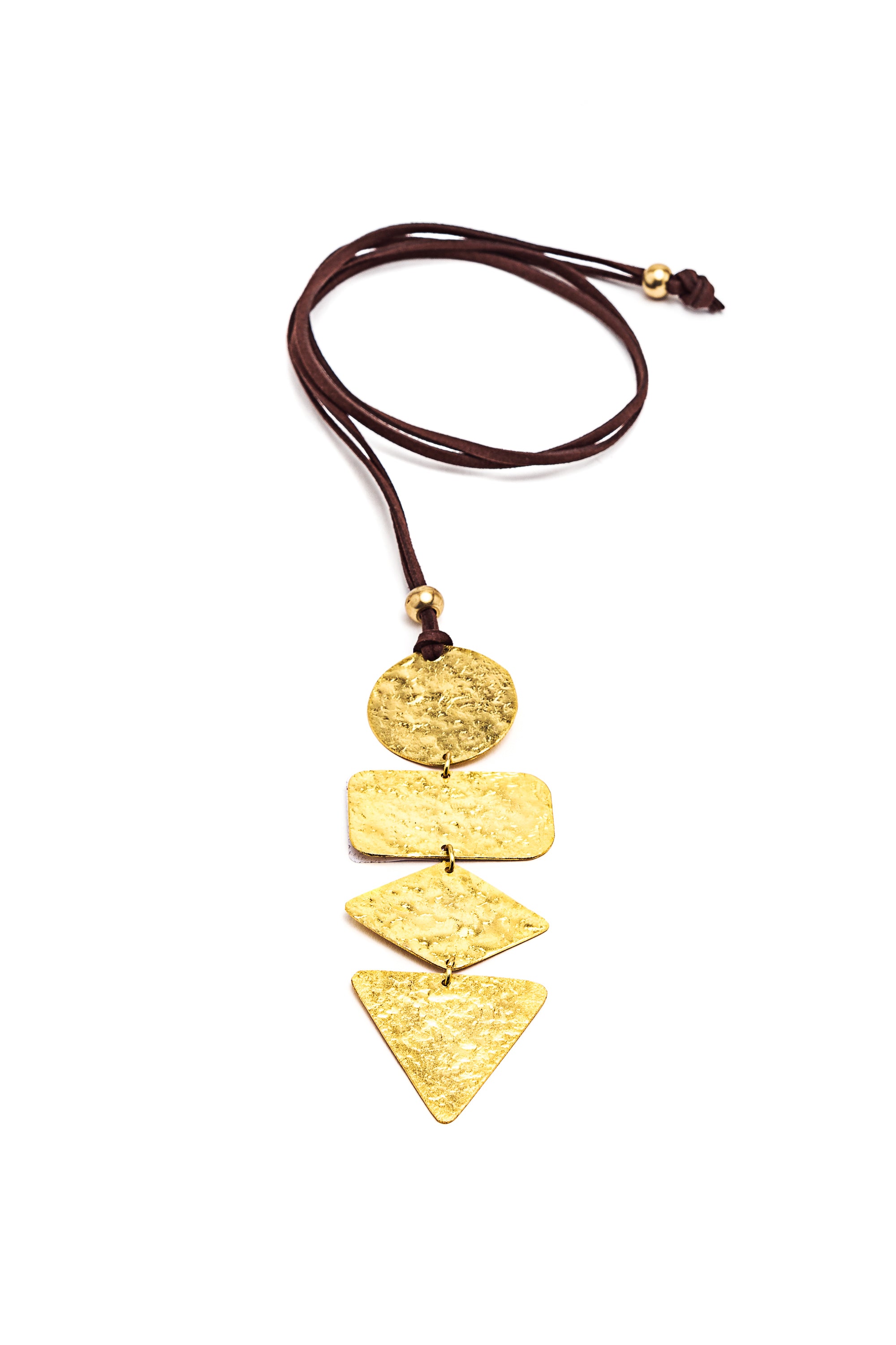 Colgante escénico de cuatro elementos geométricos martillados, montado sobre cordón deslizante color cacao: el colgante es regulable para llevarlo corto o largo. Realizado a mano en latón reciclado. Nickel tested. Elaboración artesanal. Joyas hechas a mano, únicas y artesanales, perfectas para todos tus looks o como idea de regalo.