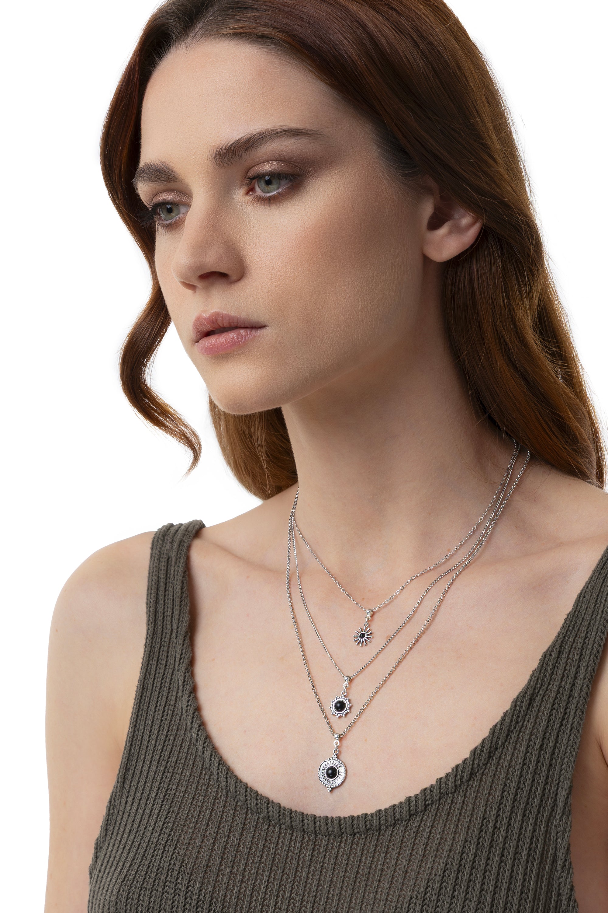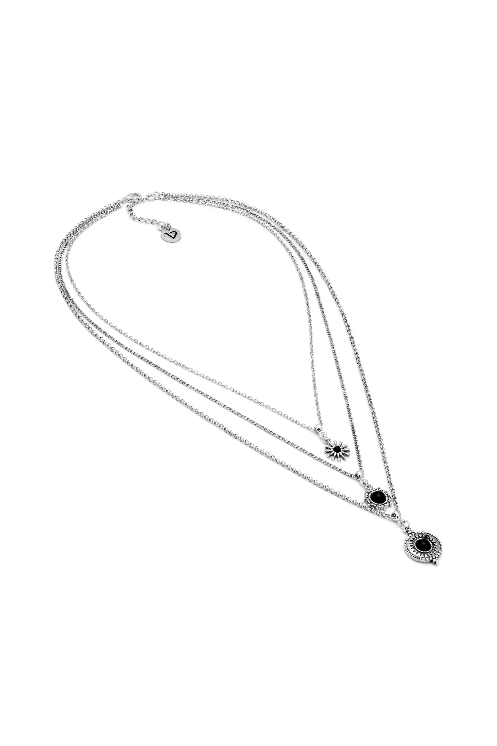 Tres collares en uno: este modelo de tres niveles crea un efecto multicapa ya listo, con peque?os soles y detalles negros que llaman la atenci?n. Un accesorio con car?cter que combina formas ic?nicas y dise?o contempor?neo, perfecto para realzar incluso el look m?s sencillo. Longitud ajustable. Chapado en plata. Nickel tested.