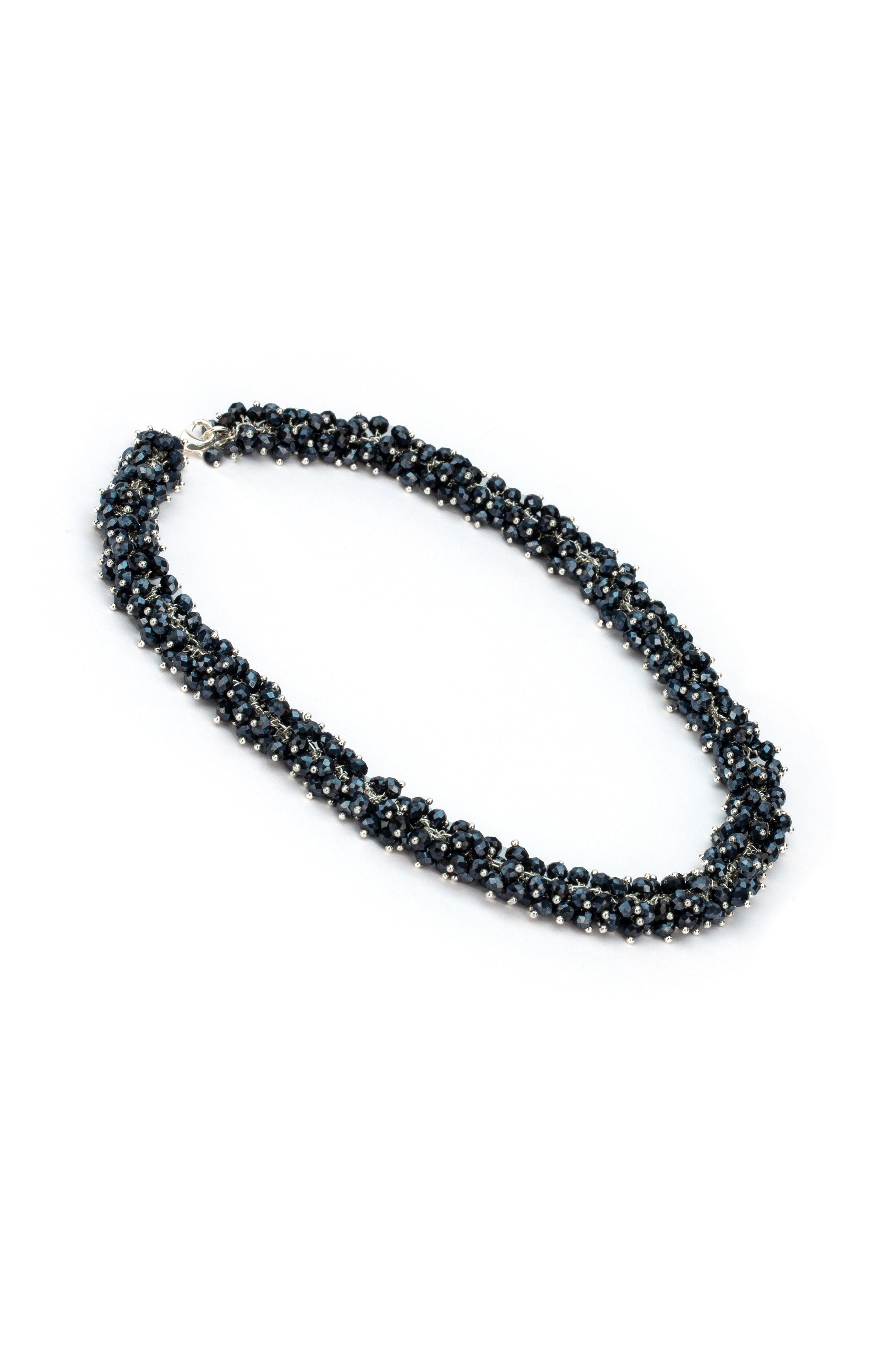 Collar Mogra Azul Noche: cristales azul noche en estilo guirnalda, trabajados a mano con la técnica mogra para un efecto pétalo rico y reluciente que enmarca el escote con elegancia atemporal; perfecto para ceremonias, invitaciones y looks de noche. Cierre ajustable con mosquetón. Material: vidrio coloreado y chapado en plata 100% artesanal. Testado al níquel. Trabajo artesanal. Joyería hecha a mano, única y artesanal, perfecta para todos tus looks o como idea de regalo.