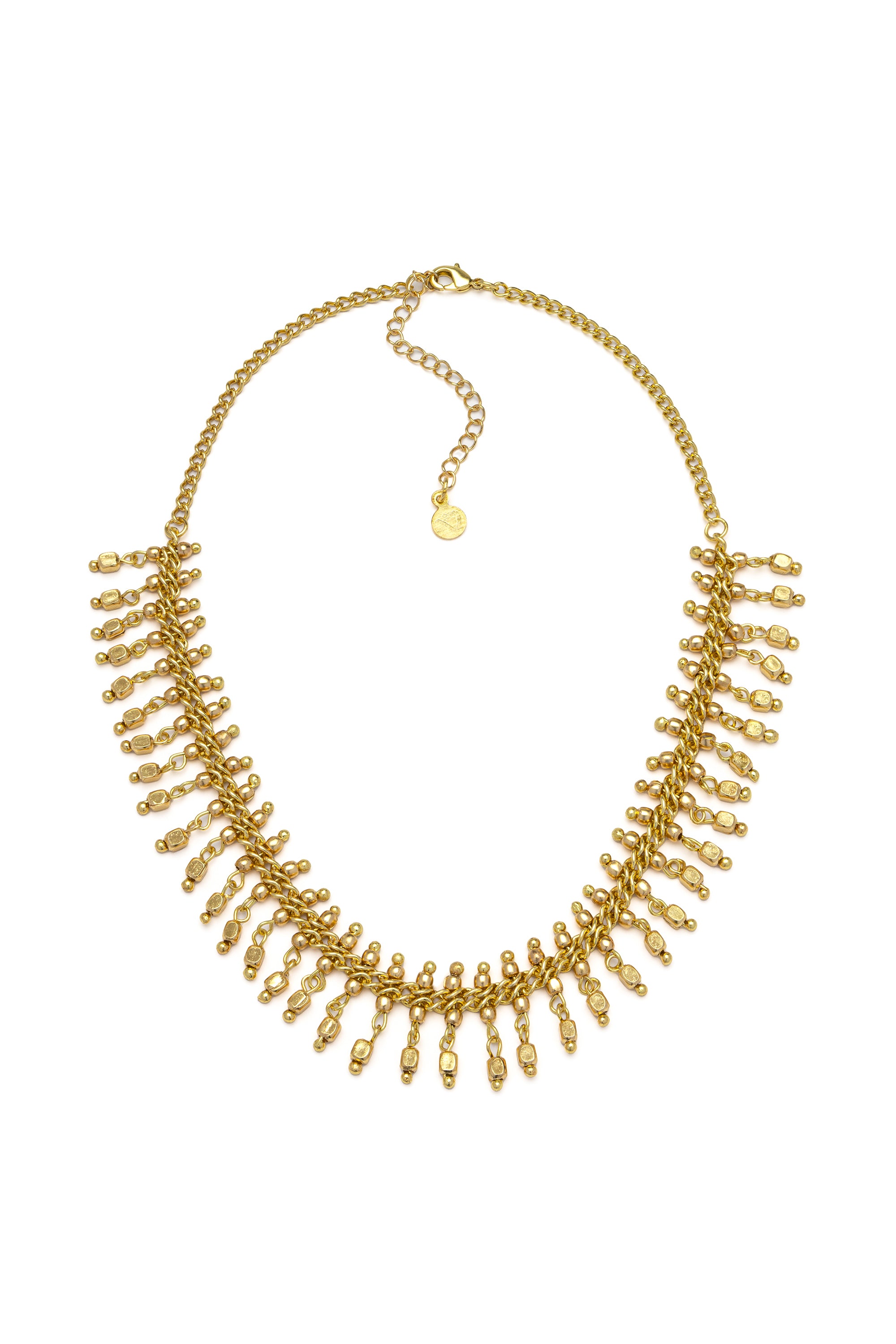 Collar de latón reciclado con pequeños elementos colgantes de forma irregular. Longitud del collar: 40 cm. Cadena adicional de 6,5 cm. Cierre ajustable con mosquetón. Nickel testado. Artesanía hecha a mano. Joyas únicas y artesanales, ideales para complementar cualquier look o como un regalo especial.