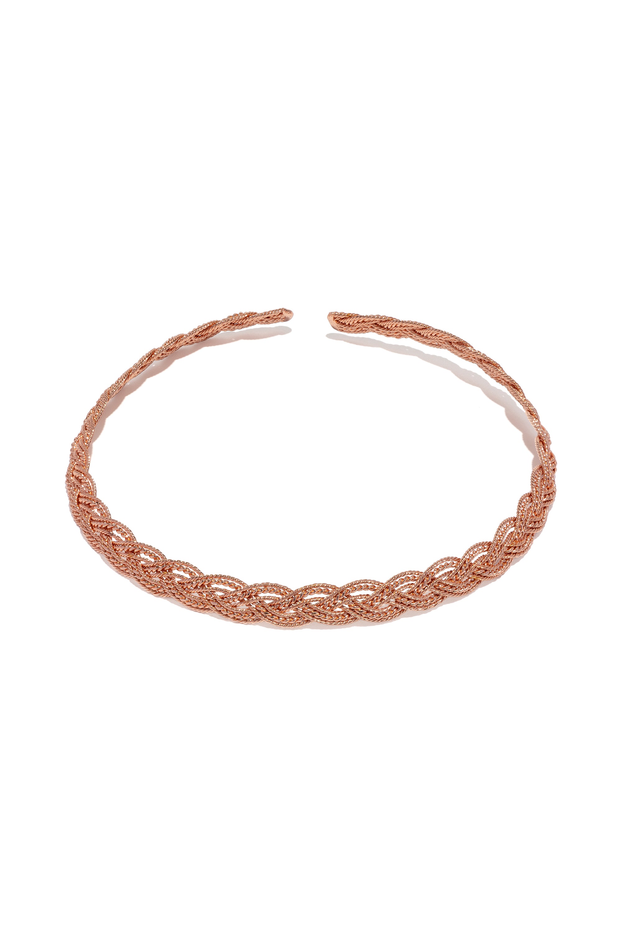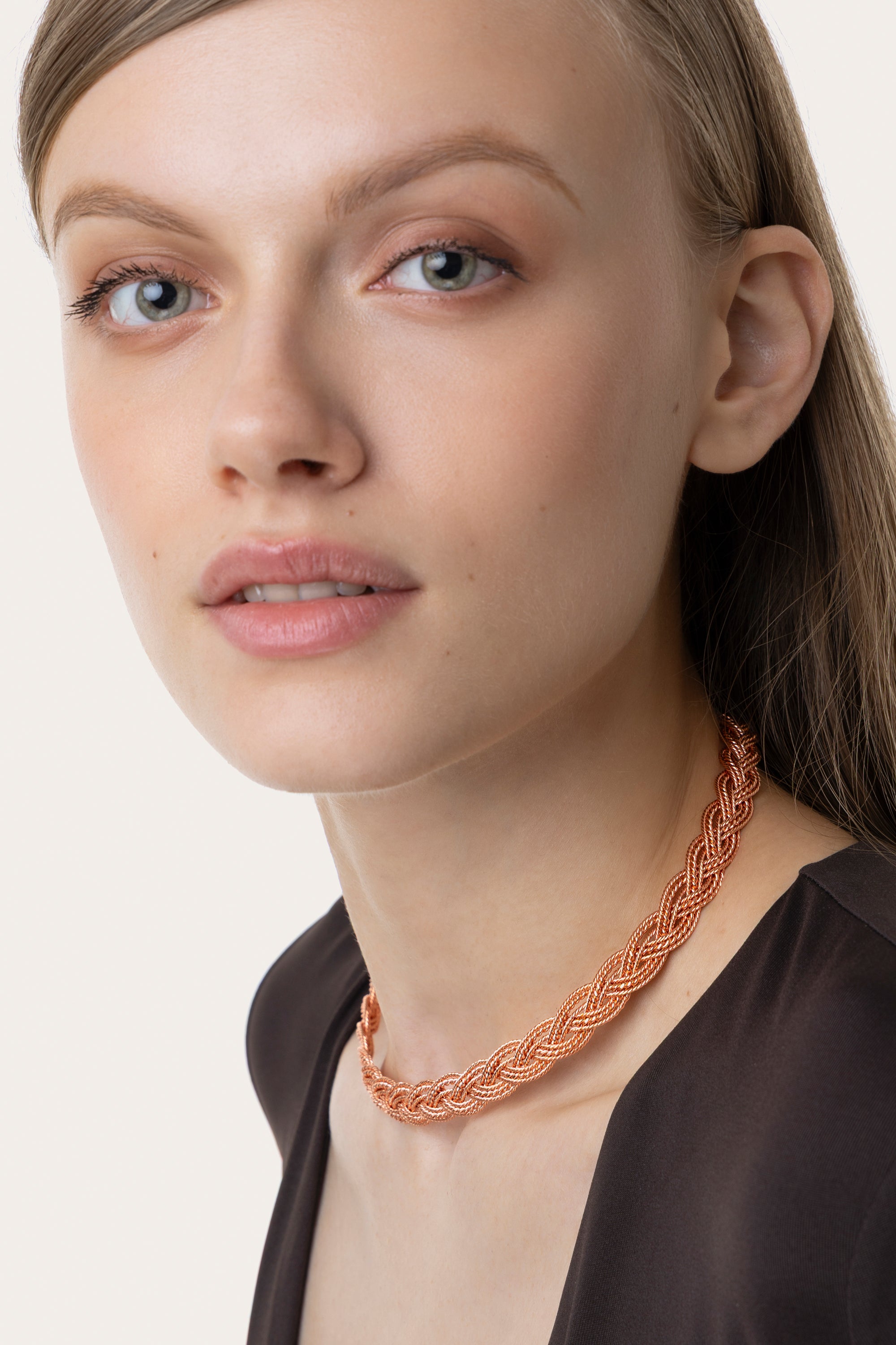 Collar gargantilla chapado en cobre ajustable, caracterizado por un trenzado tridimensional y envolvente trabajado a mano. Una joya escultórica, perfecta para realzar el escote con un toque de estilo audaz y vibrante. Joyas hechas a mano, únicas y artesanales, perfectas para todos tus looks o como idea de regalo. Níquel testado.