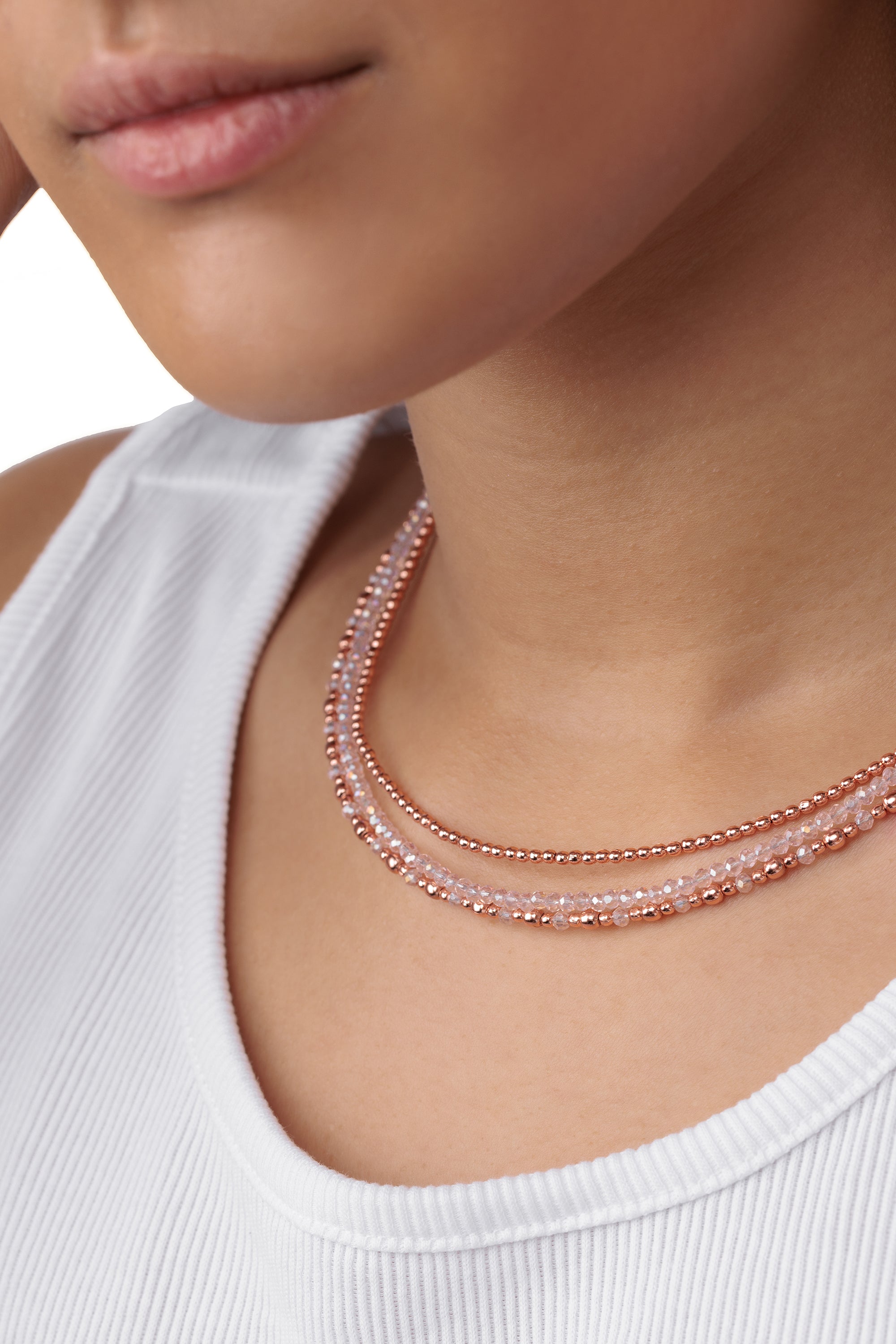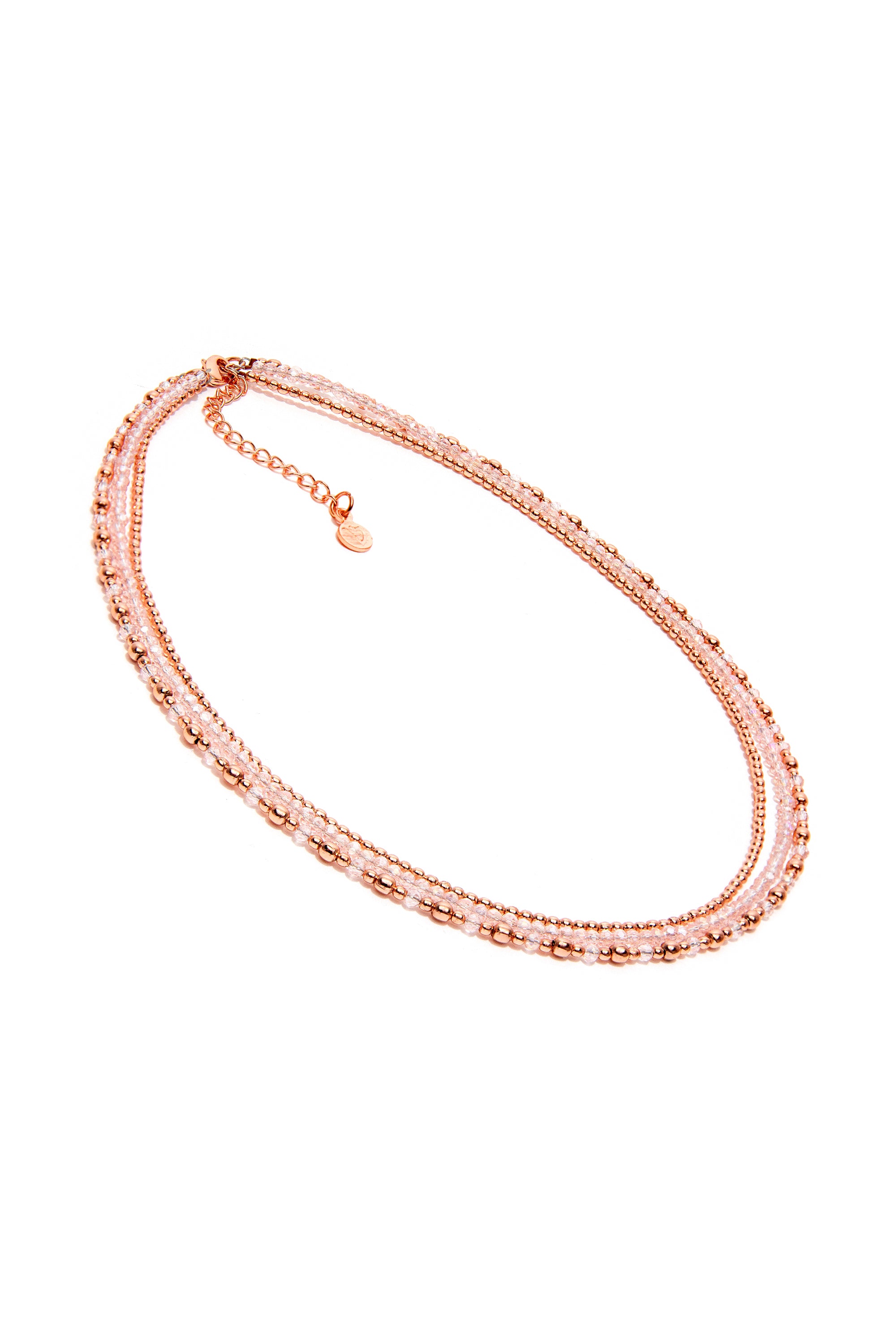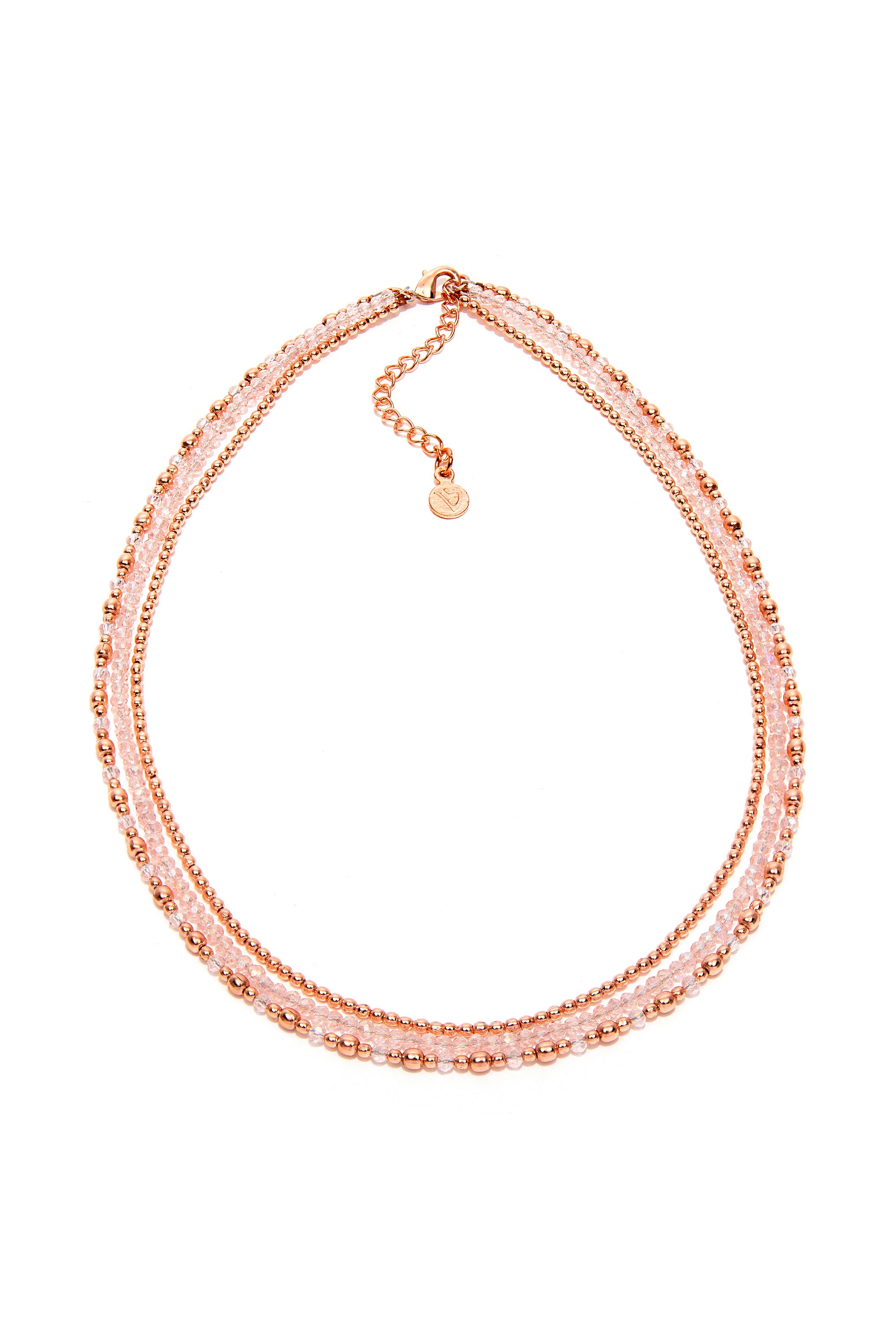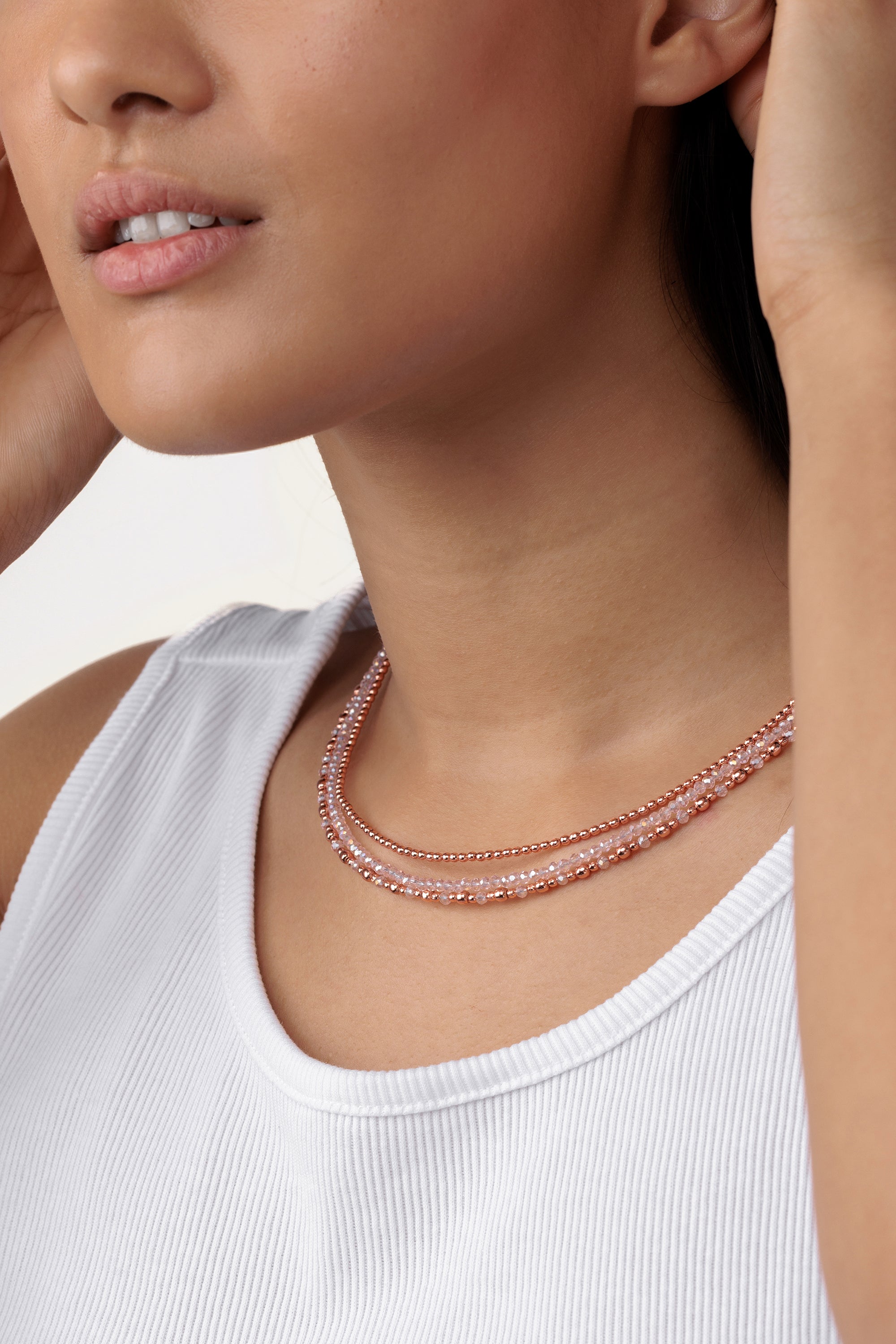 Collar multihilo chapado en cobre con alternancia de cristales de vidrio rosa empolvado y micro cuentas cobrizas. Un equilibrio luminoso y refinado que combina fácilmente con cualquier outfit. Cierre: mosquetón ajustable con cadena de extensión. Testado al níquel. Artesanal. Hecho a mano. Piezas únicas, perfectas para cualquier look o como idea de regalo.