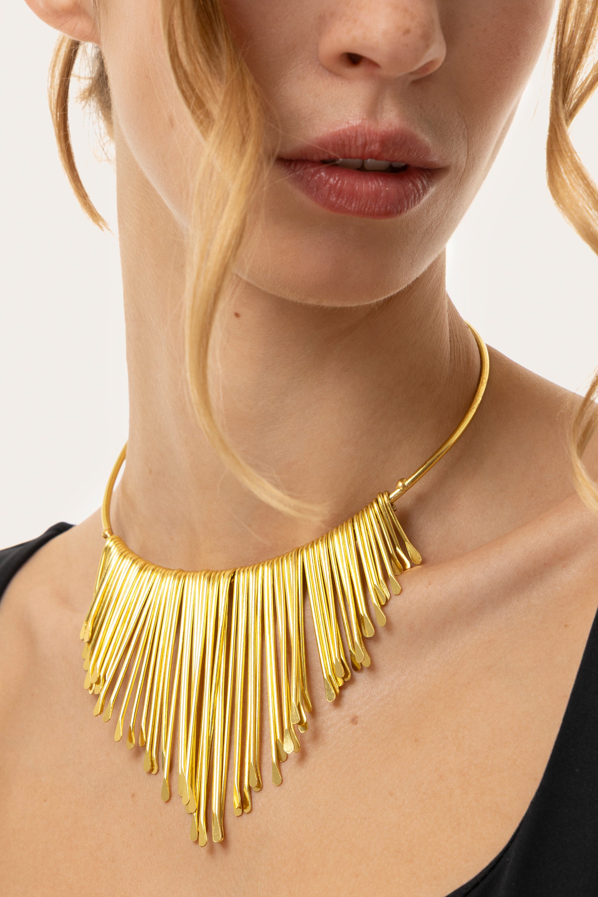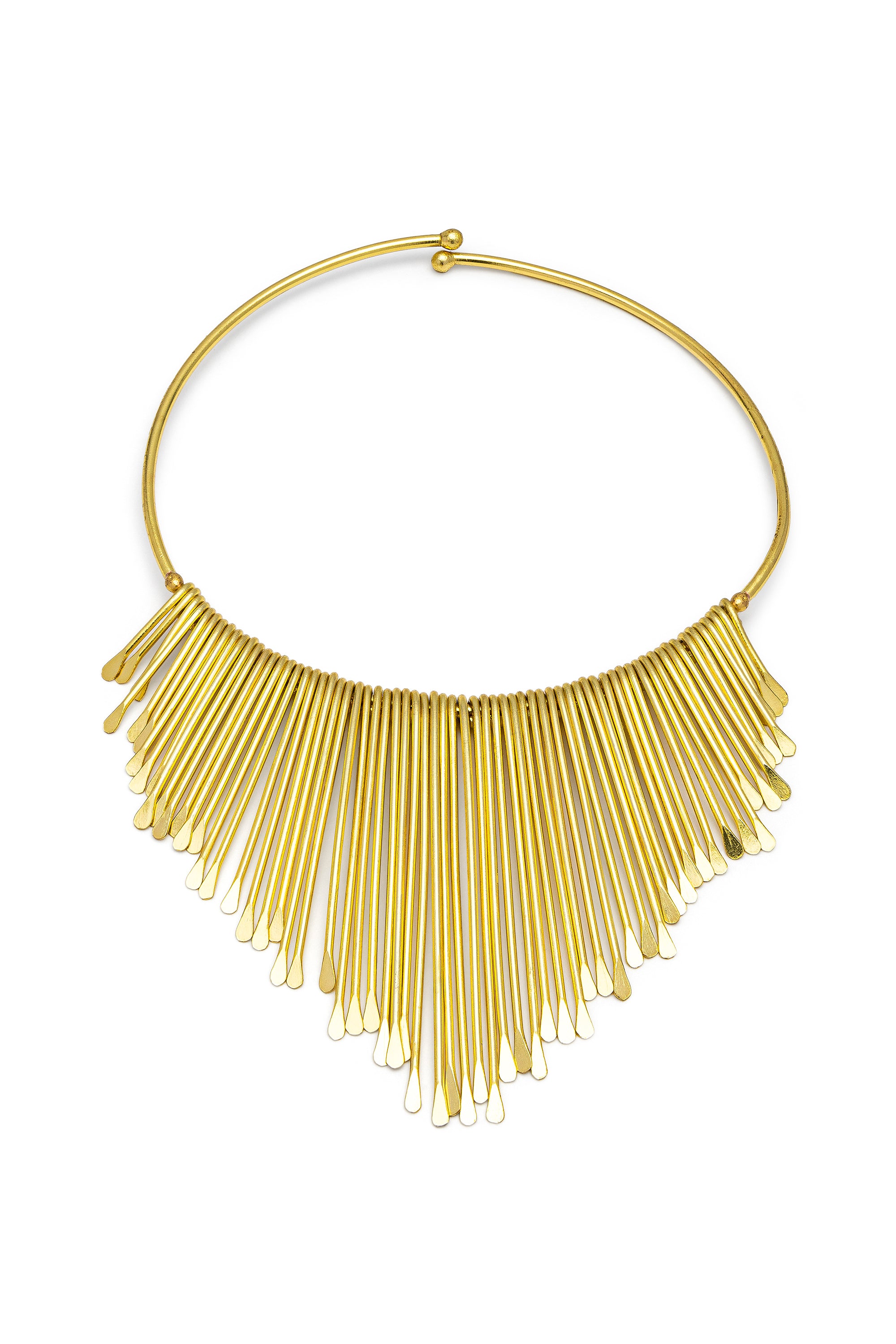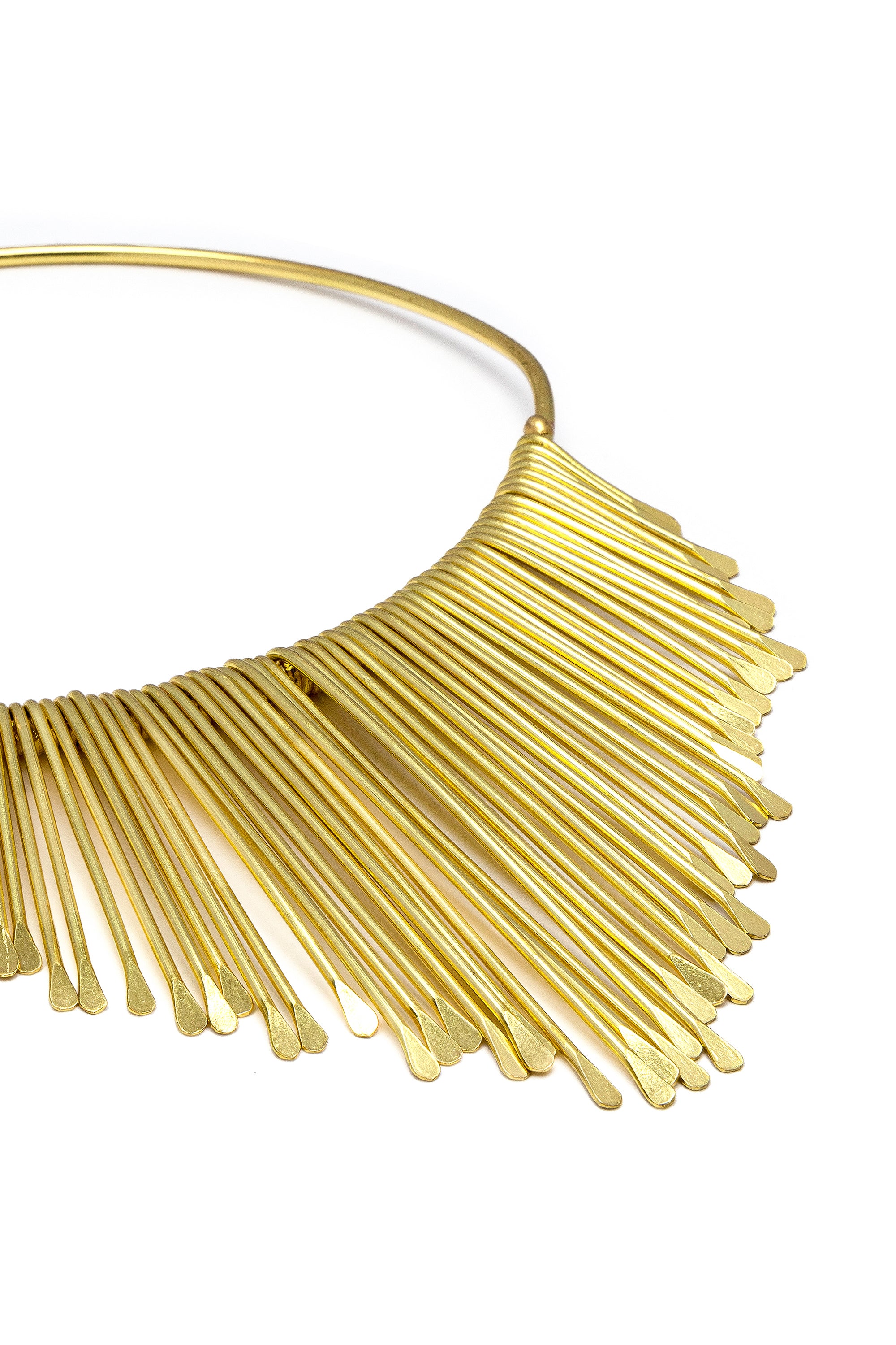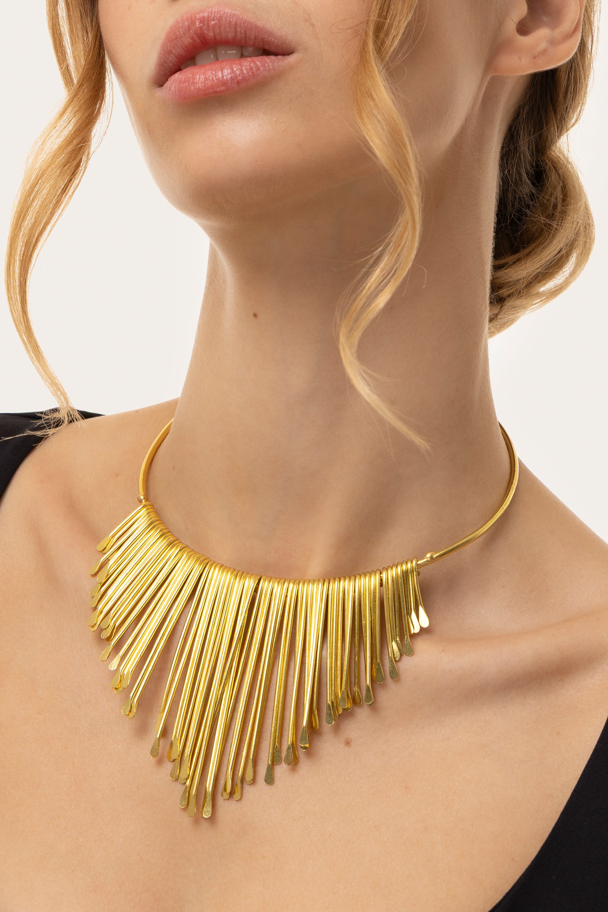 Gargantilla de latón reciclado con puntas estilizadas para un efecto enérgico y moderno. La cascada de elementos geométricos sigue un ritmo creciente que aporta carácter al look. Una verdadera declaración de estilo, única en su diseño e icónica en sus formas. Una joya audaz para quien ama destacar con personalidad. Nickel tested. Elaboración artesanal. Joyas hechas a mano, únicas y artesanales, perfectas para todos tus looks o como idea de regalo.