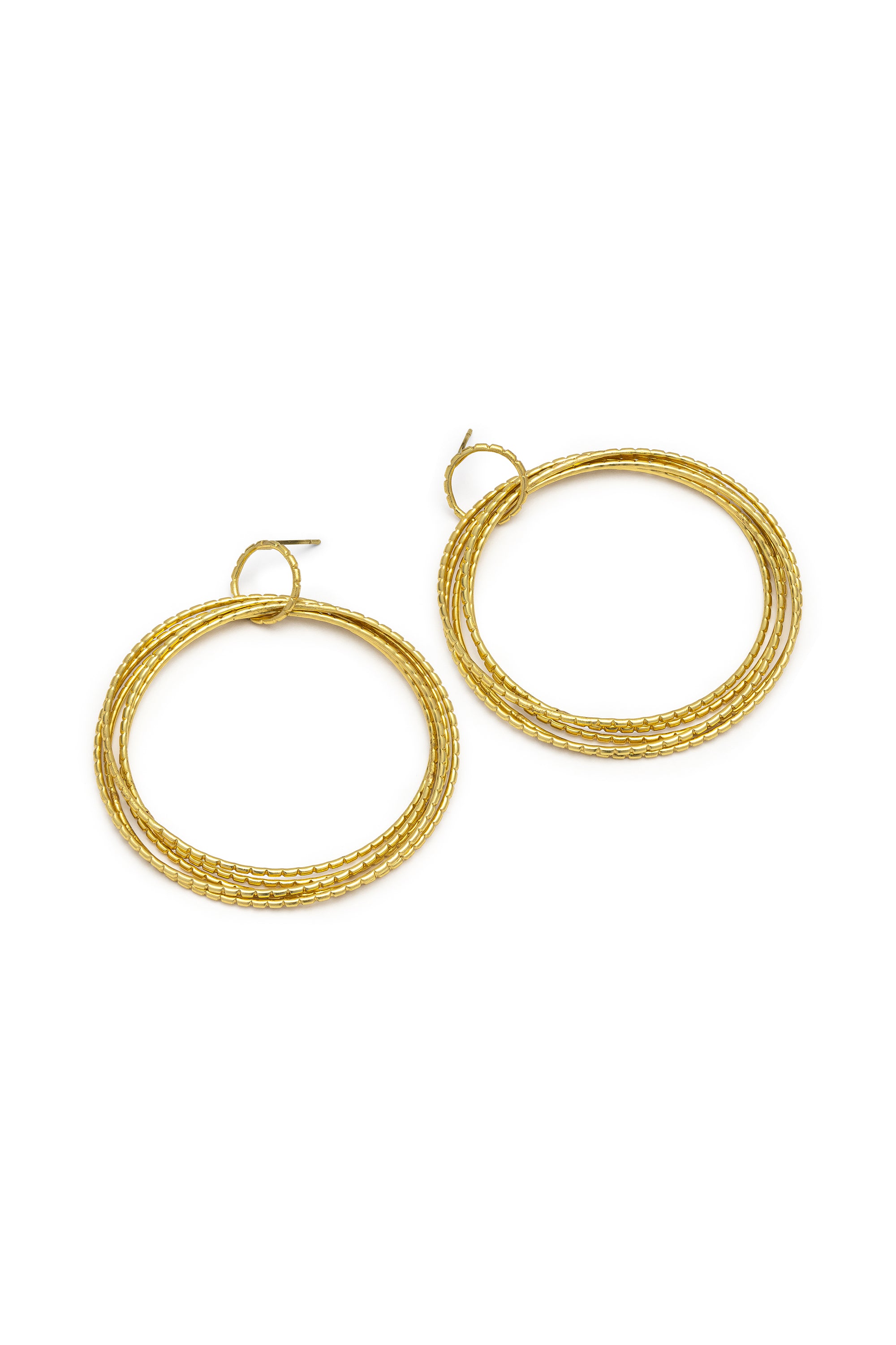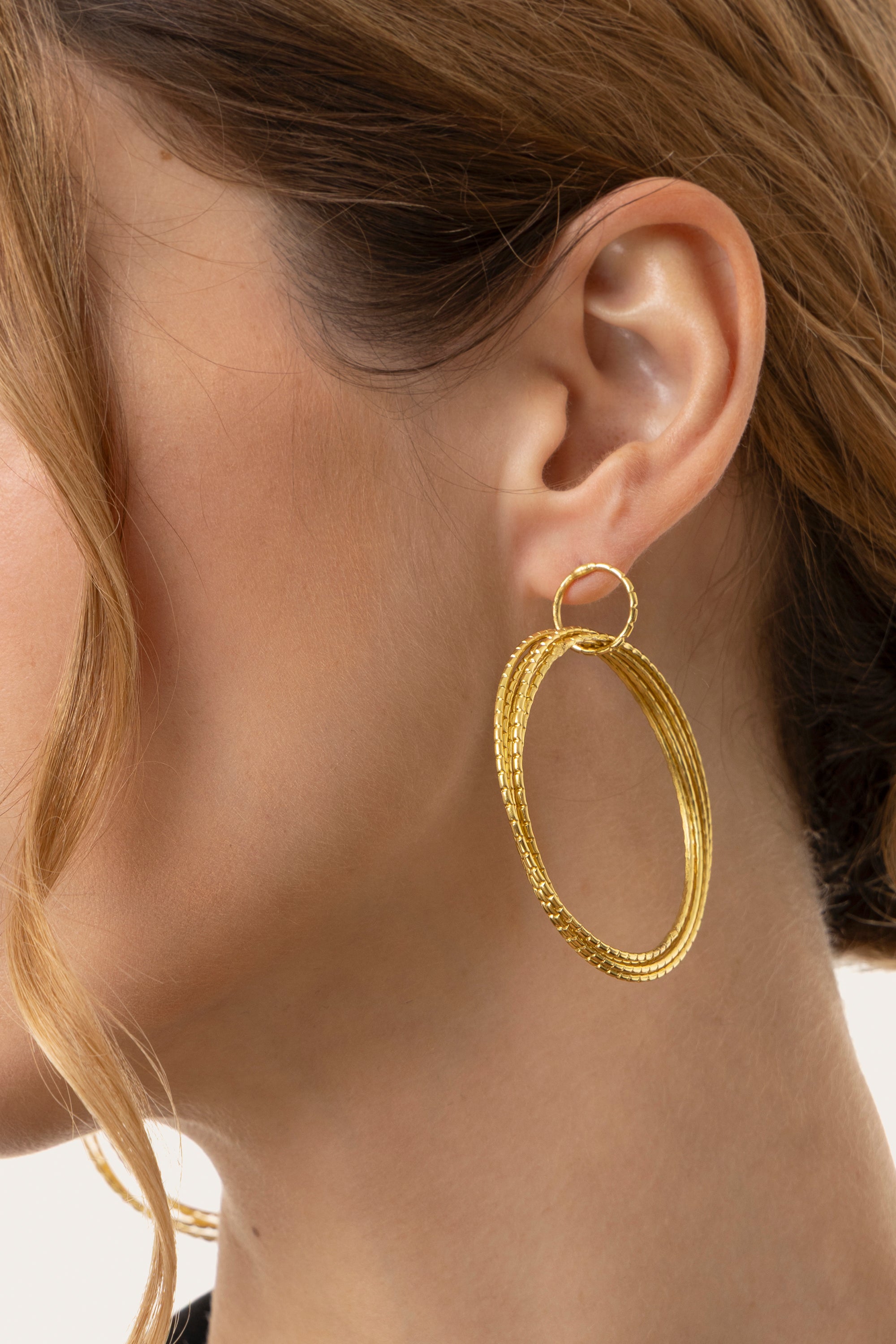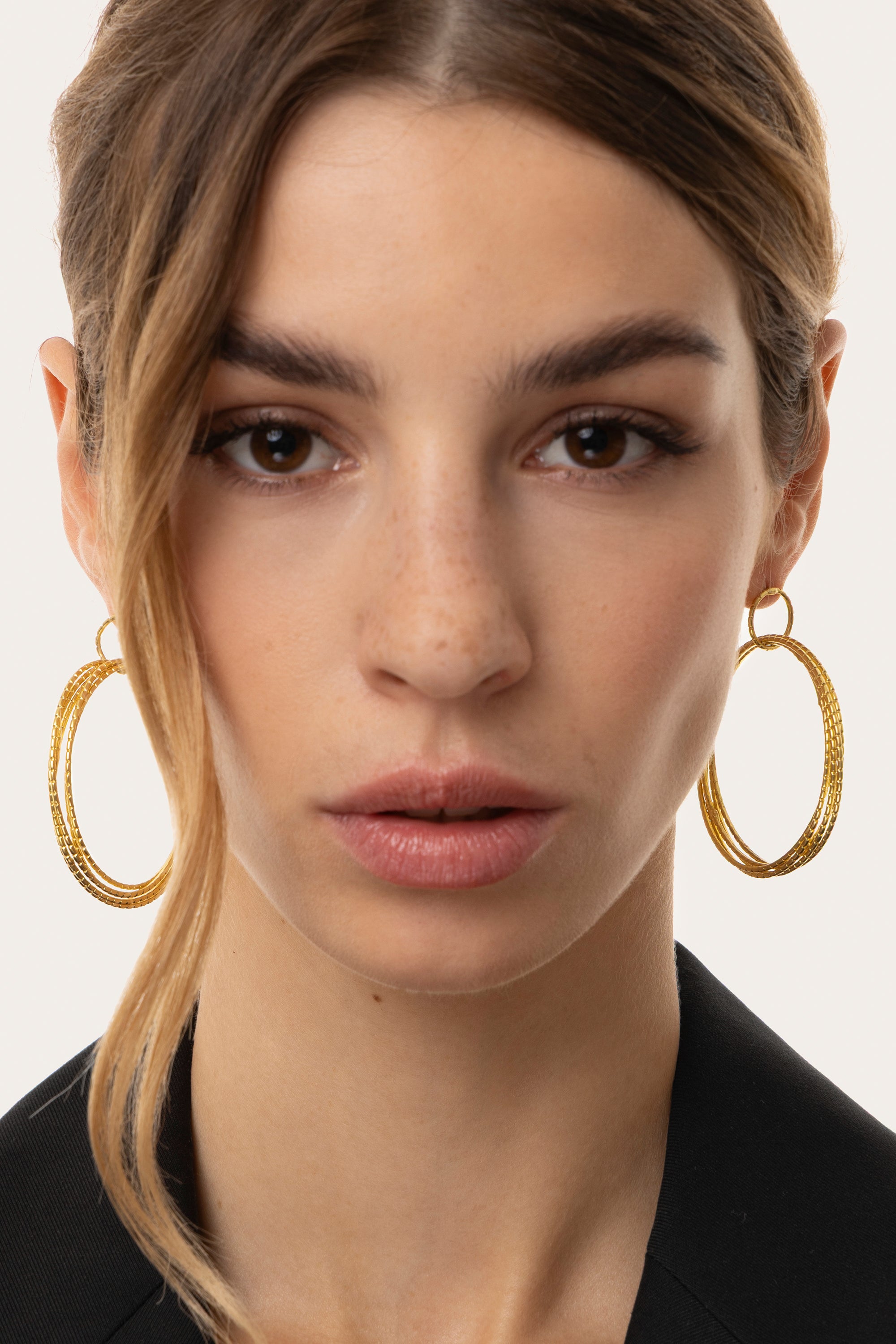 Clásicos, pero diferentes. Pendientes de aro oversize en latón reciclado con microtextura irregular, luminosos y ligeros. Perfectos para aportar personalidad a un look sencillo o completar un outfit de noche. Cierre de mariposa para un uso ligero y cómodo. Diámetro: 5 cm. Nickel tested. Elaboración artesanal. Joyas hechas a mano, únicas y artesanales, perfectas para todos tus looks o como idea de regalo.