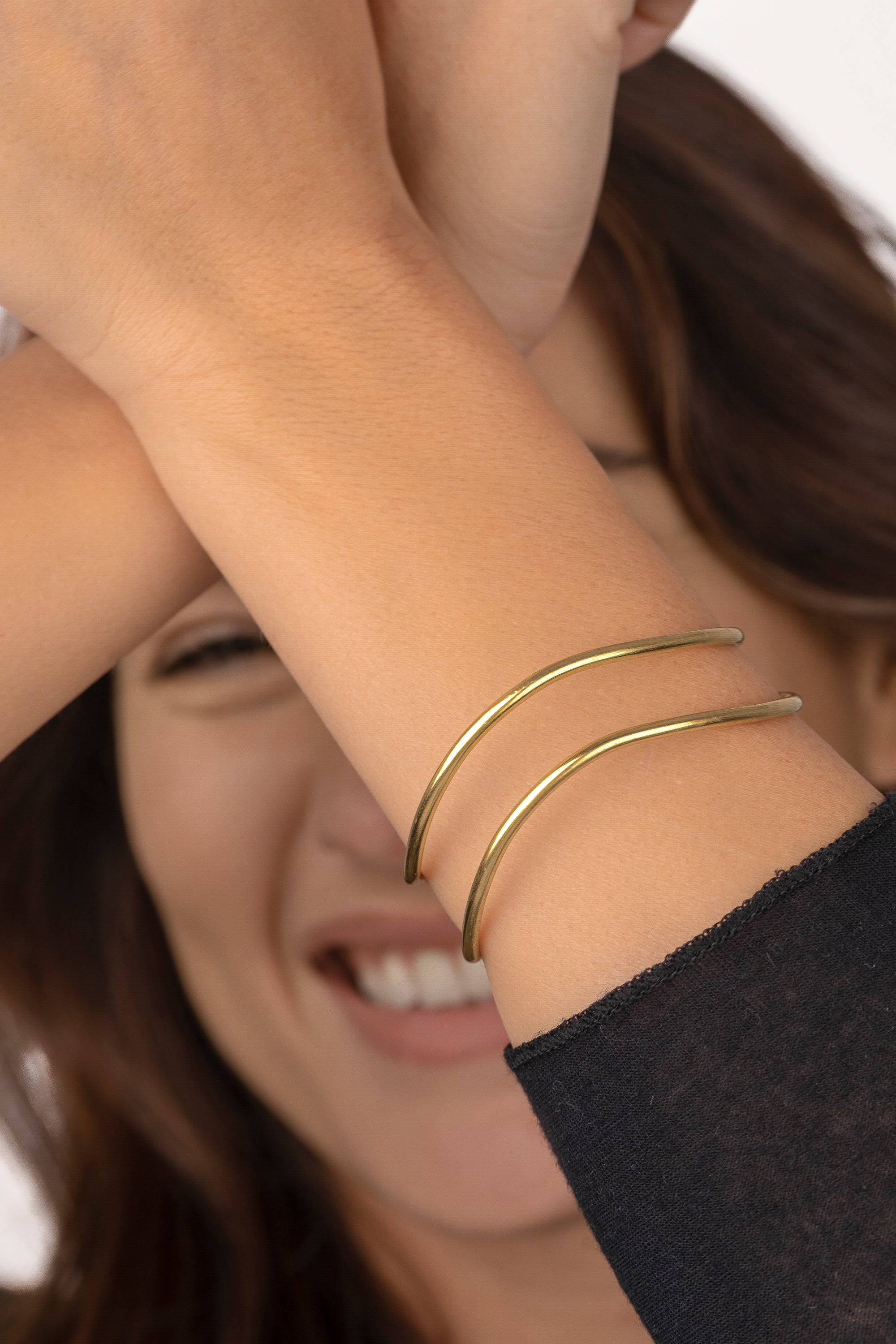 Brazalete cuff abierto y ajustable de dos hilos que fluyen en una suave onda; líneas esenciales, perfil slim y brillo sutil para una elegancia cotidiana. Realizado a mano en latón reciclado. Nickel tested. Elaboración artesanal. Joyas hechas a mano, únicas y artesanales, perfectas para todos tus looks o como idea de regalo.