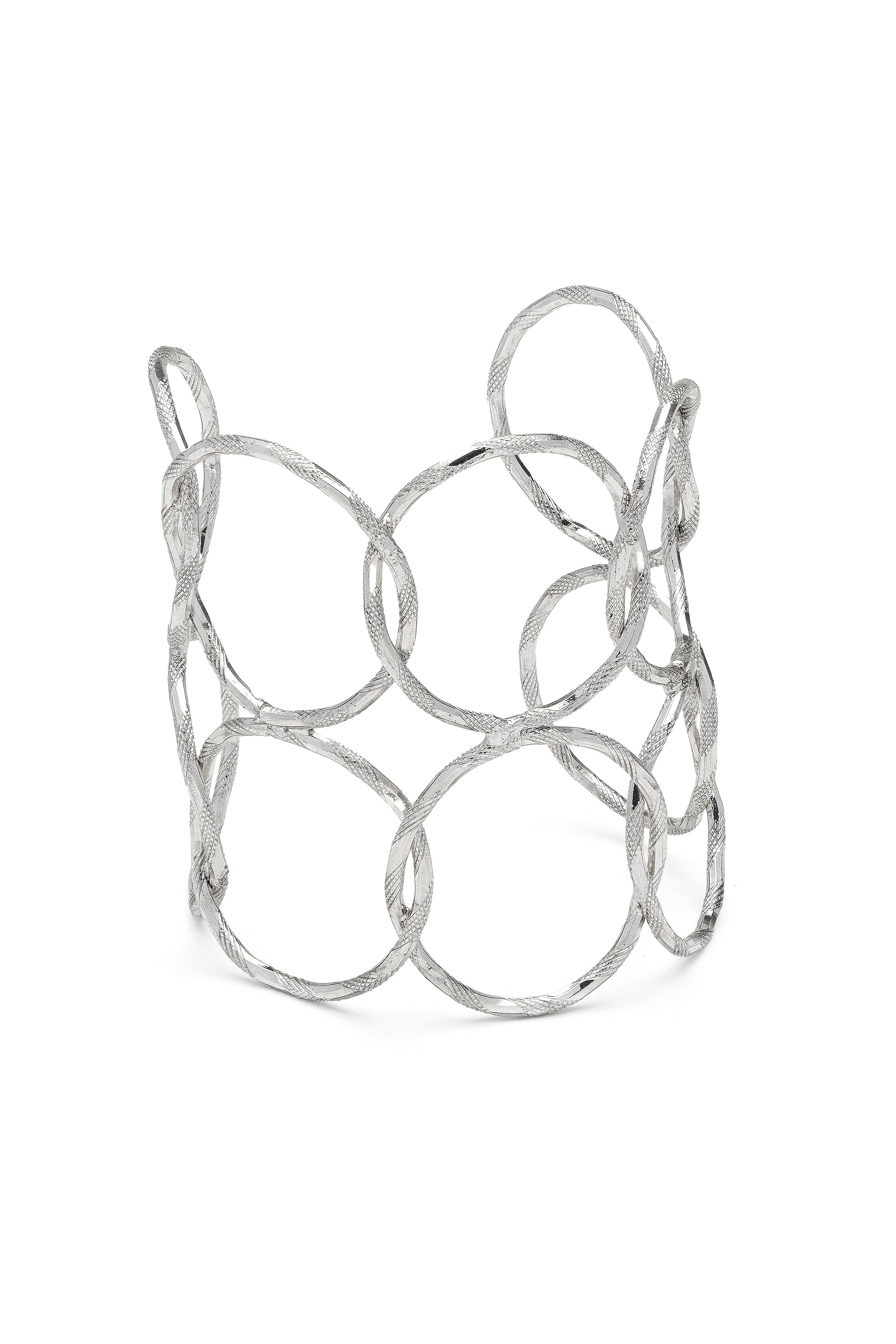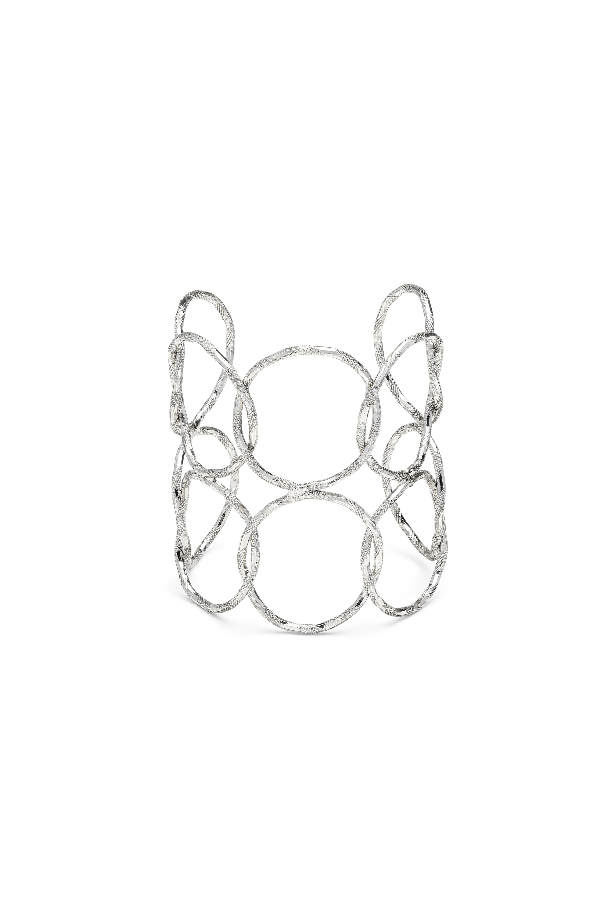 C?rculos entrelazados se suceden en esta pulsera semirr?gida, alternando vol?menes con l?neas vac?as. El acabado del trabajo realza la textura del metal, creando un accesorio con un car?cter decidido y contempor?neo. Longitud 7,5 cm. Chapado en plata. Nickel tested.