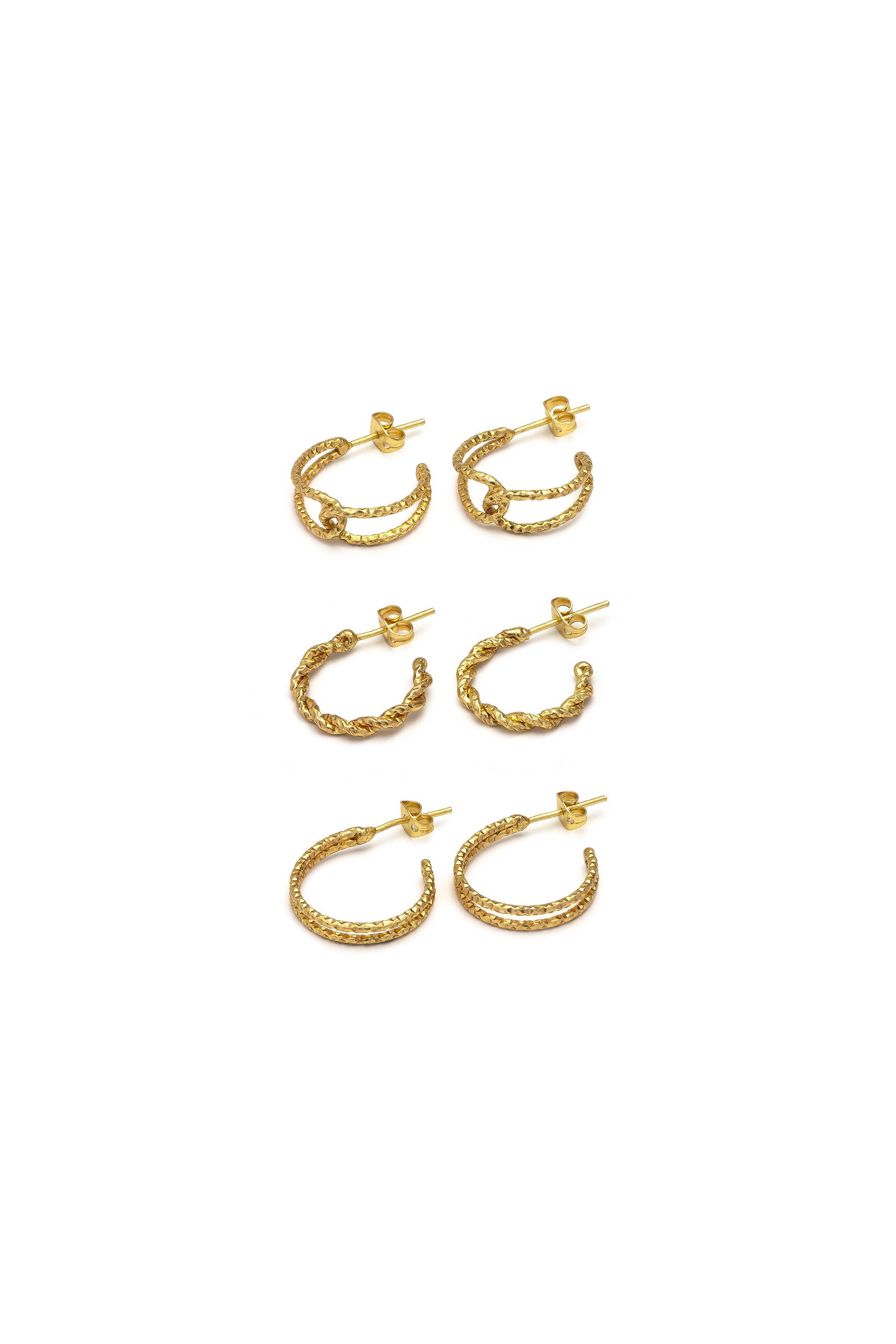 Un conjunto compuesto por tres pares de pendientes de aro en forma de C con diferentes acabados, pensados para llevarse juntos, por separado o mezclados. La alternancia entre superficies lisas y entrelazadas permite crear combinaciones personalizadas siempre nuevas. Vers?til y f?cil de combinar con cualquier joya de la colecci?n, este conjunto es ideal para combinar con el ?Collar Circulos Entrelazados?. Di?metro 2 cm. Cierre de pasador con mariposa. Hecho a mano. Nickel tested.