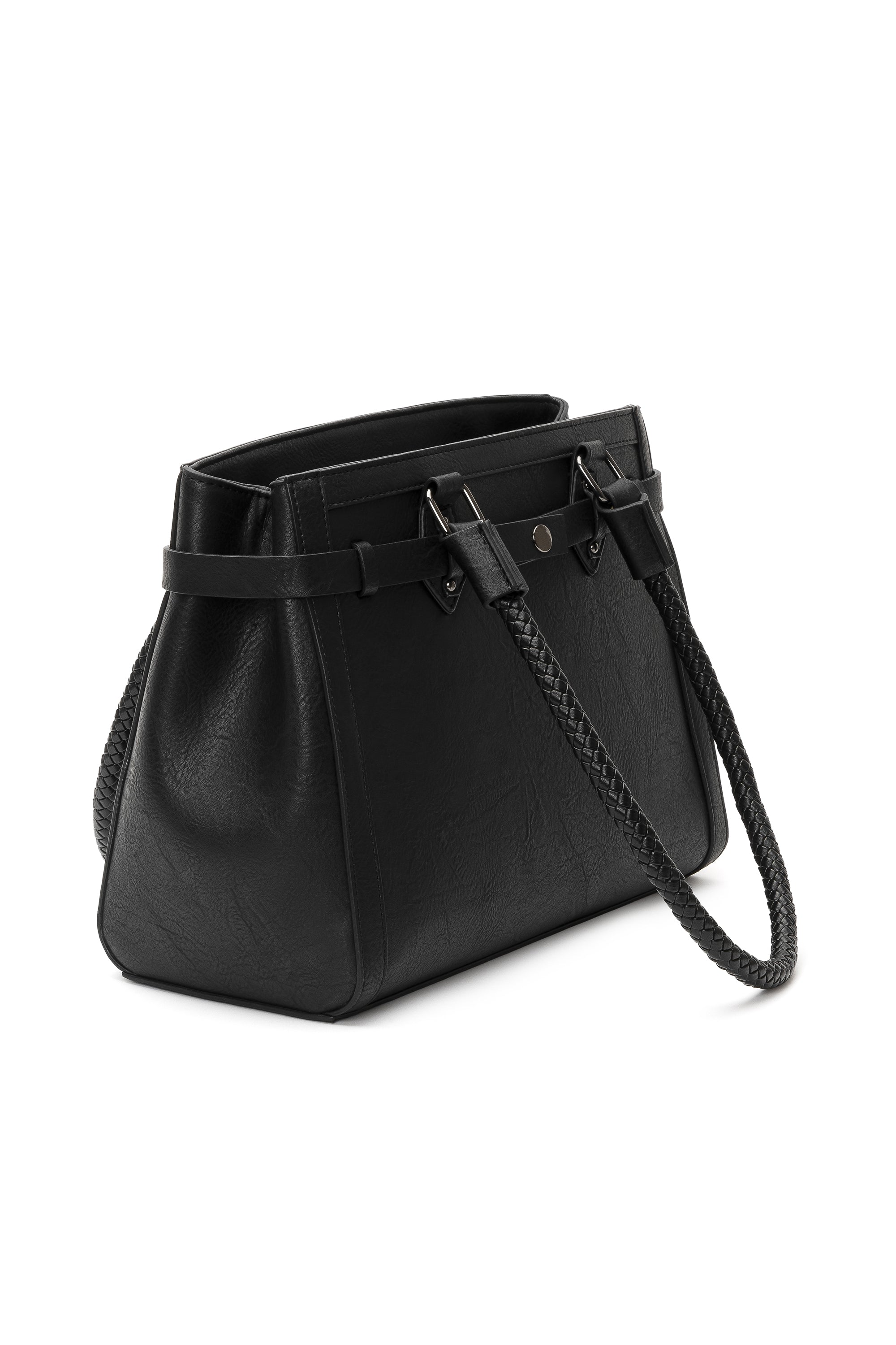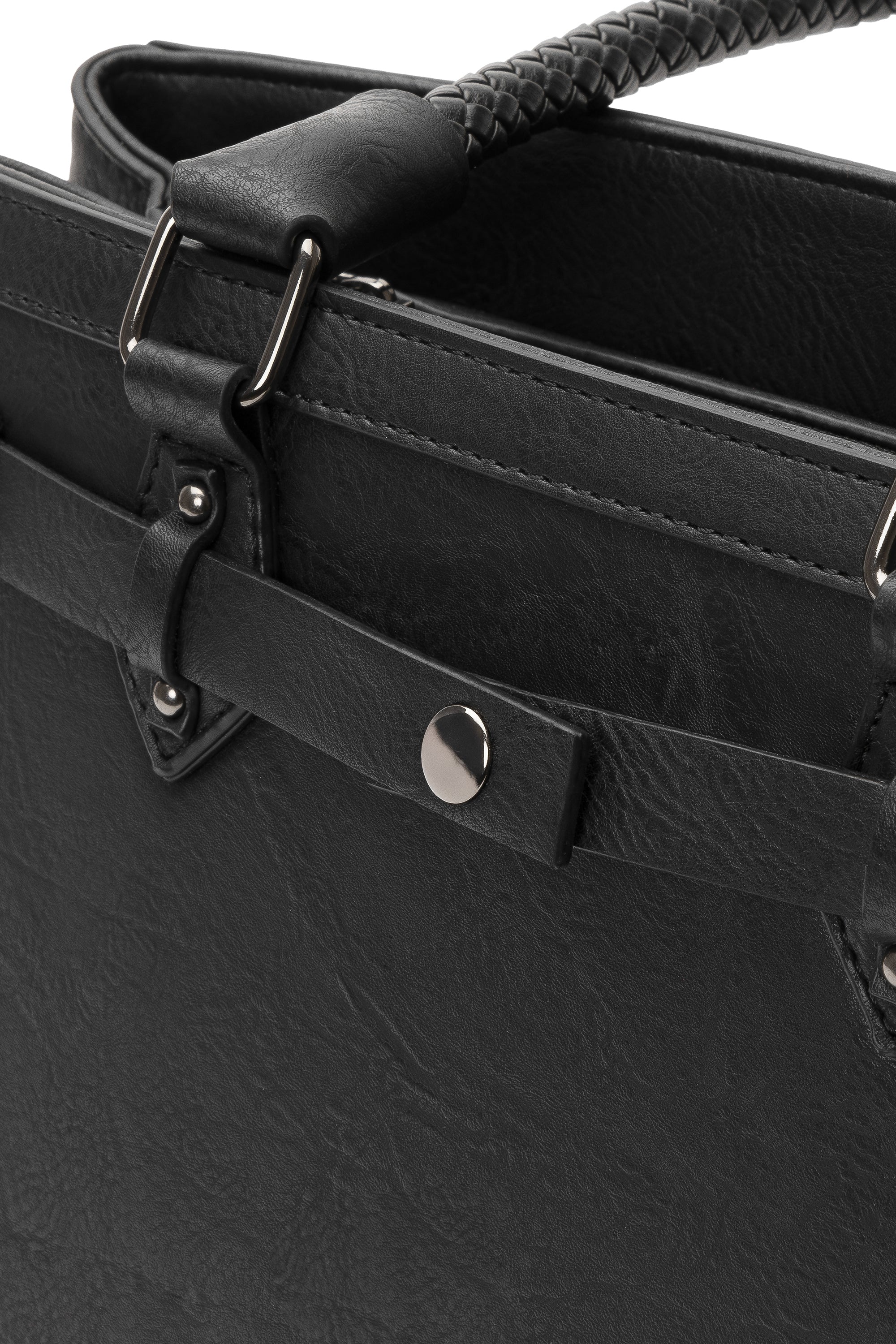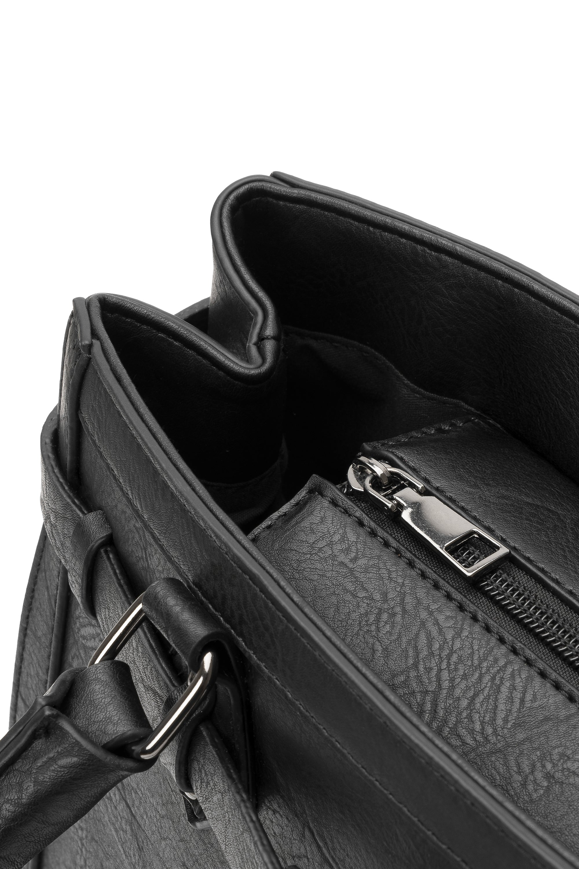Borsa Tote Bag nera. Il giusto compromesso tra bauletto elegante e borsa weekend, perfetta per i look da ufficio. Materiale corpo e manico: 100% poliuretano. Fodera 100% poliestere. Tasca interna: 1 zip e 1 aperta. Chiusura concerniera. Misure: 30 (B) x 23 (A) x 14 (P) cm. Misura manici: 57 cm.