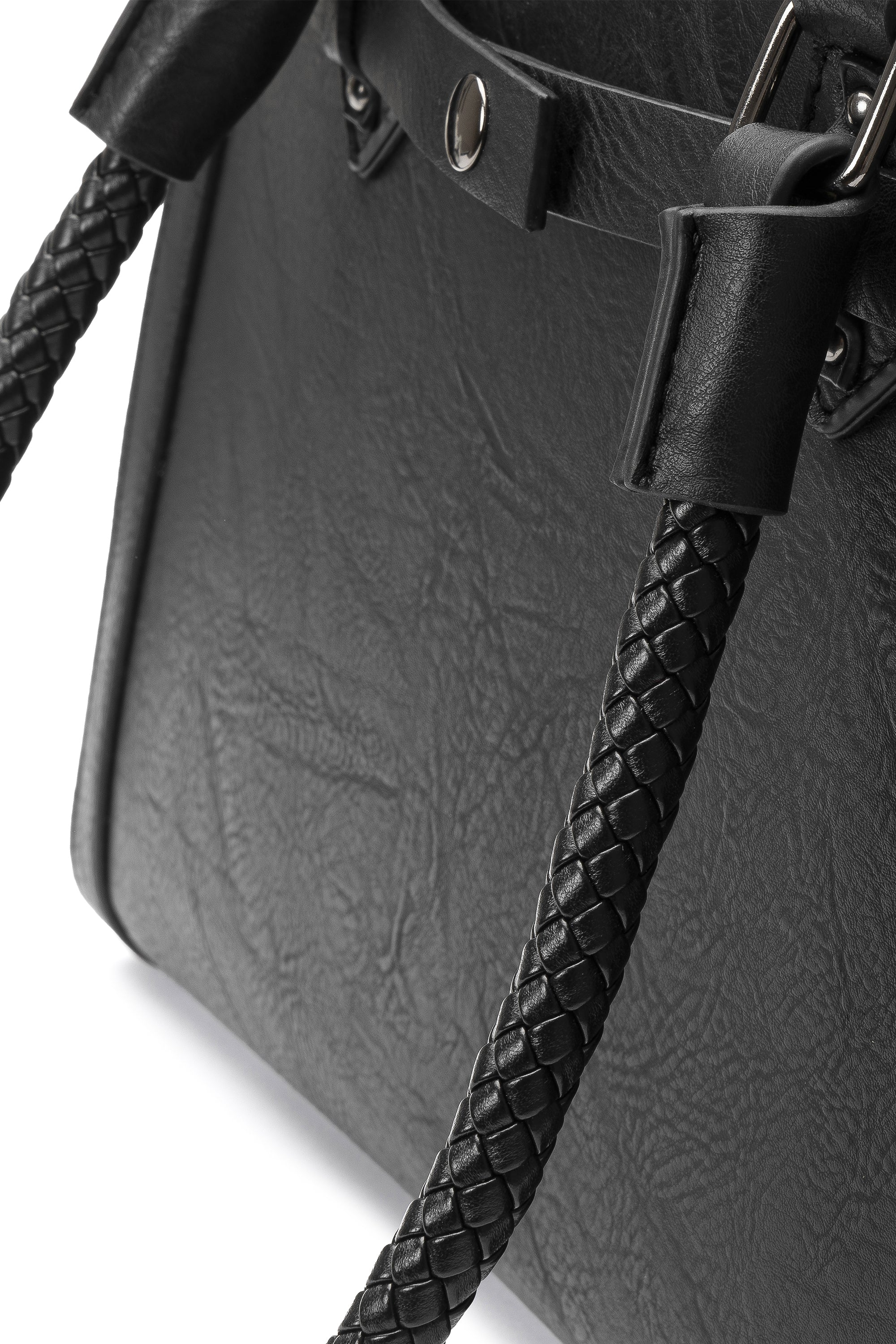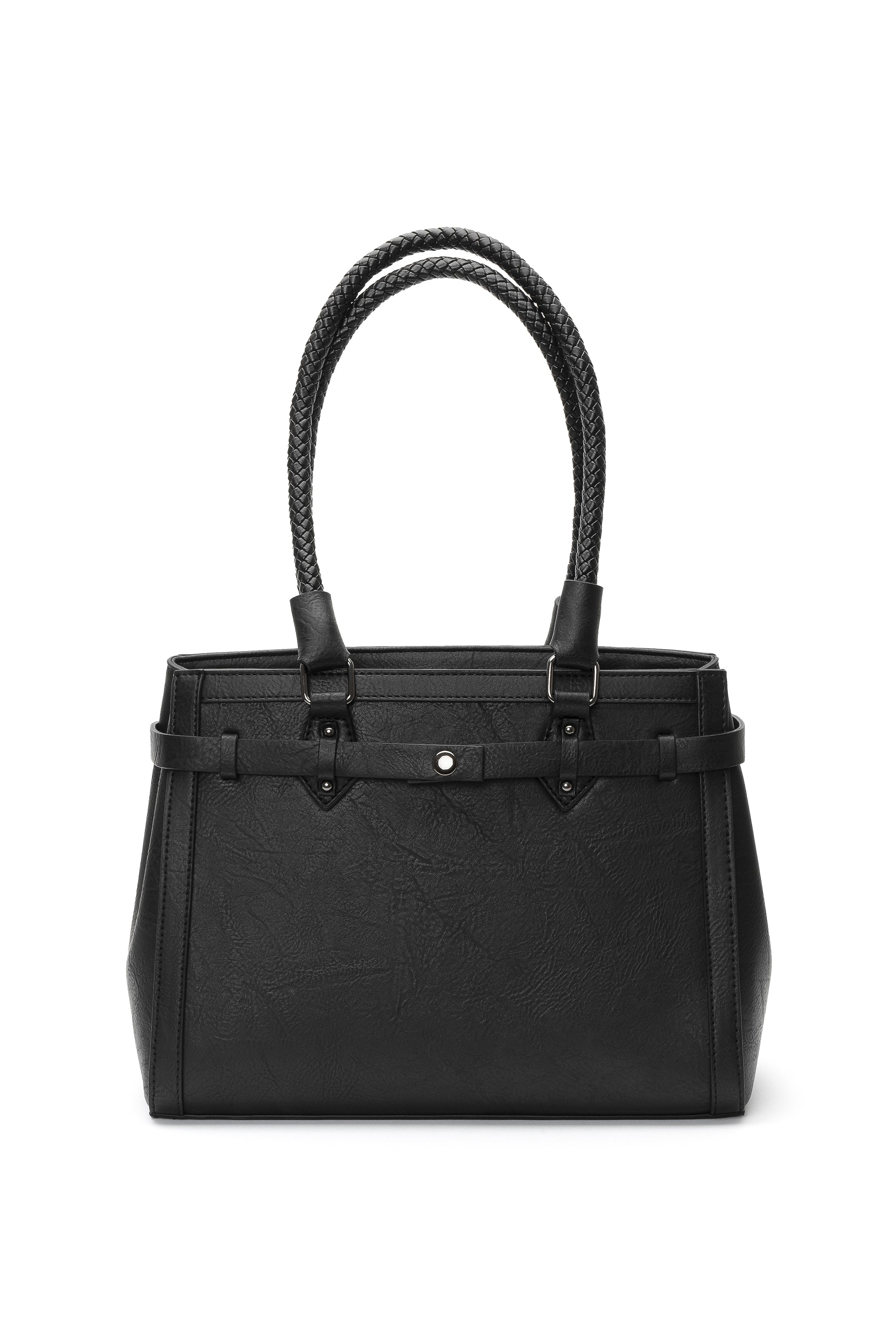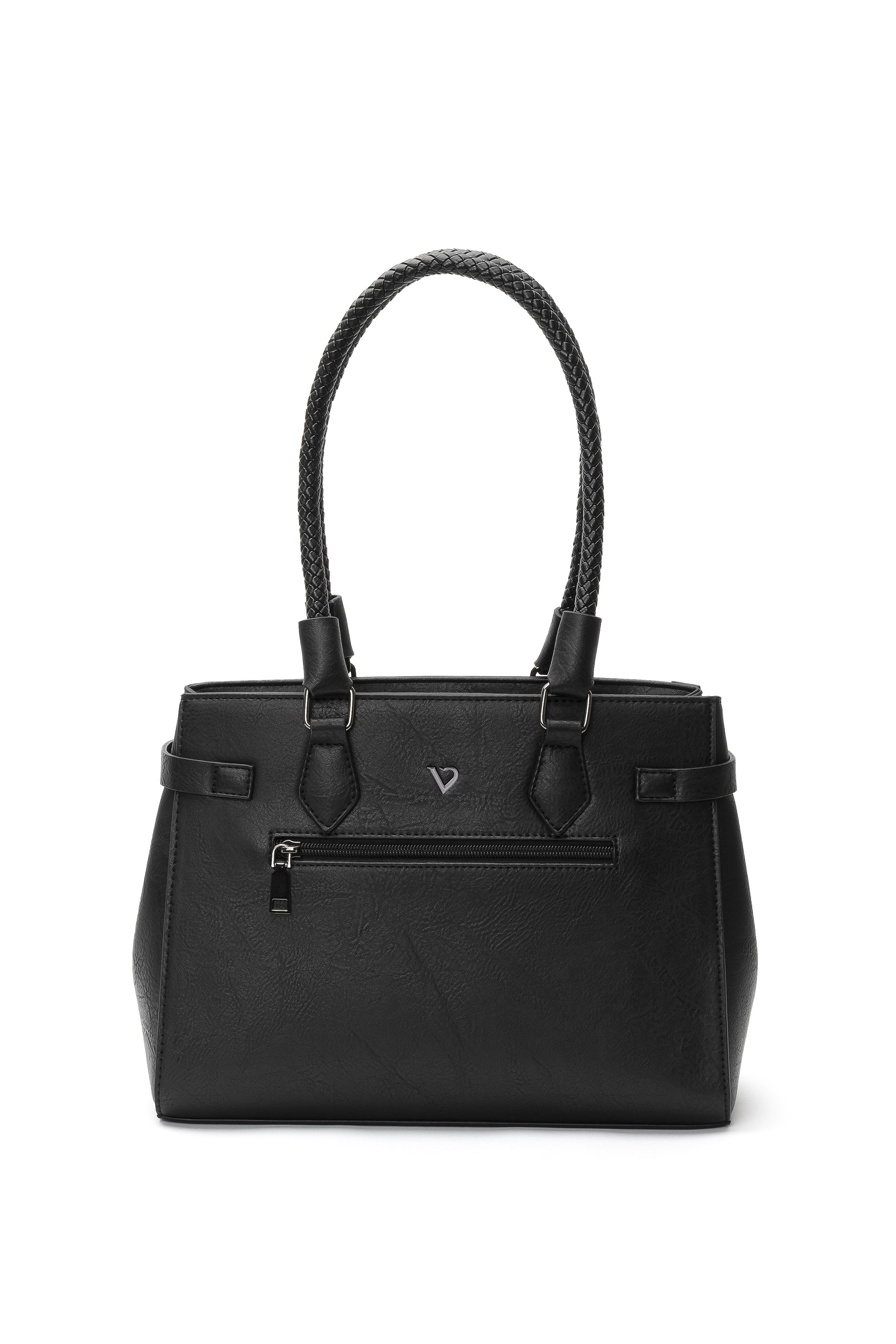 Borsa Tote Bag nera. Il giusto compromesso tra bauletto elegante e borsa weekend, perfetta per i look da ufficio. Materiale corpo e manico: 100% poliuretano. Fodera 100% poliestere. Tasca interna: 1 zip e 1 aperta. Chiusura concerniera. Misure: 30 (B) x 23 (A) x 14 (P) cm. Misura manici: 57 cm.