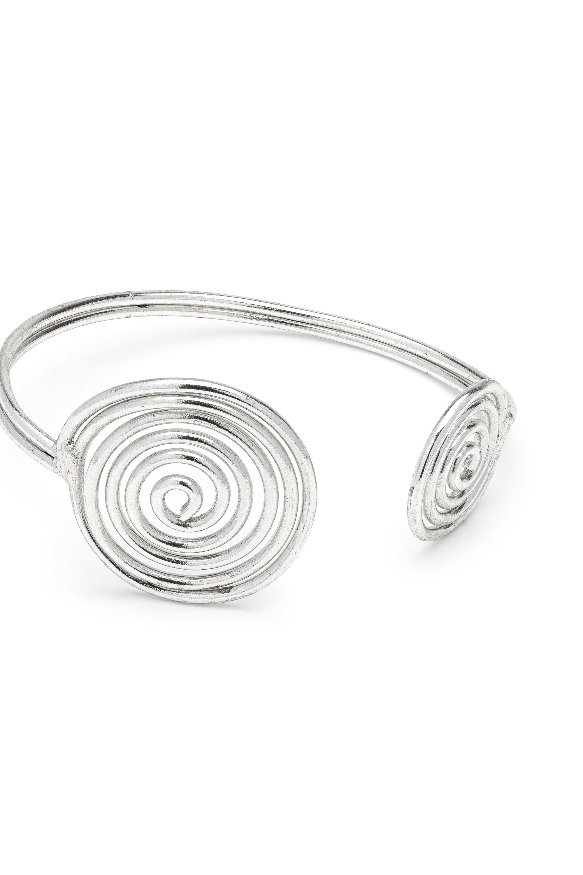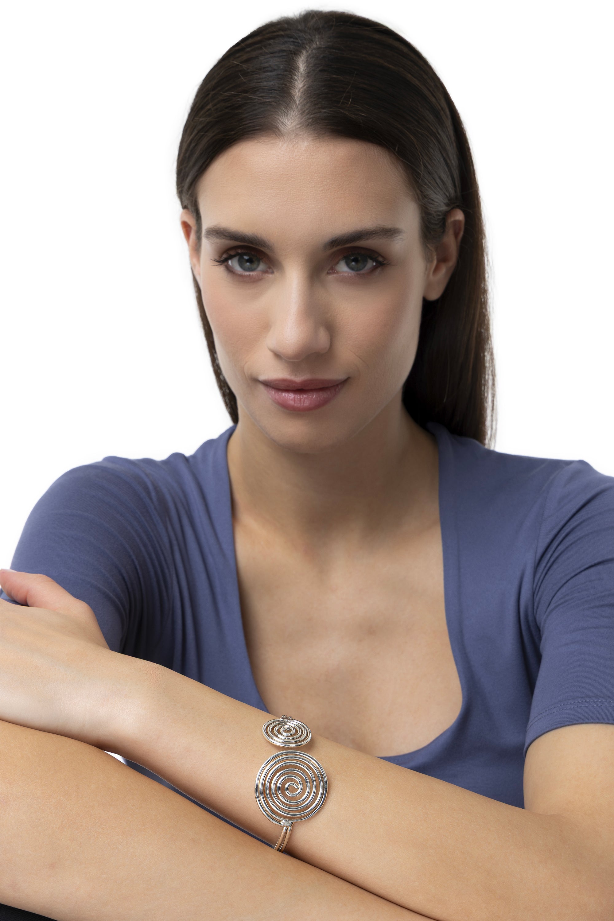 Due spirali di diverse dimensioni si incontrano alle estremit? di questo bracciale semi rigido aperto. La lavorazione del metallo esalta i volumi scultorei, creando un gioiello iconico e versatile. Ideale in abbinamento all'"Anello Design Onda". Placcatura argento. Nickel tested.