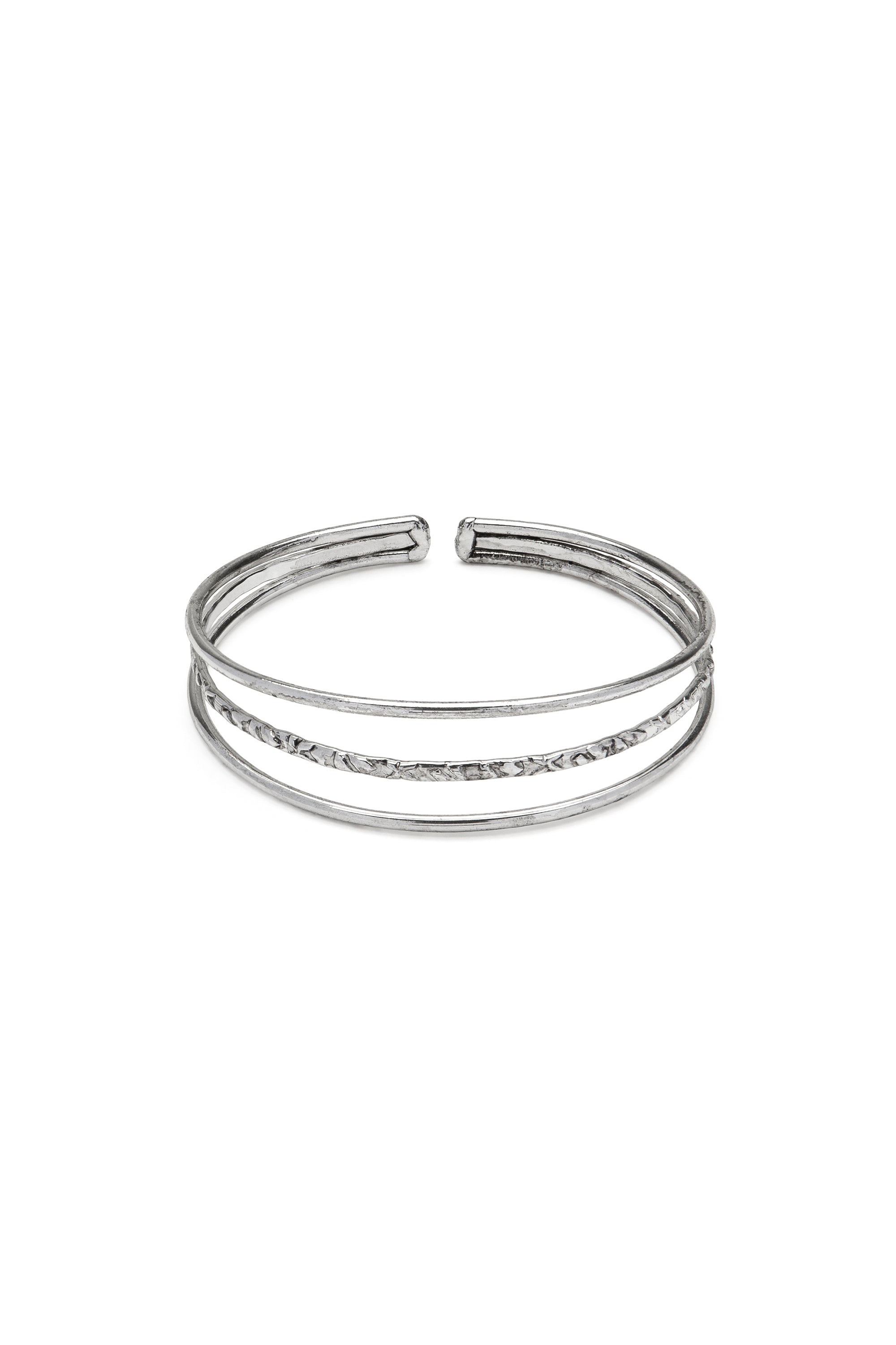 Bracciale aperto modello bangle con tre linee. Modello regolabile. Crea il tuo mix di bracciali elastici abbinando modelli diversi, leggeri e comodi da indossare. Placcato in argento. Nickel tested. Gioielli fatti a mano, unici e artigianali, perfetti per tutti i tuoi look o come idea regalo.