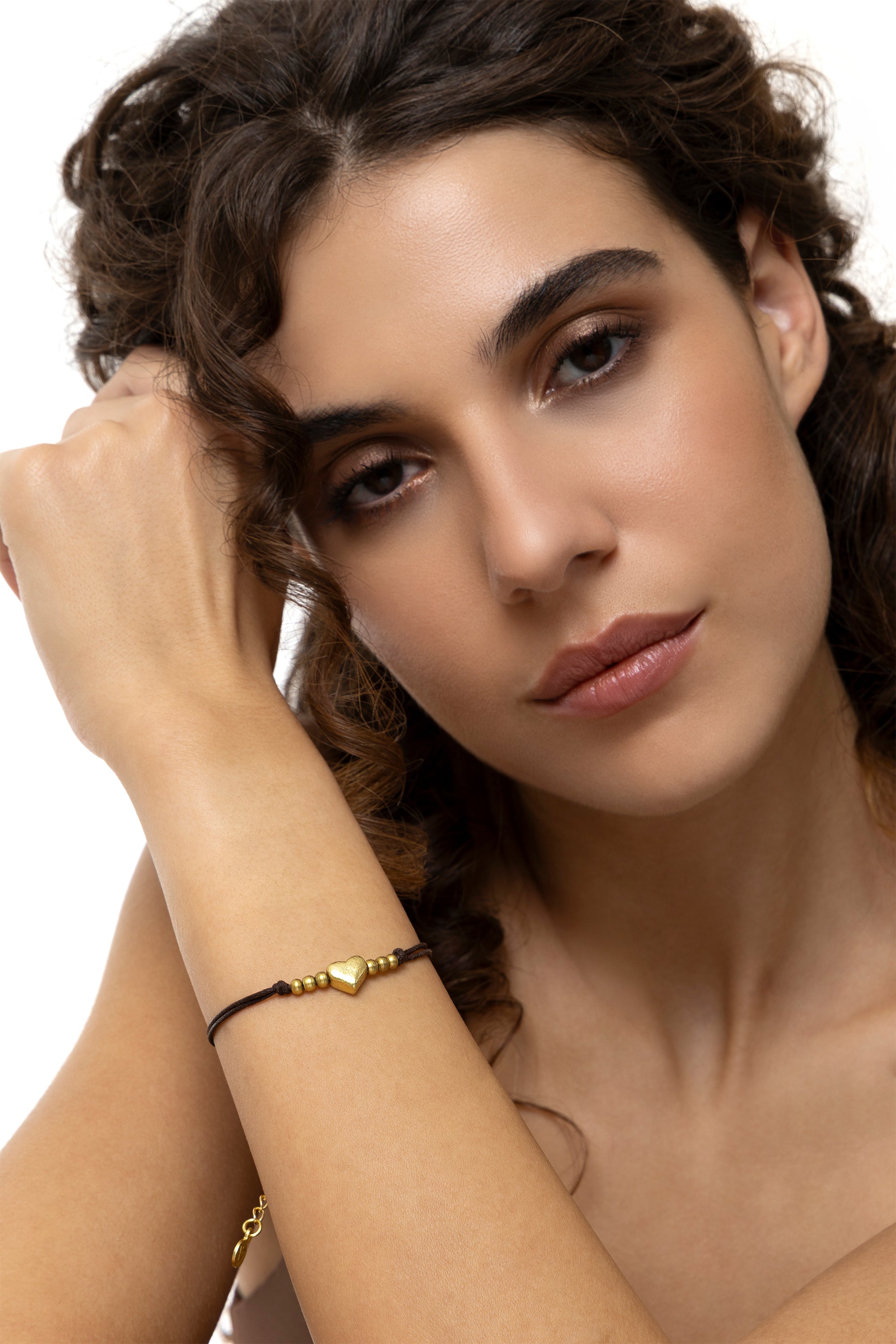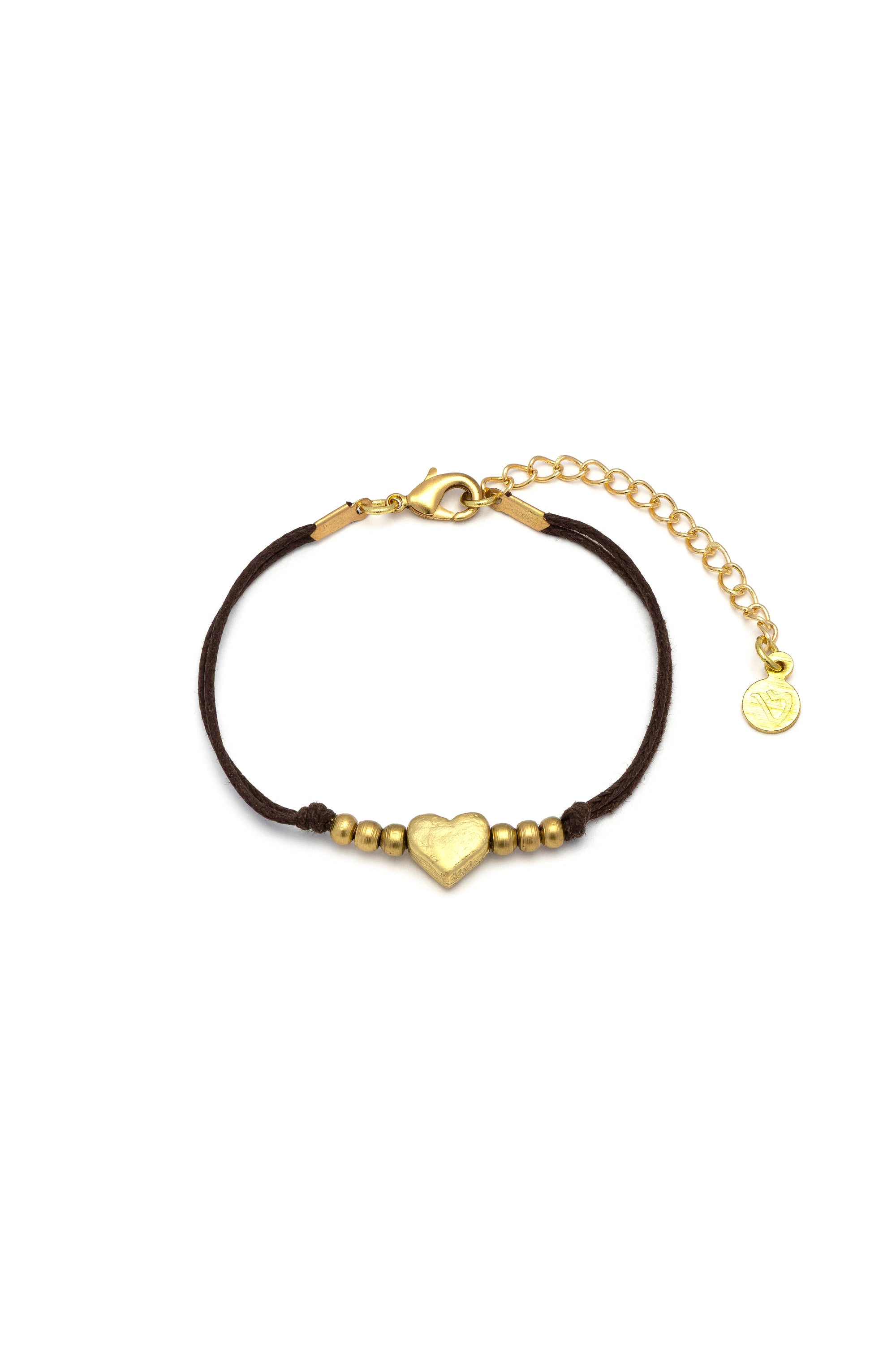 Un doppio cordino morbido che sostiene un piccolo cuore centrale dalla superficie grezza e tre micro sfere in ottone per lato. Un design leggero che gioca con il contrasto tra materiali diversi, celebrando l'unicit? dell'imperfezione artigianale. Perfetto come idea regalo. Modello regolabile. Ottone riciclato. Handmade. Nickel tested.