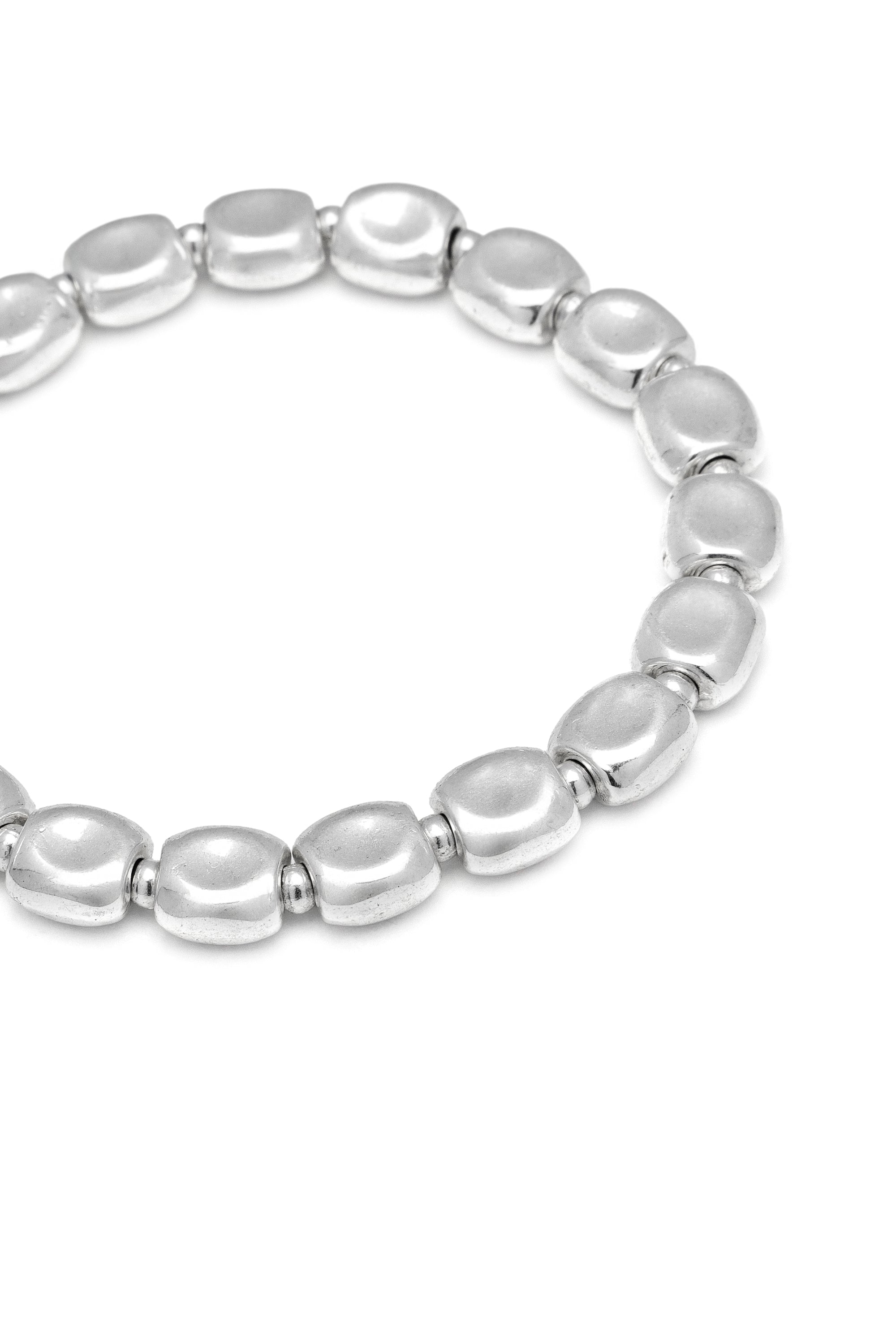 Linee morbide e volumi pieni definiscono questo bracciale elastico composto da ventidue elementi rettangolari stondati. La superficie specchiata lo rende un accessorio versatile e luminoso, perfetto come base per il tuo stack di bracciali quotidiano. Placcatura argento. Nickel tested.