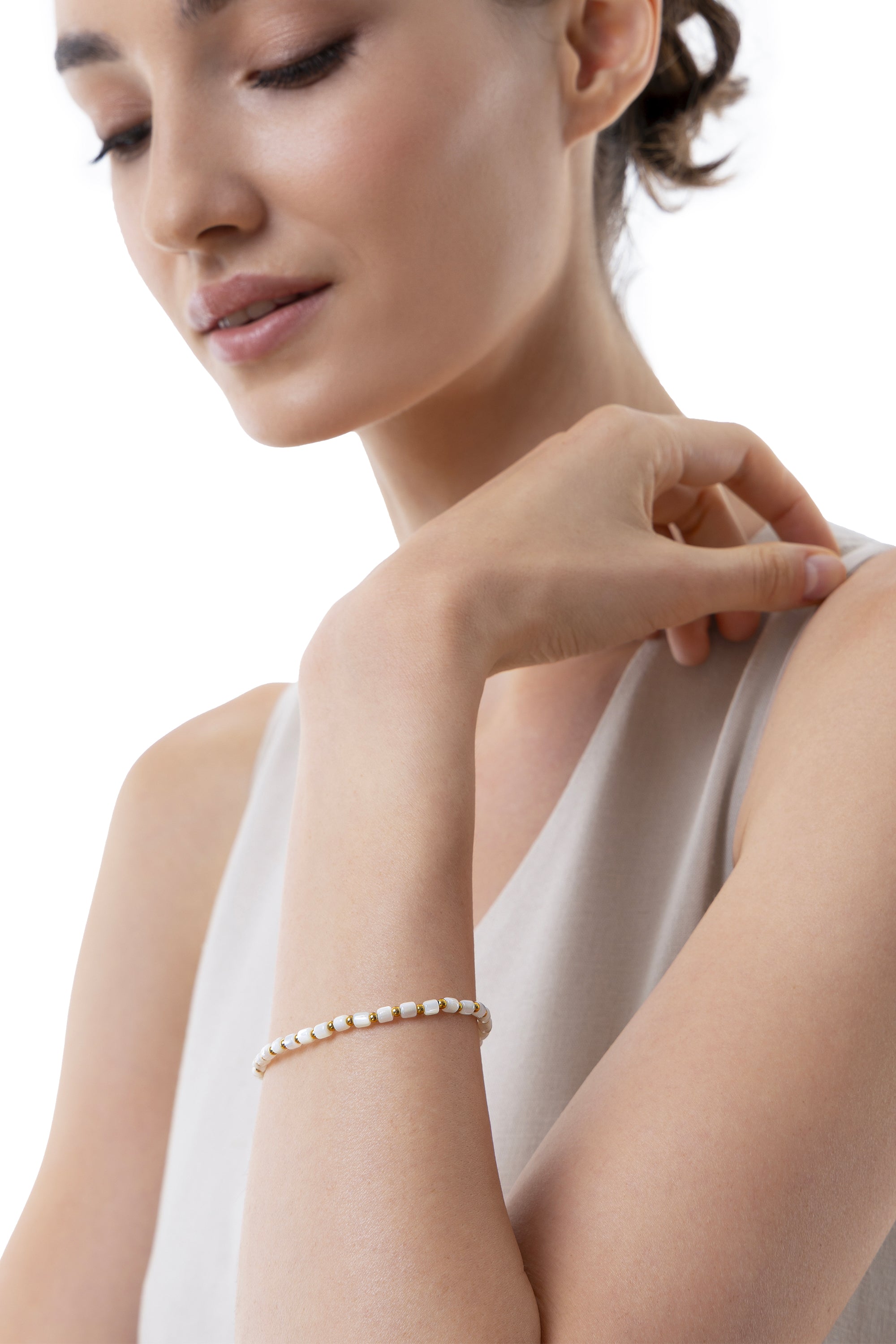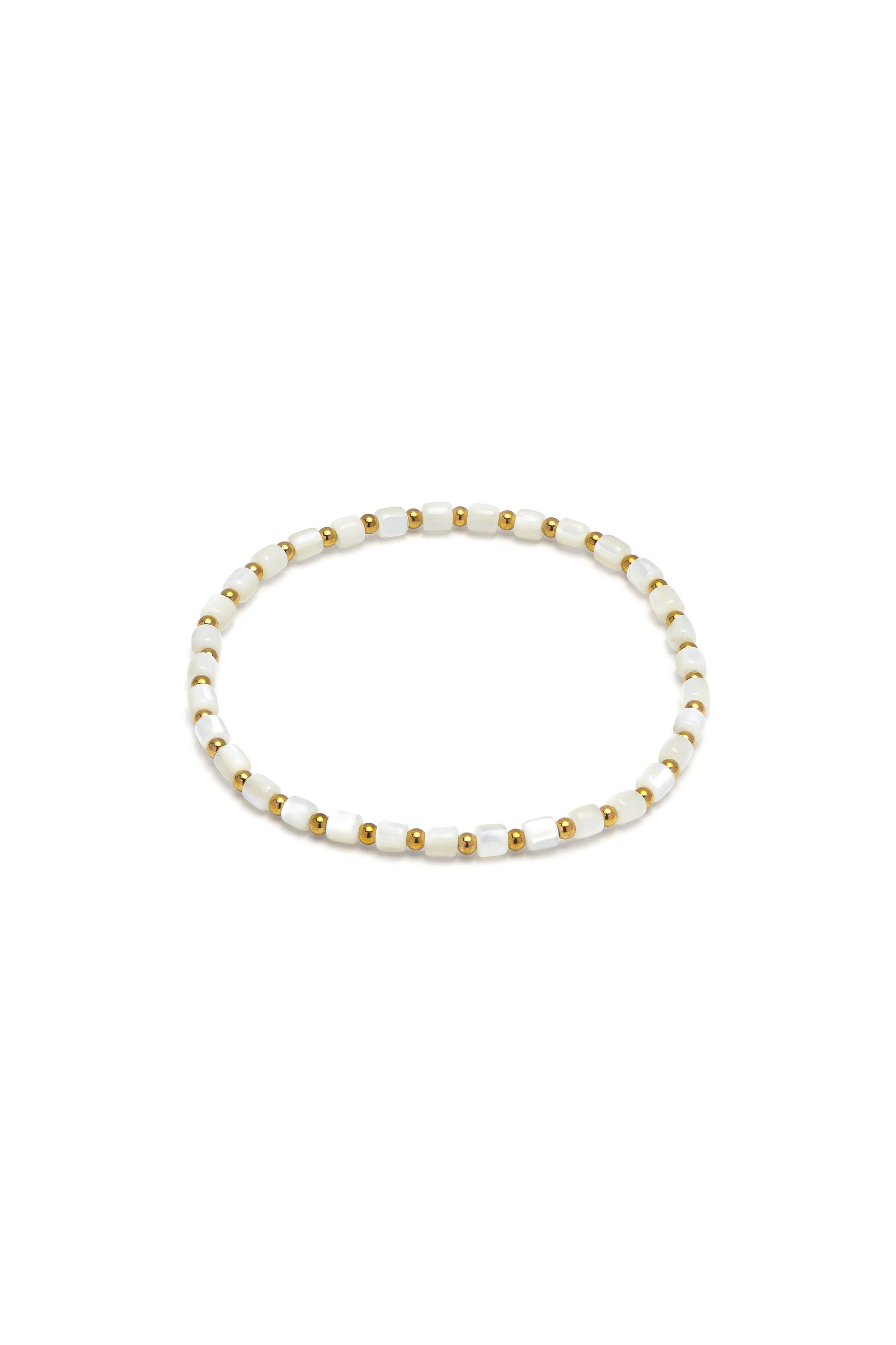 Bracciale elastico che gioca con forme geometriche e superfici lucide. Gli elementi cilindrici in madreperla, dalle inconfondibili tonalità milky, si alternano a micro sfere dorate in acciaio, garantendo un'armonia perfetta. Uno stile chic e moderno, ideale abbinato alla "Collana Cilindri Sfere", in ogni momento della giornata. Materiali: madreperla e elementi in acciaio placcato oro. Nickel tested.