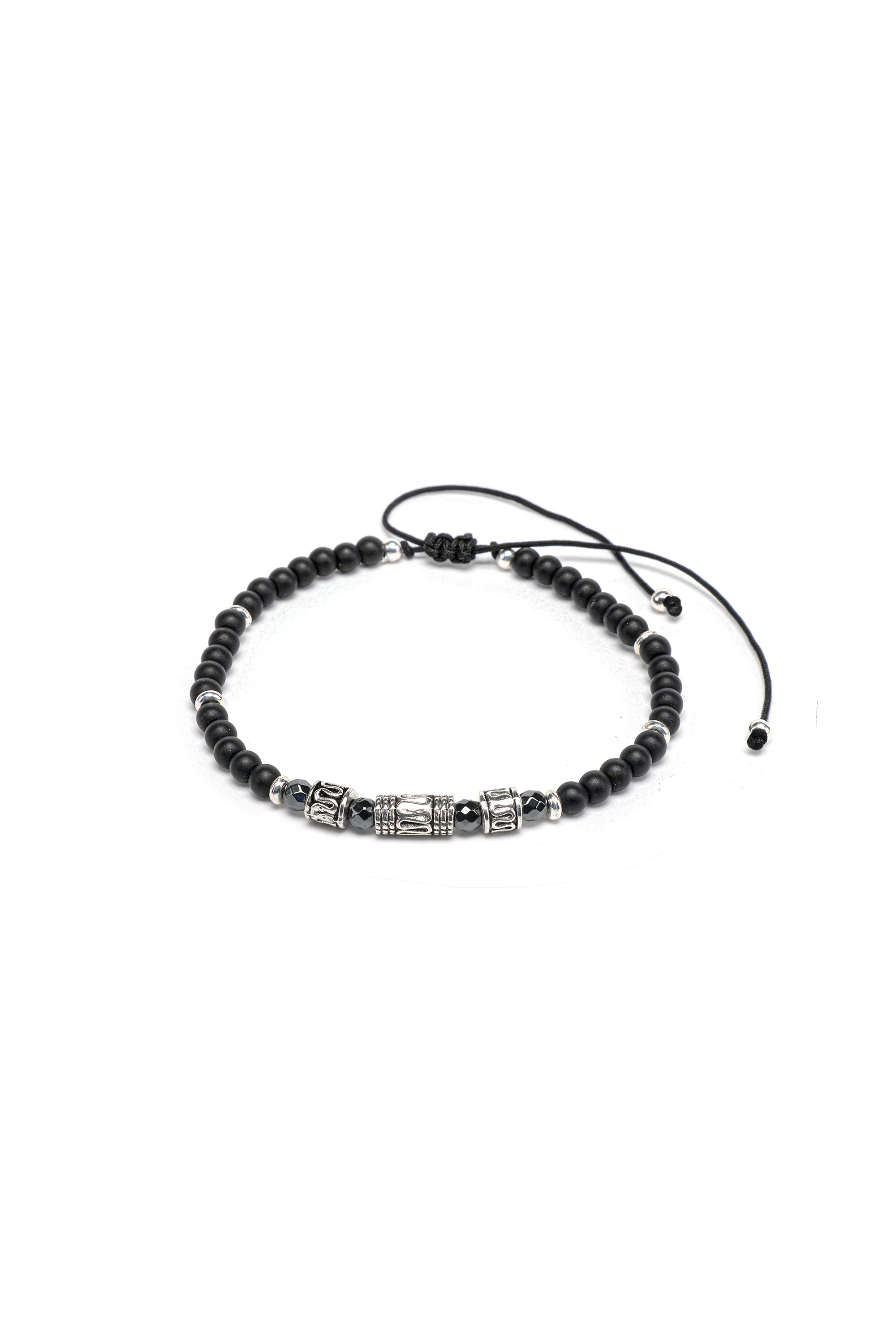 Bracciale filo con elementi in pietra di onice, di ematite e placcati in argento. Chiusura regolabile. Lavorazione artigianale.