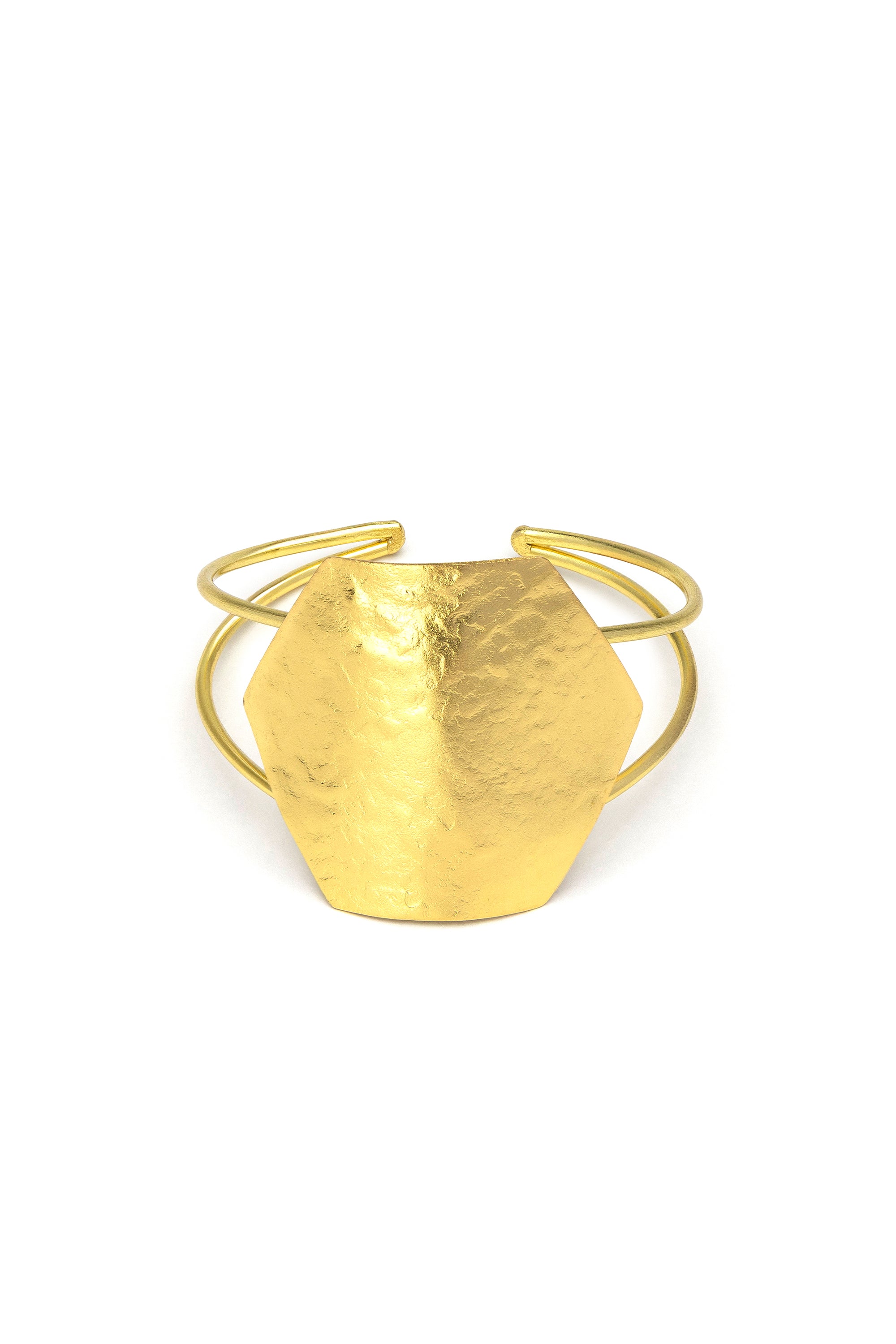 Bracciale semi rigido a fascia caratterizzato da un elemento esagonale centrale dalla texture satinata e da due linee che avvolgono il braccio con eleganza. Il design, semplice ma d'impatto, dona un effetto ricercato ad ogni look. Ideale da abbinare agli "Orecchini 2 Semicerchi". Lunghezza esagono 5 cm. Modello regolabile. Ottone riciclato. Handmade. Nickel tested.